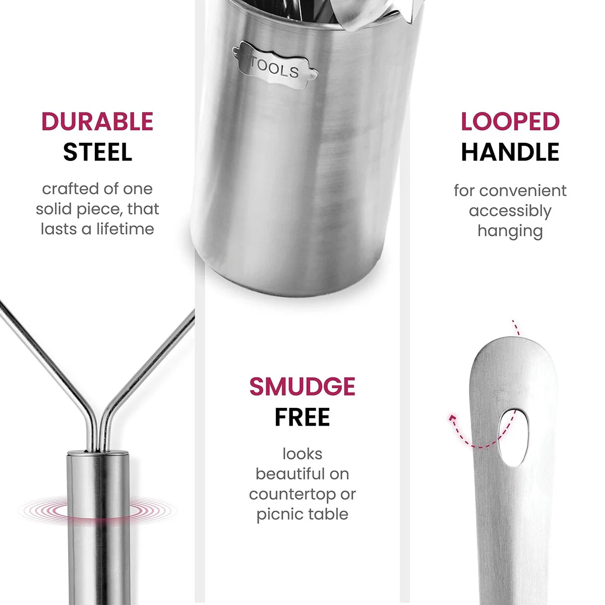 - SAVE ON THE SPACE - Attractive, sturdy holder keeps all utensils handy and organized. All utensils but the tongs have a loophole to keep them together in drawer or to hang anyplace.