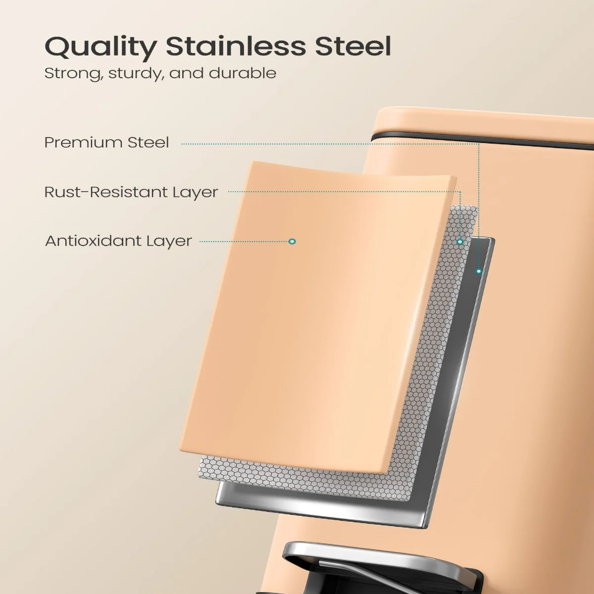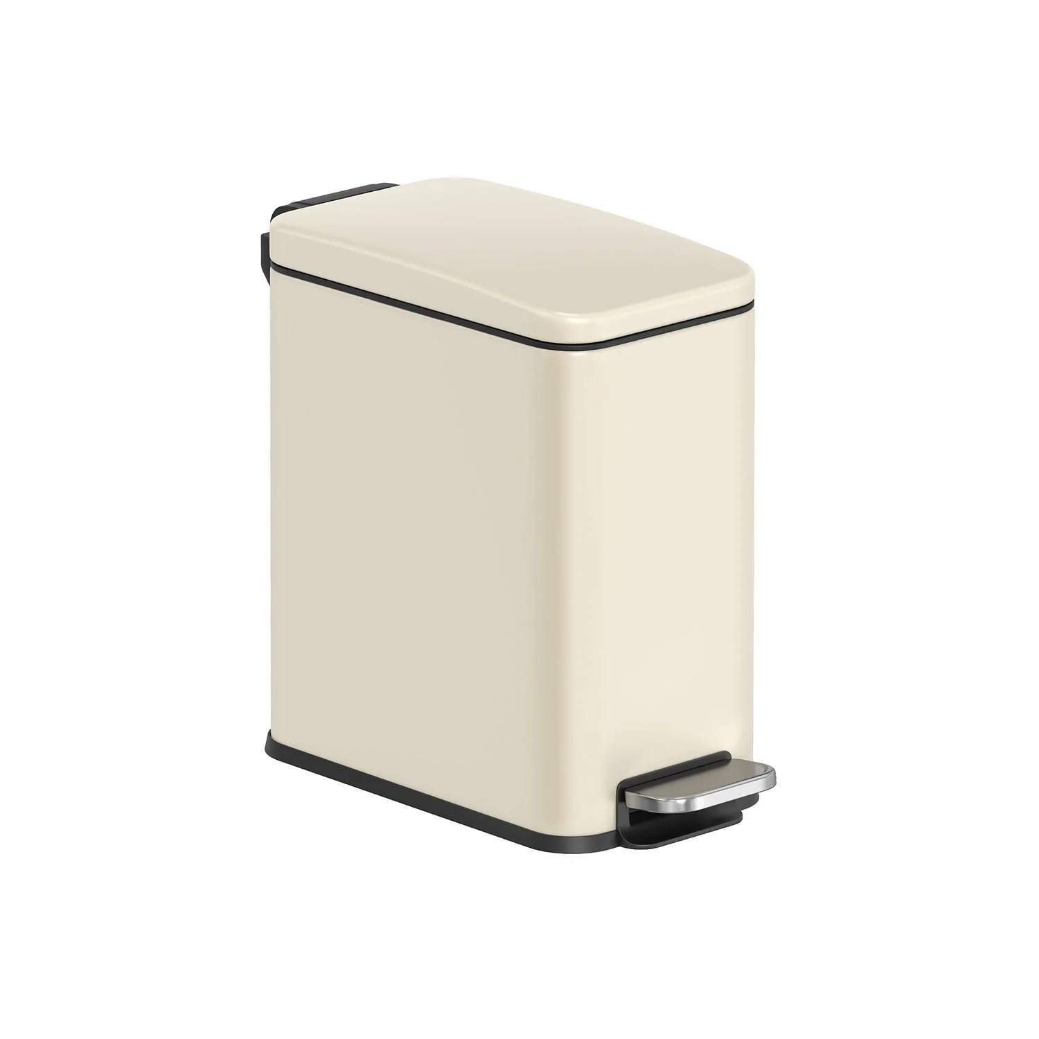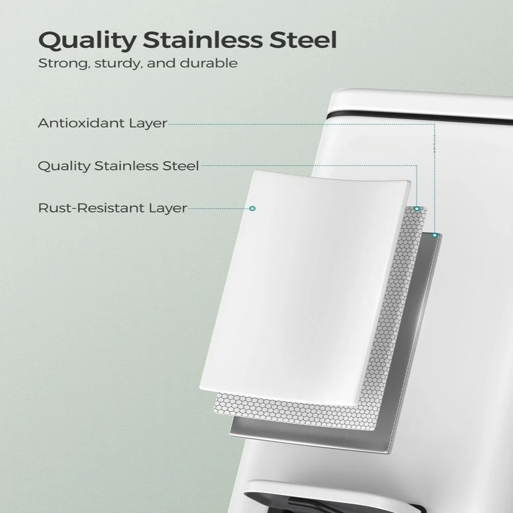 Designed to maximize functionality in compact areas, this bathroom trash can features a sleek, space-saving profile in multiple color options including Cloud White, Peach Fuzz, Silver, Sand Beige and Black. Available in 1.3 and 2.6-gallon sizes, it fits seamlessly into tight corners without sacrificing capacity. Constructed with a stainless steel outer bin, a removable PP plastic inner bucket, and a sturdy ABS base, this unit is ideal for humid environments thanks to its moisture-resistant design and tightly sealed lid. The soft-close mechanism ensures quiet use, while the stay-open function makes waste disposal easier during extended tasks. A built-in pedal enables hands-free operation, and the removable inner bucket with integrated handles simplifies cleaning and emptying. A rear handle also allows for effortless repositioning. Includes one bathroom trash can.