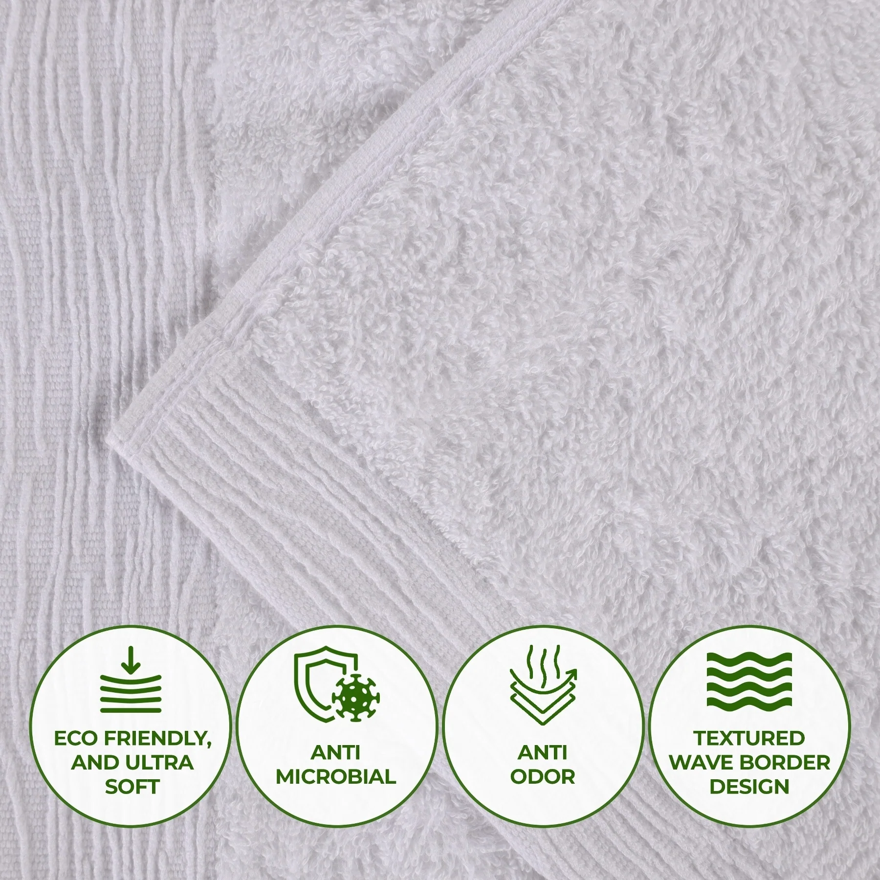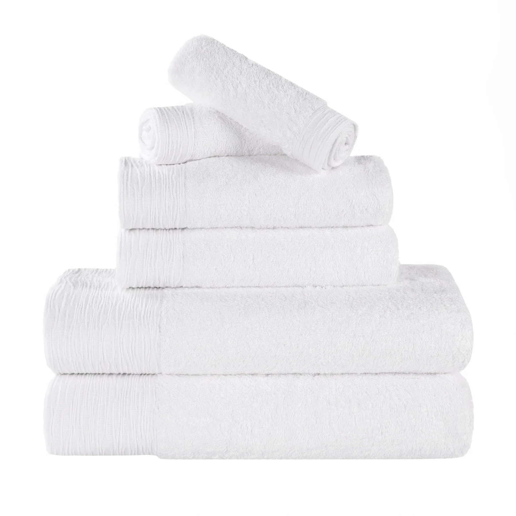 • Set includes: Two (2) Face Towels/ Washcloths, Two (2) Hand Towels, Two (2) Bath Towels