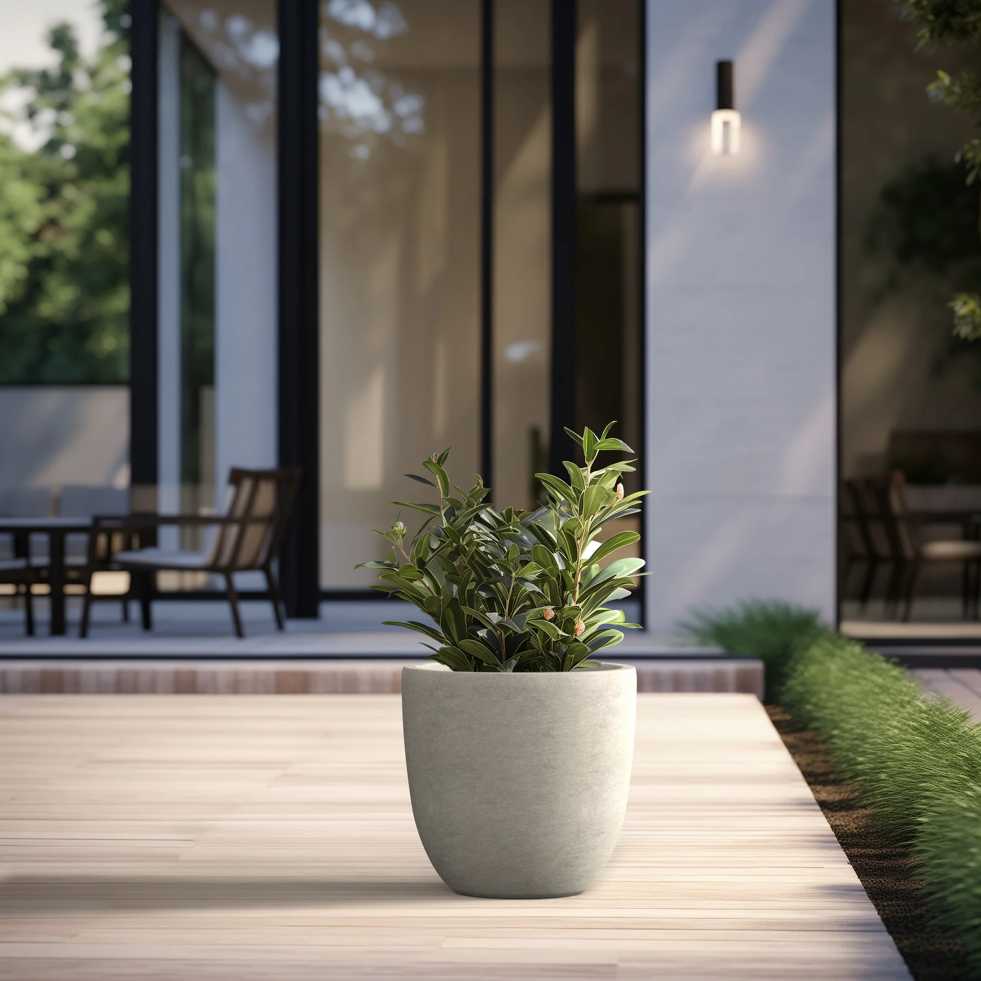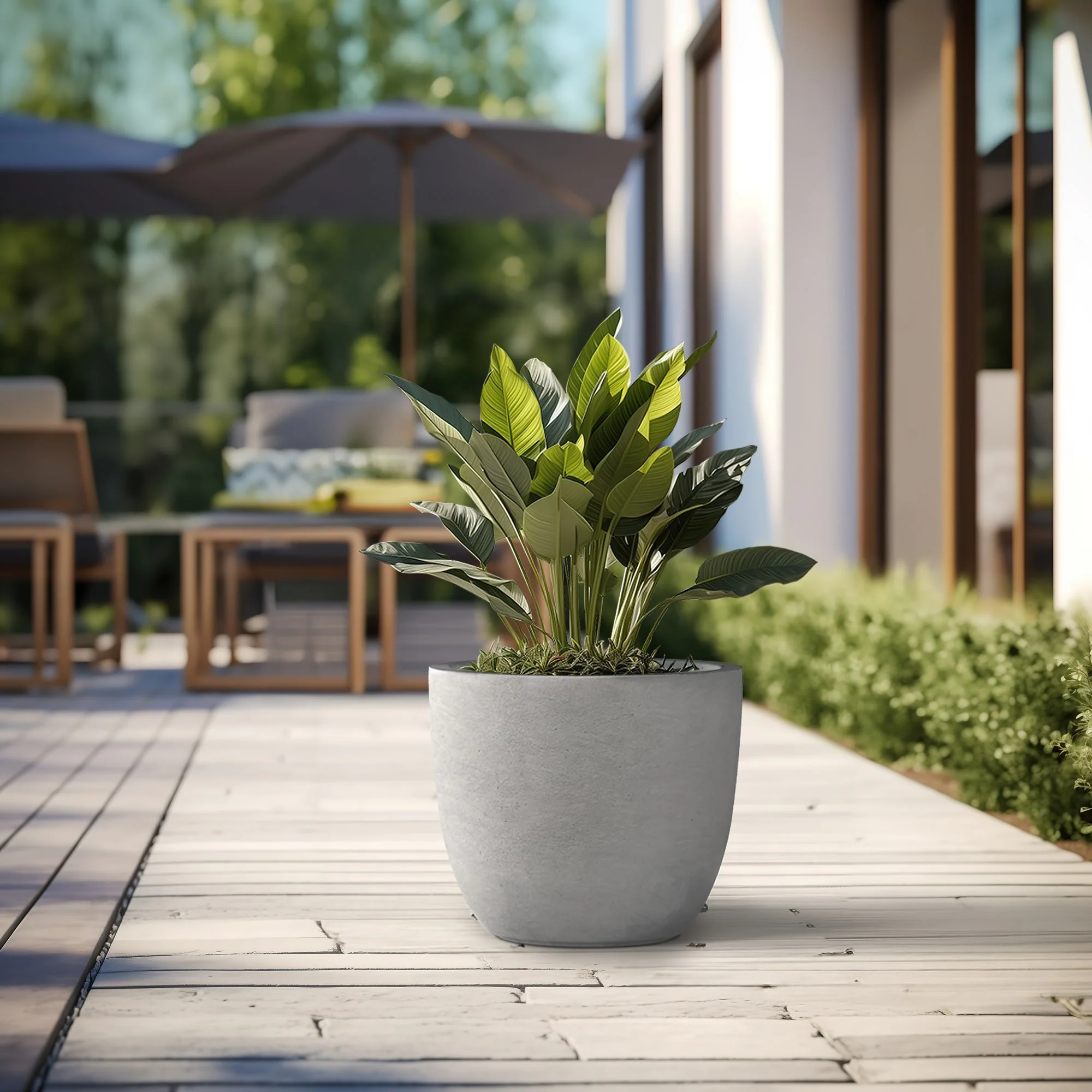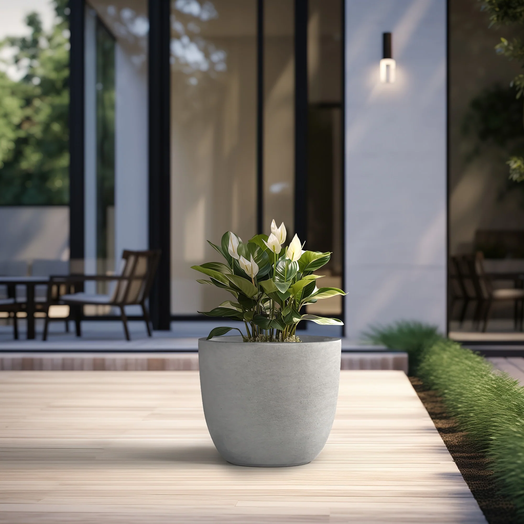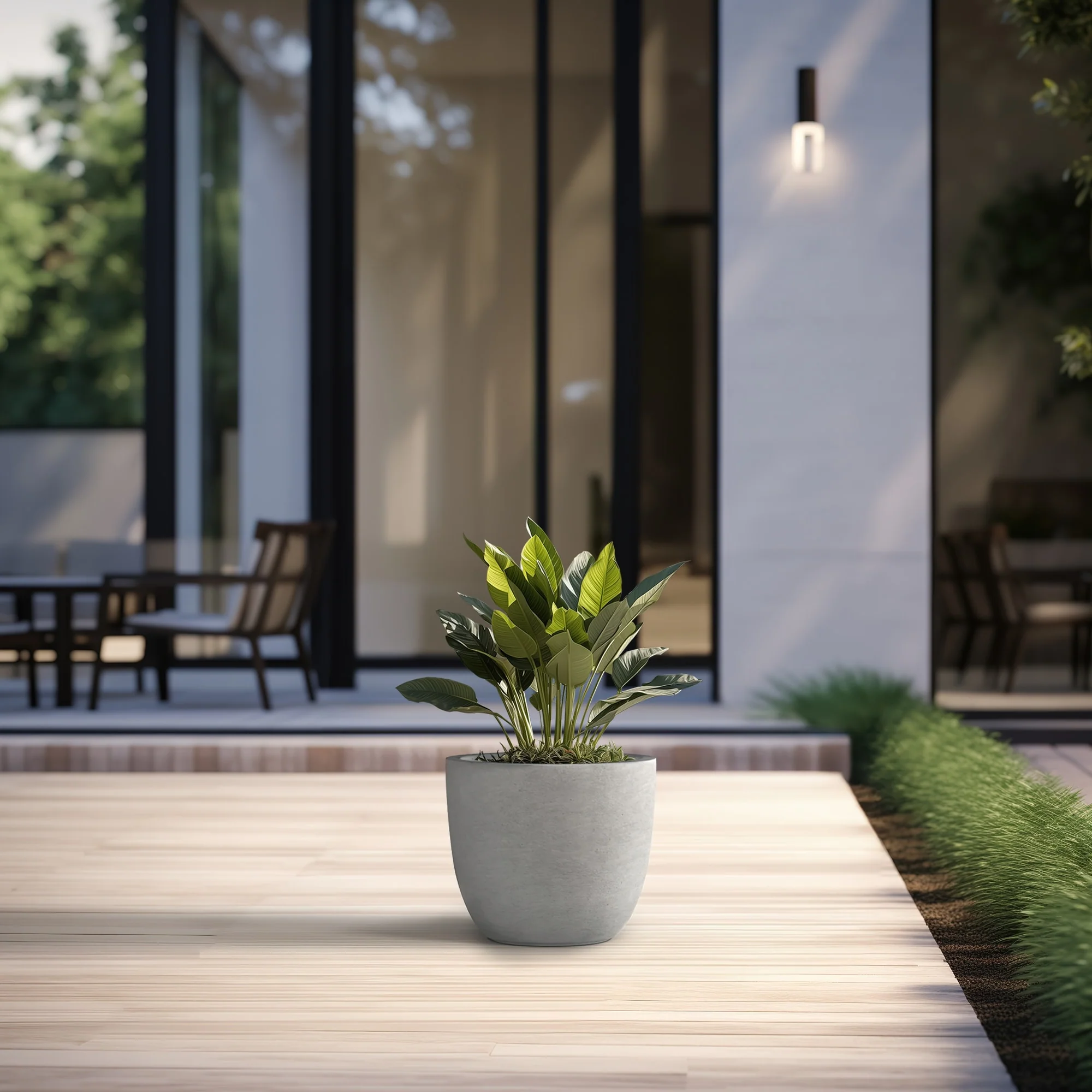 Unveil a sanctuary of green with our Durx-litecrete planters, where every piece is a blend of art and utility. These elegant planters boast a sophisticated concrete finish with visible pores, a testament to their authentic, contemporary design. Their weight is a pleasant surprise, substantial in appearance yet light enough to grace both indoor and outdoor settings. The smooth texture stands in stark contrast to the traditional rough concrete, making these planters a perfect match for the modern North American home. Spacious enough to house a diverse plant life, they sit beautifully on an apartment balcony or a vast backyard patio, infusing harmony and style with their versatile concrete finish.