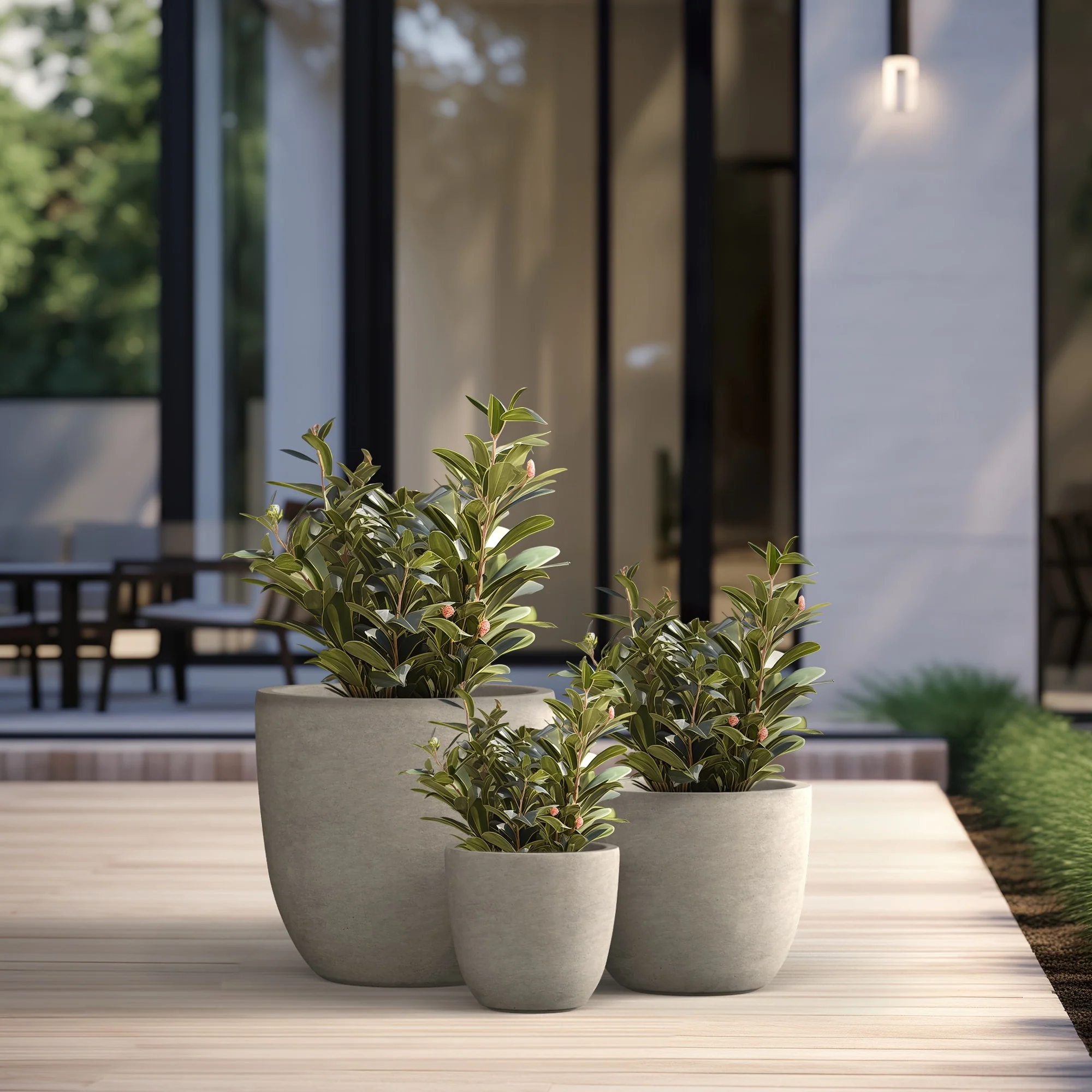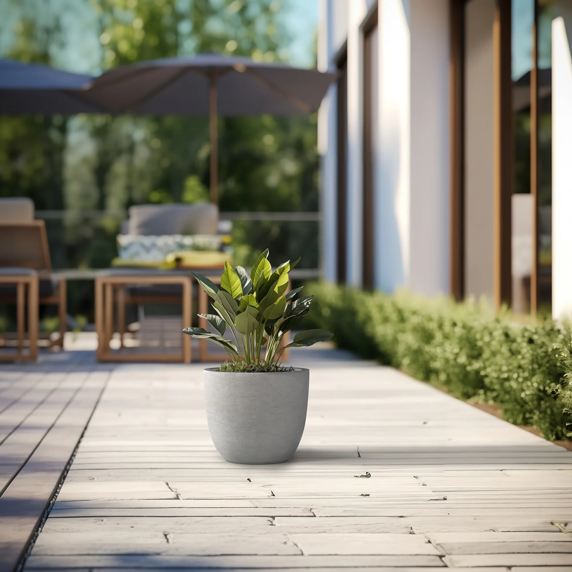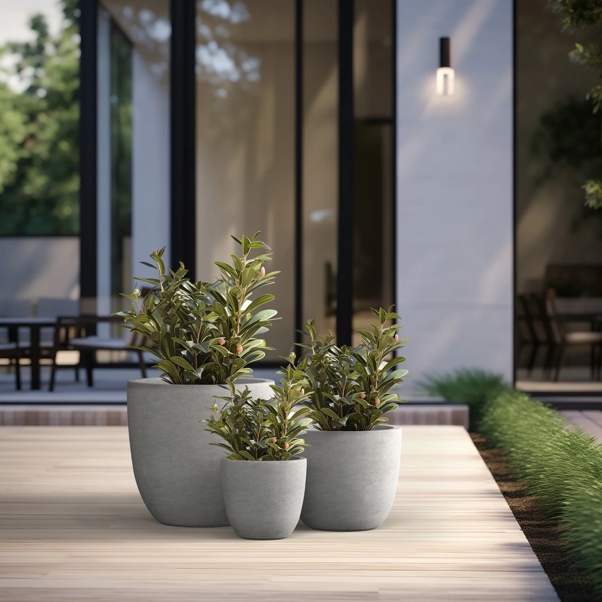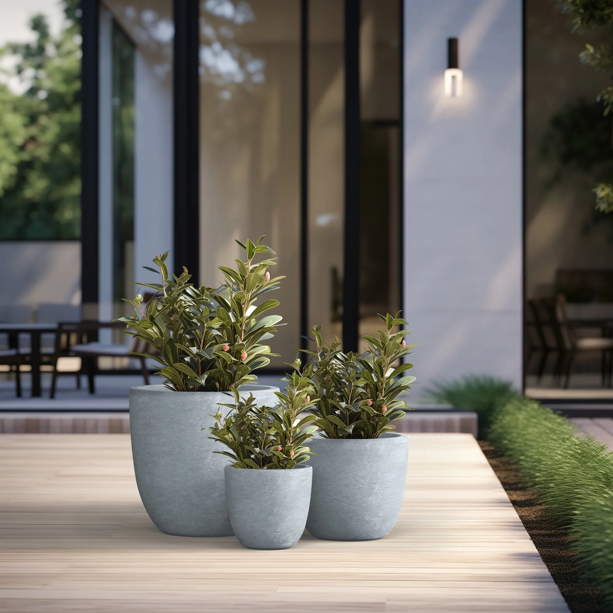 Unveil a sanctuary of green with our Durx-litecrete planters, where every piece is a blend of art and utility. These elegant planters boast a sophisticated concrete finish with visible pores, a testament to their authentic, contemporary design. Their weight is a pleasant surprise, substantial in appearance yet light enough to grace both indoor and outdoor settings. The smooth texture stands in stark contrast to the traditional rough concrete, making these planters a perfect match for the modern North American home. Spacious enough to house a diverse plant life, they sit beautifully on an apartment balcony or a vast backyard patio, infusing harmony and style with their versatile concrete finish.