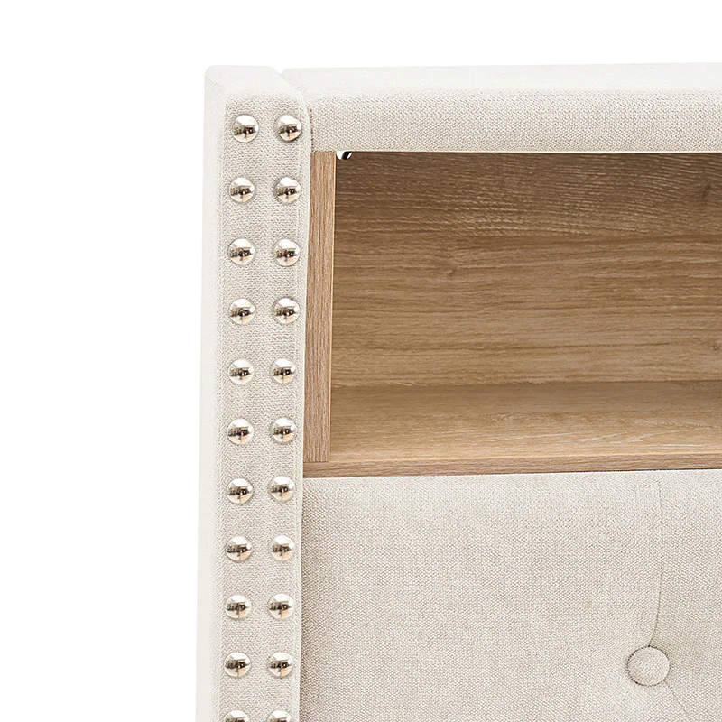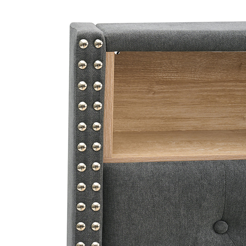 This bed features a warm night light at the headboard, providing gentle illumination for a cozy atmosphere. The headboard also includes convenient storage compartments, suitable for keeping essentials within easy reach. Its design boasts a chic, tufted appearance, adding a touch of elegance to any bedroom decor. The bed is designed with a high headboard, offering added support and a stylish focal point. Additionally, it comes with a built-in power strip, ensuring easy access to power outlets for charging devices or plugging in bedside lamps. Combining functionality with modern design, this bed is both practical and visually appealing, making it an excellent choice for any contemporary living space.
