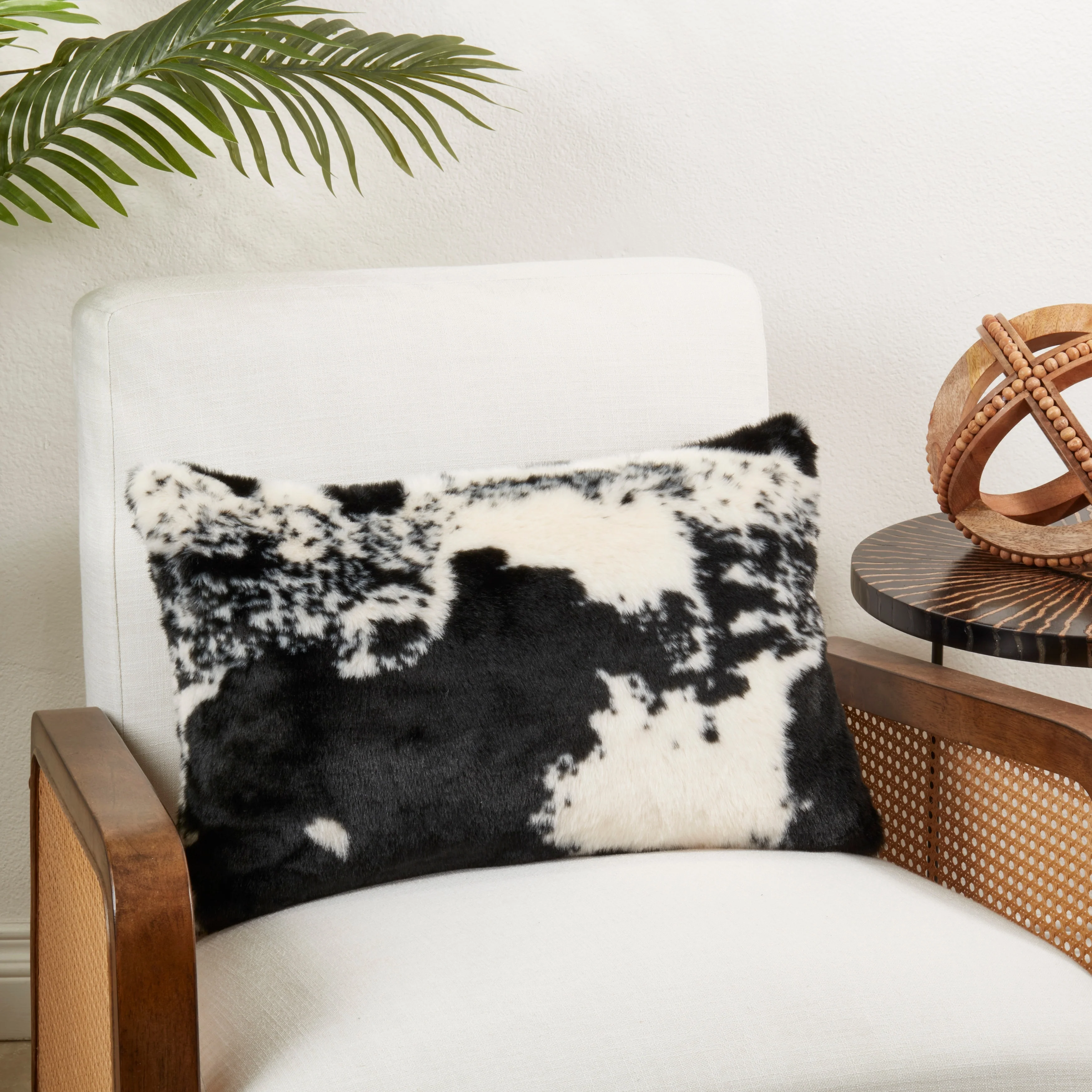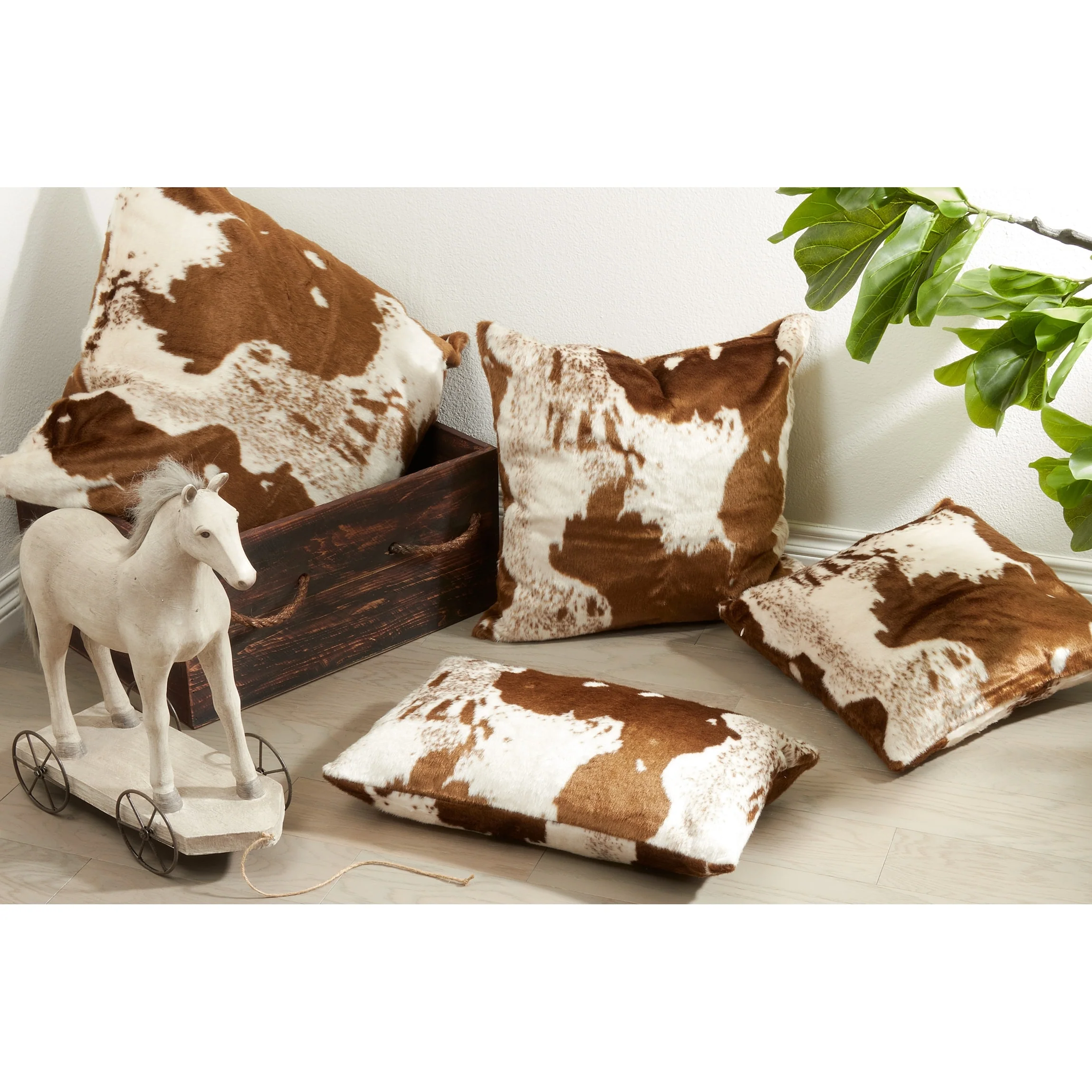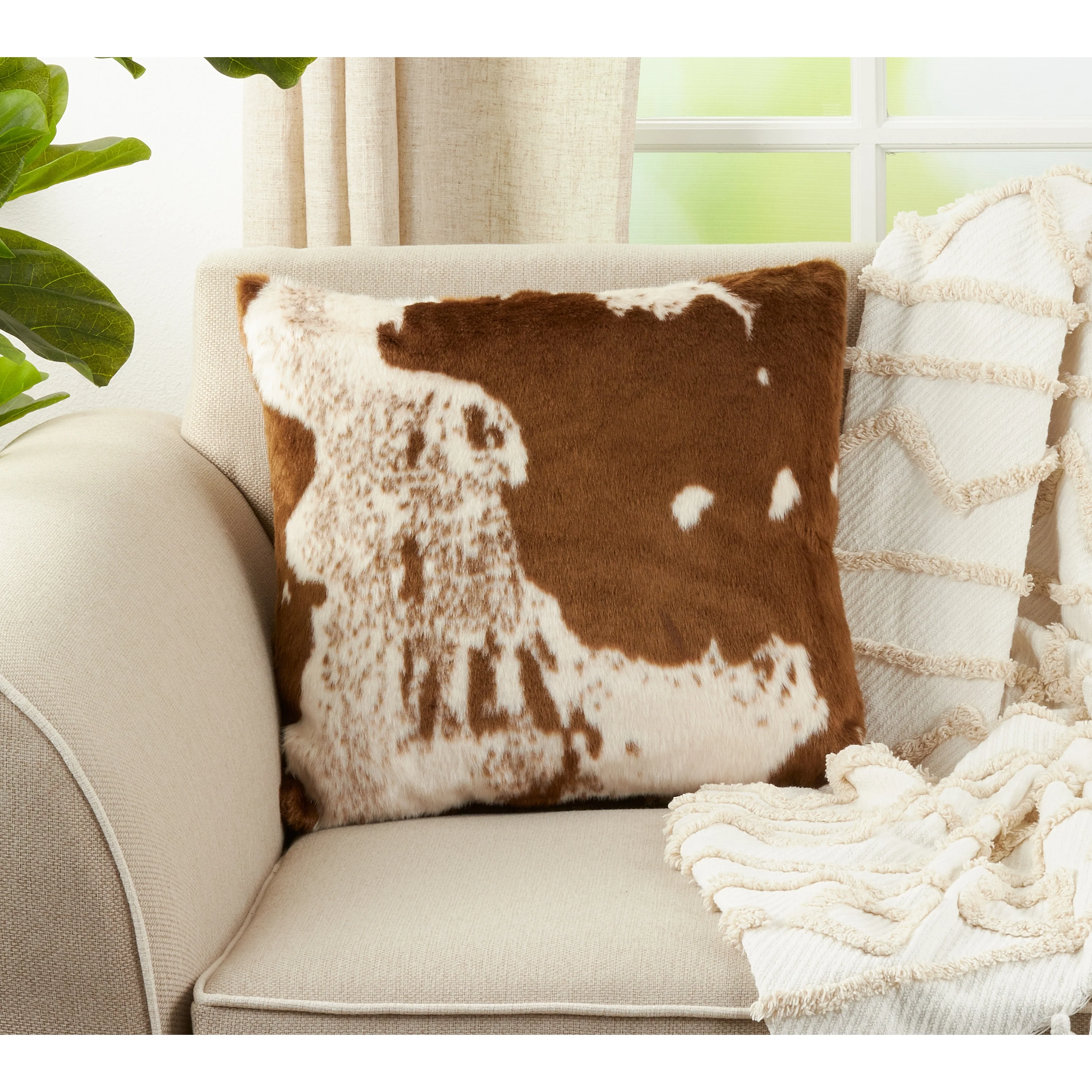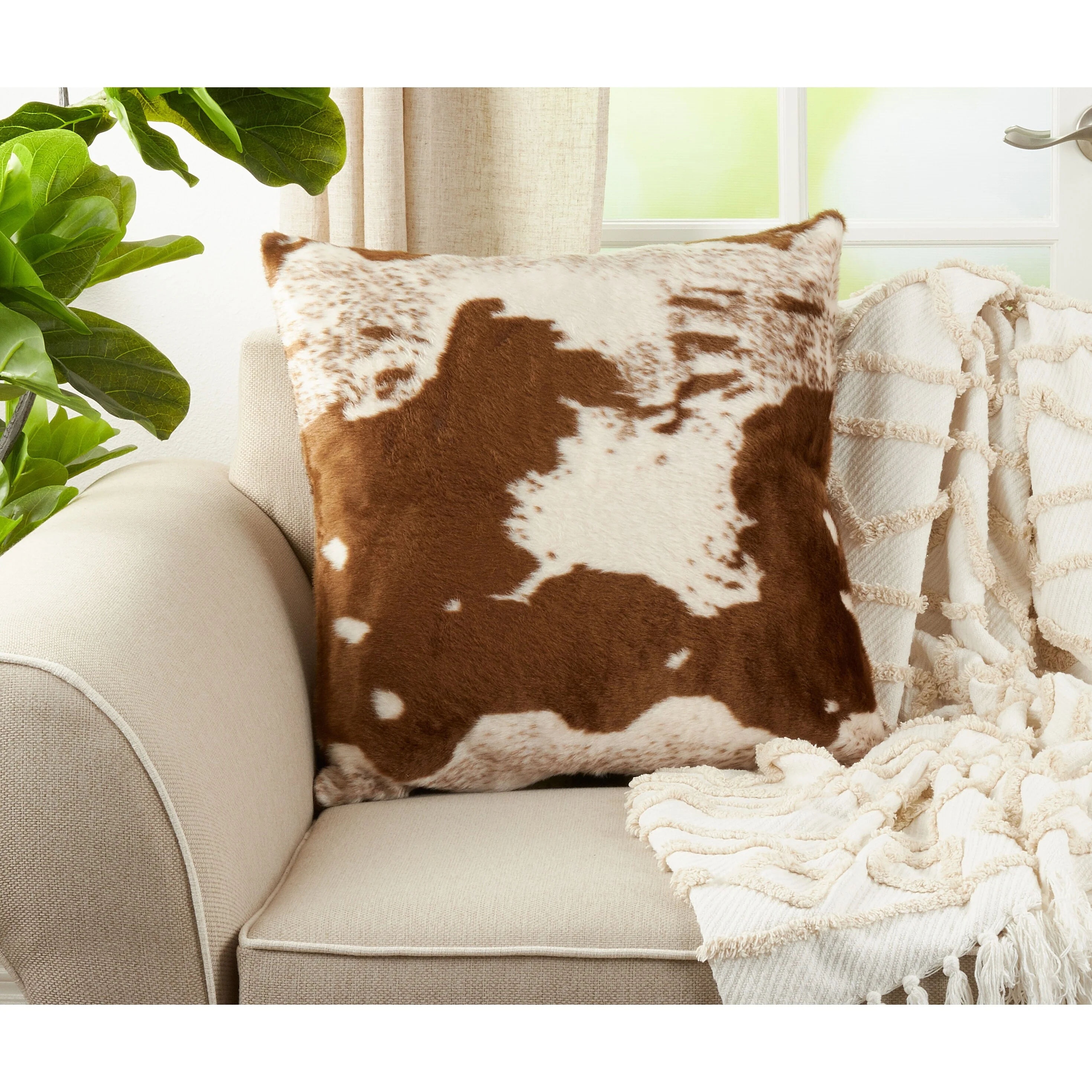 Indulge in a cozy lodge ambiance with this faux-cowhide throw pillow. The brown-and-white animal-themed finish complements warm-colored furnishings, and the hidden zipper closure doesn't interfere with the design. This reversible throw pillow has a 100-percent polyester exterior that withstands daily use.