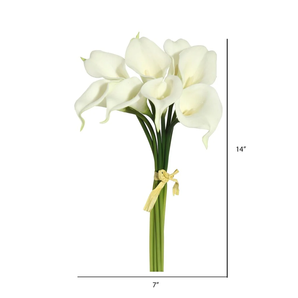 Vickerman 14'' Artificial White Calla Lily Bundle. Enhance your natural indoor decor with Vickerman's beautiful 14-inch Faux White Calla Lily Bundle. These realistic artificial flowers feature eight white faux flower blooms on green stems, adding elegance to any setting. Perfect for indoor use, these maintenance-free faux flowers are easy to keep looking fresh with just a quick wipe of a dry cloth. Arrange the faux lilies in any decorative container for a unique floral arrangement that adds a touch of nature to your home or office decor. This artificial White Lily creates the appearance of live flowers with highly detailed flowers and leaves on multiple stems and precise details to create a realistic look. Replicate a real Lily bundle with this truly lifelike item. This artificial White Lily creates the appearance of live flowers with highly detailed flowers and leaves on multiple stems and precise details to create a realistic look. Vickerman has been an industry leader since 1940. Our expert designers focus on every detail to create artificial plants that look more natural.
