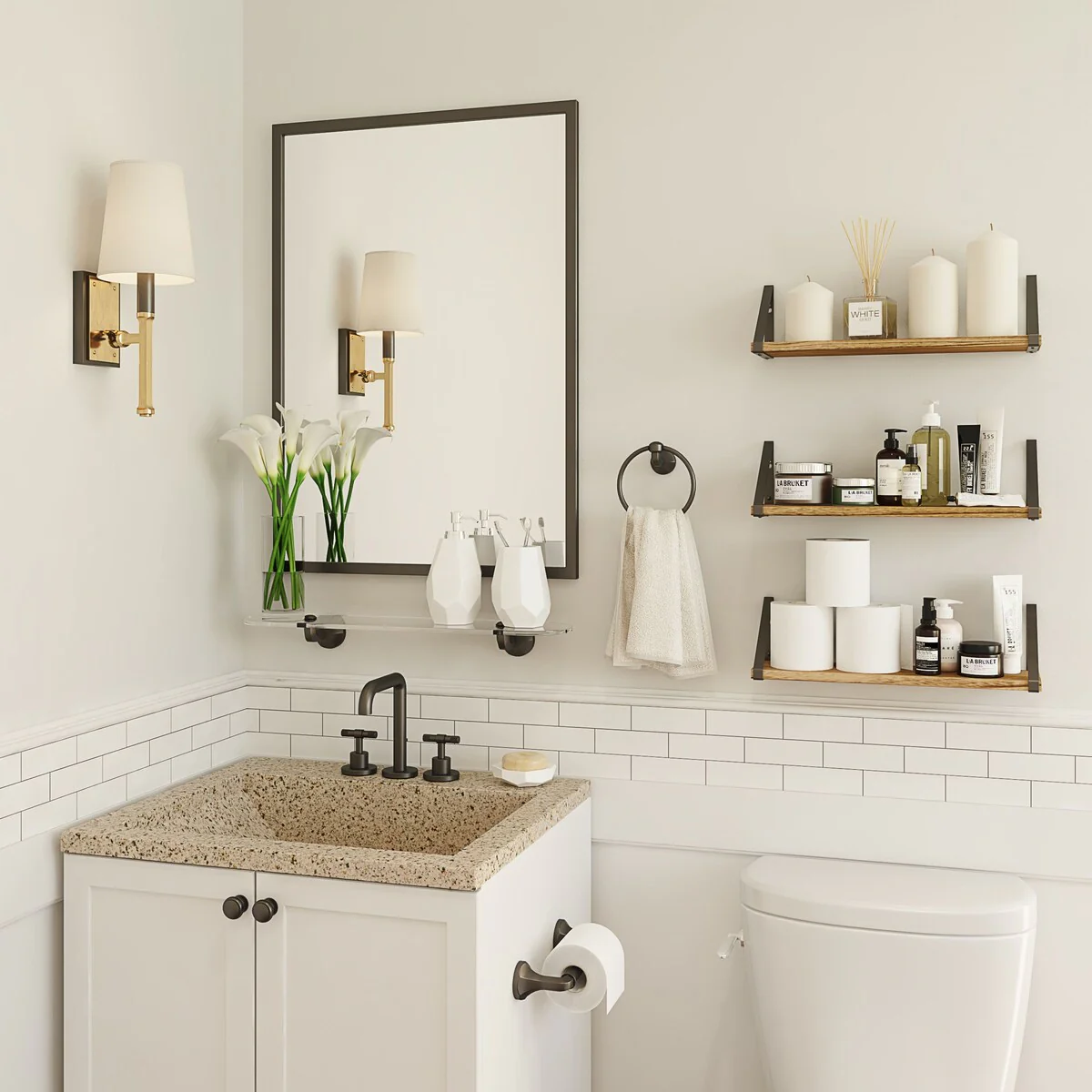 • Rustic Wall Decor: Elevate the look of your bathroom with these chic floating shelves