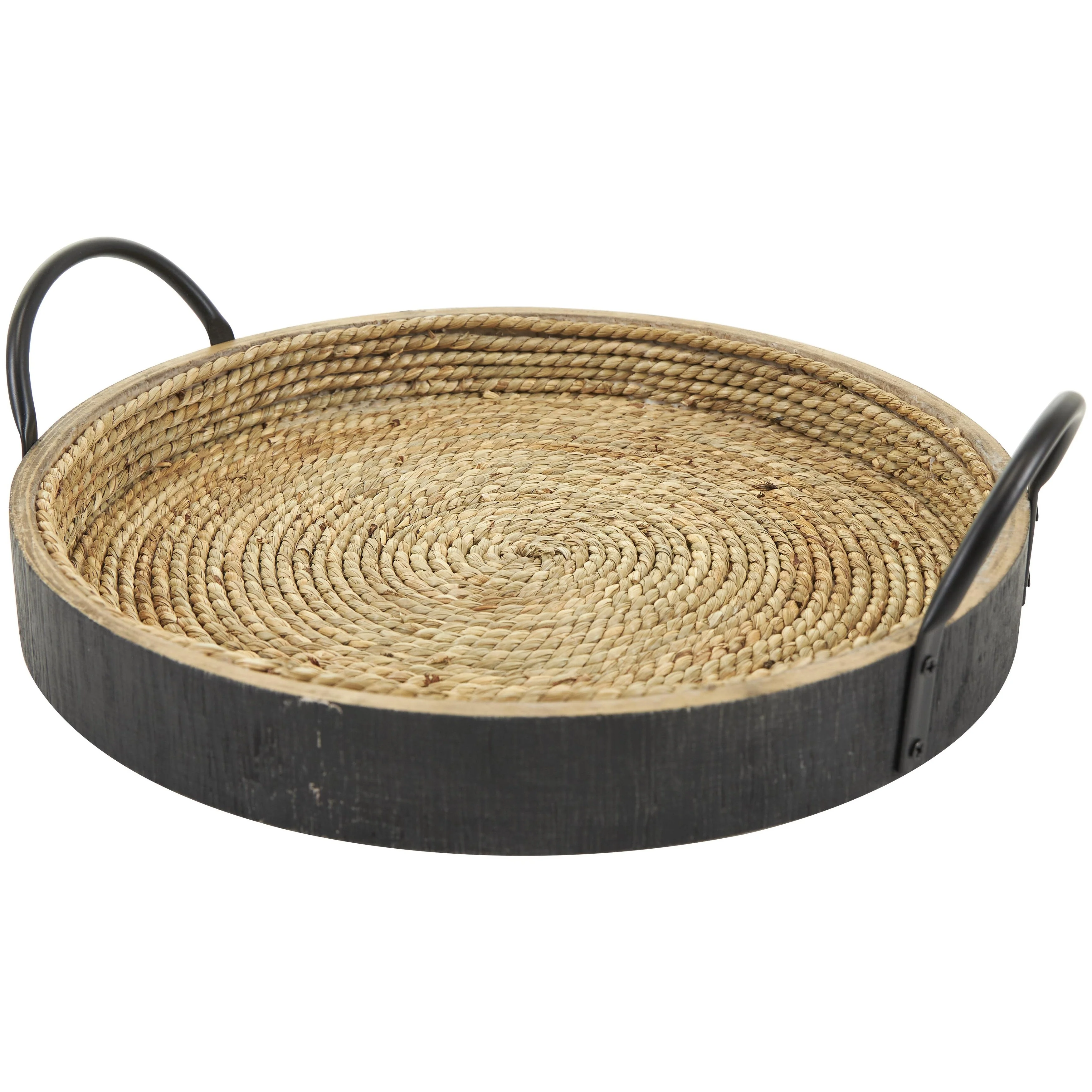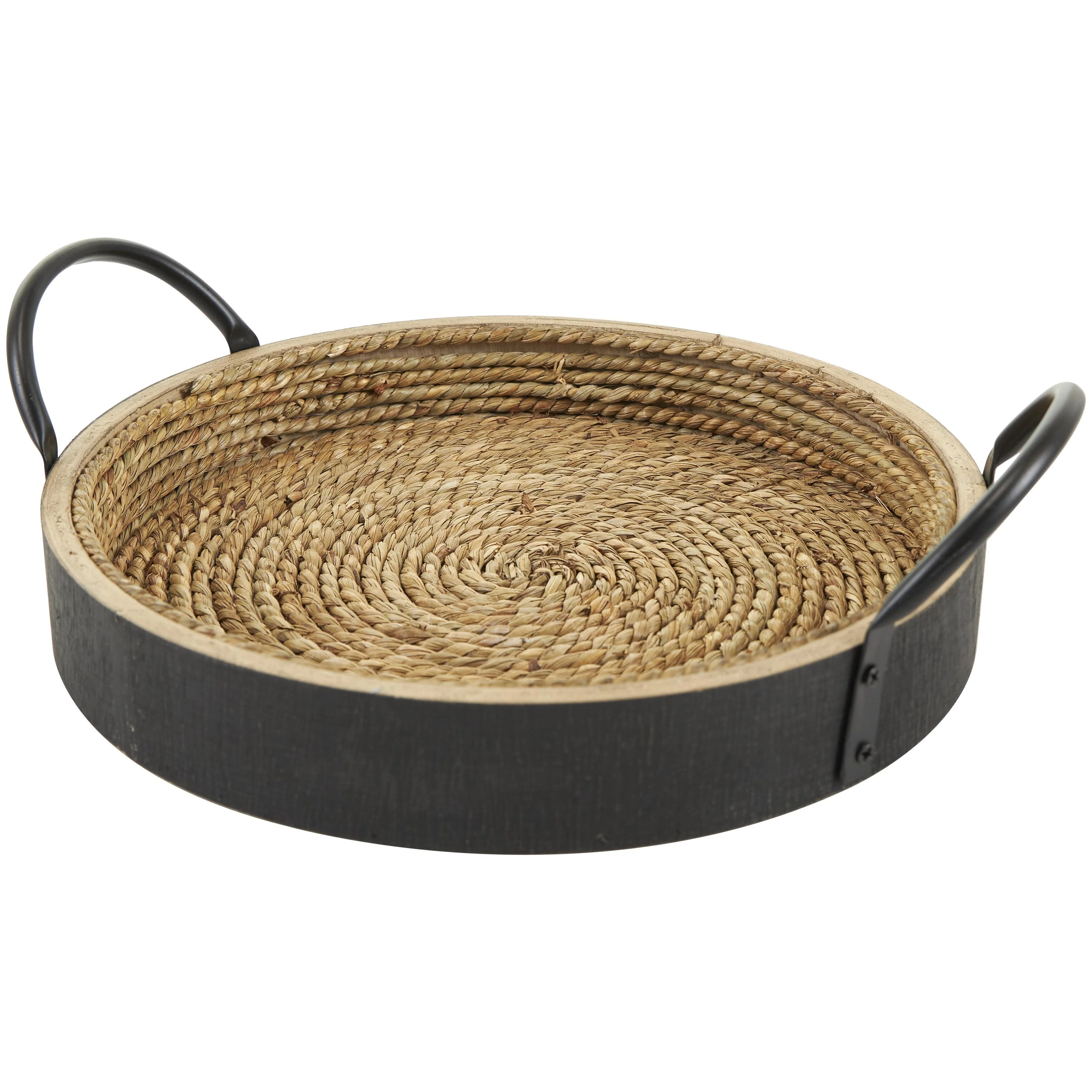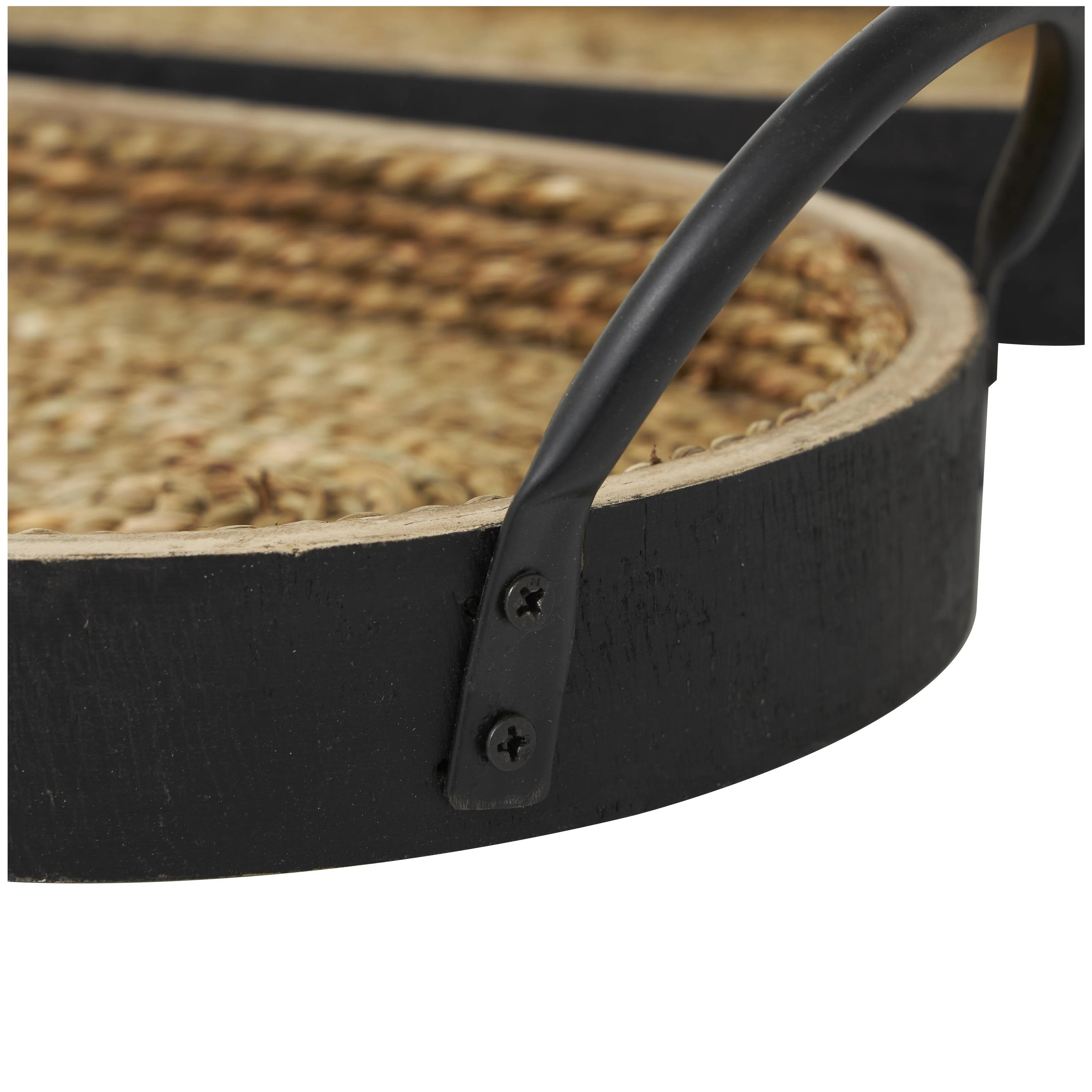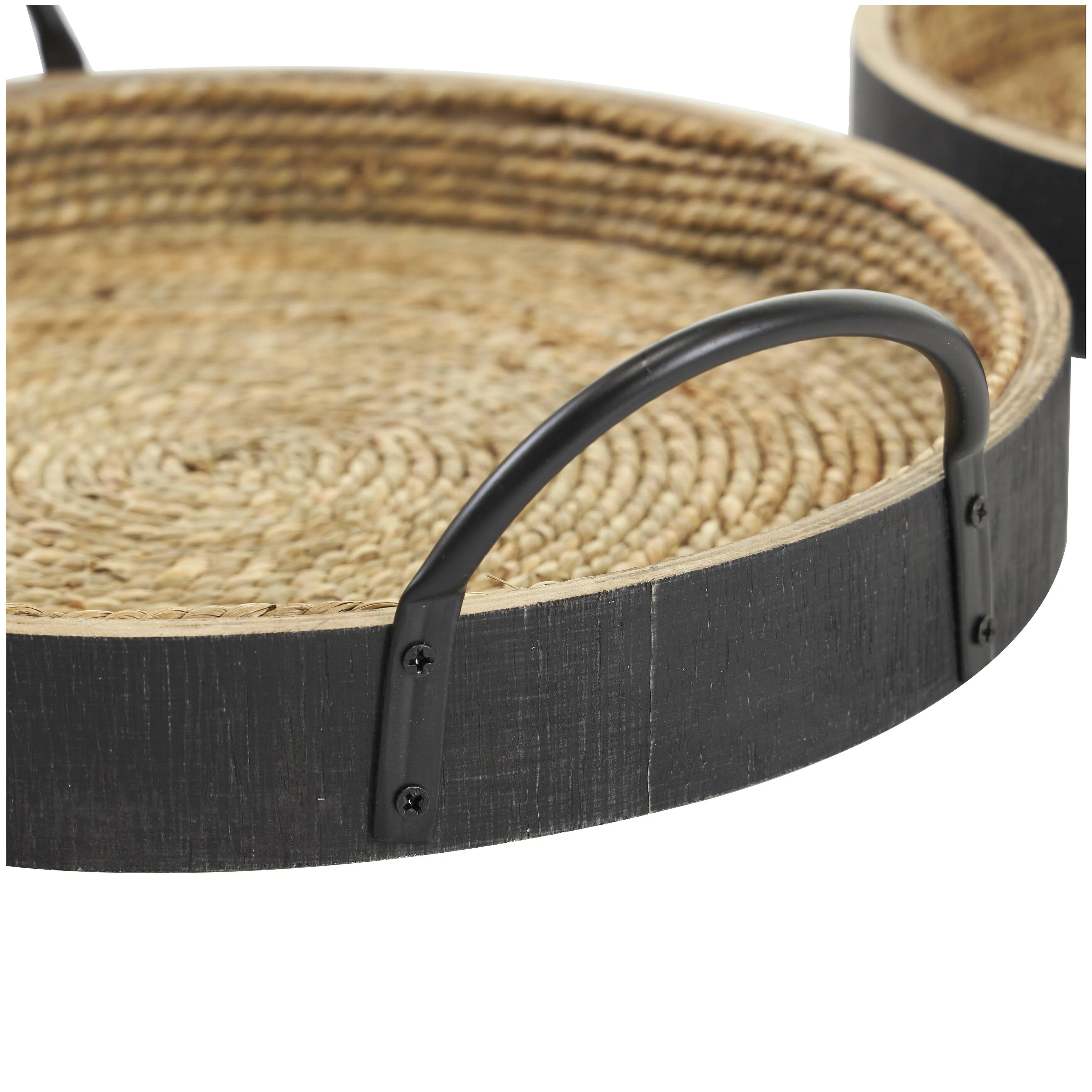 - Set of 2 round trays feature a matte black wood exterior with polished black handles and a natural light brown interior