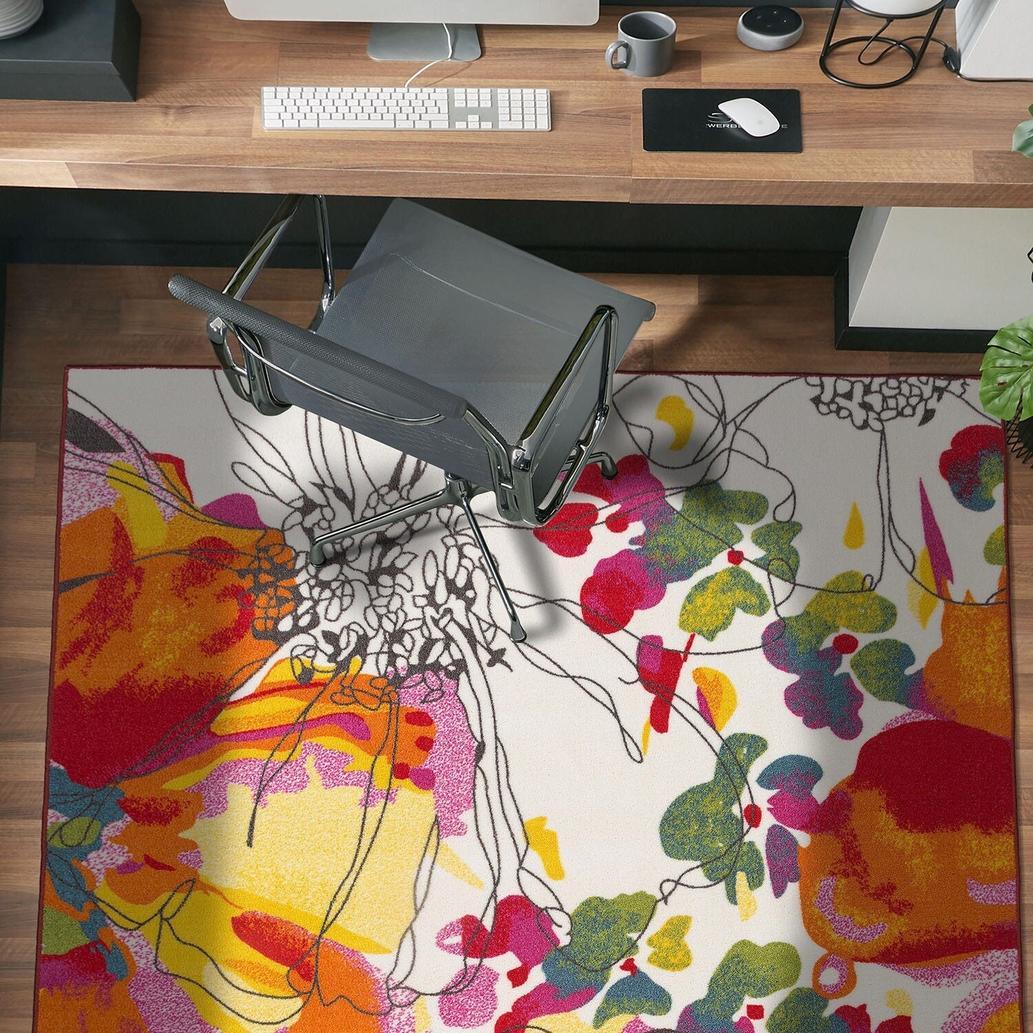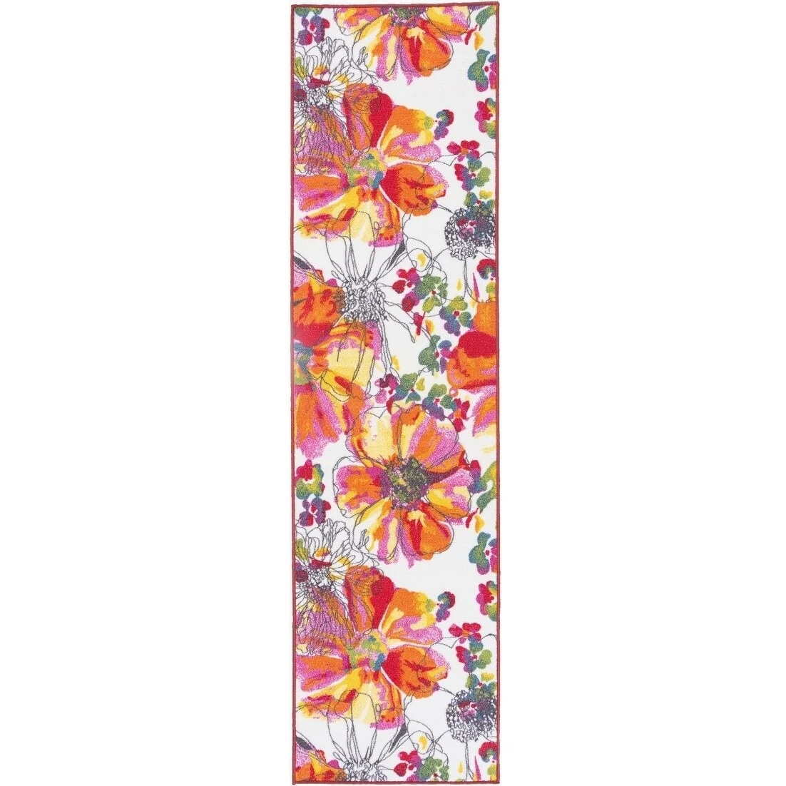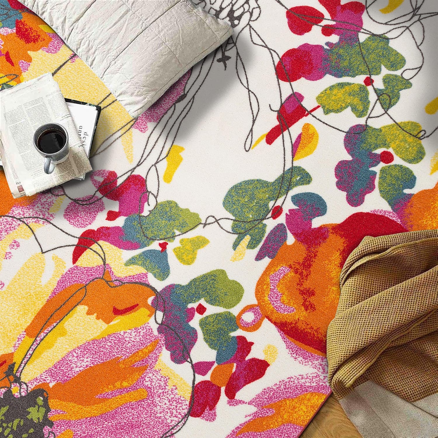 Awaken a sense of fun and vivacity in your home with this OSTI abstract floral area rug woven from stain-resistant nylon. A plethora of bright, warm colors grace a white background, enriching your decor with a dose of flower power. The latex, nonslip backing helps prevent this rug from sliding, providing soft, secure floor coverage underfoot.