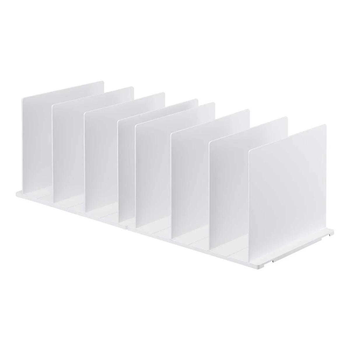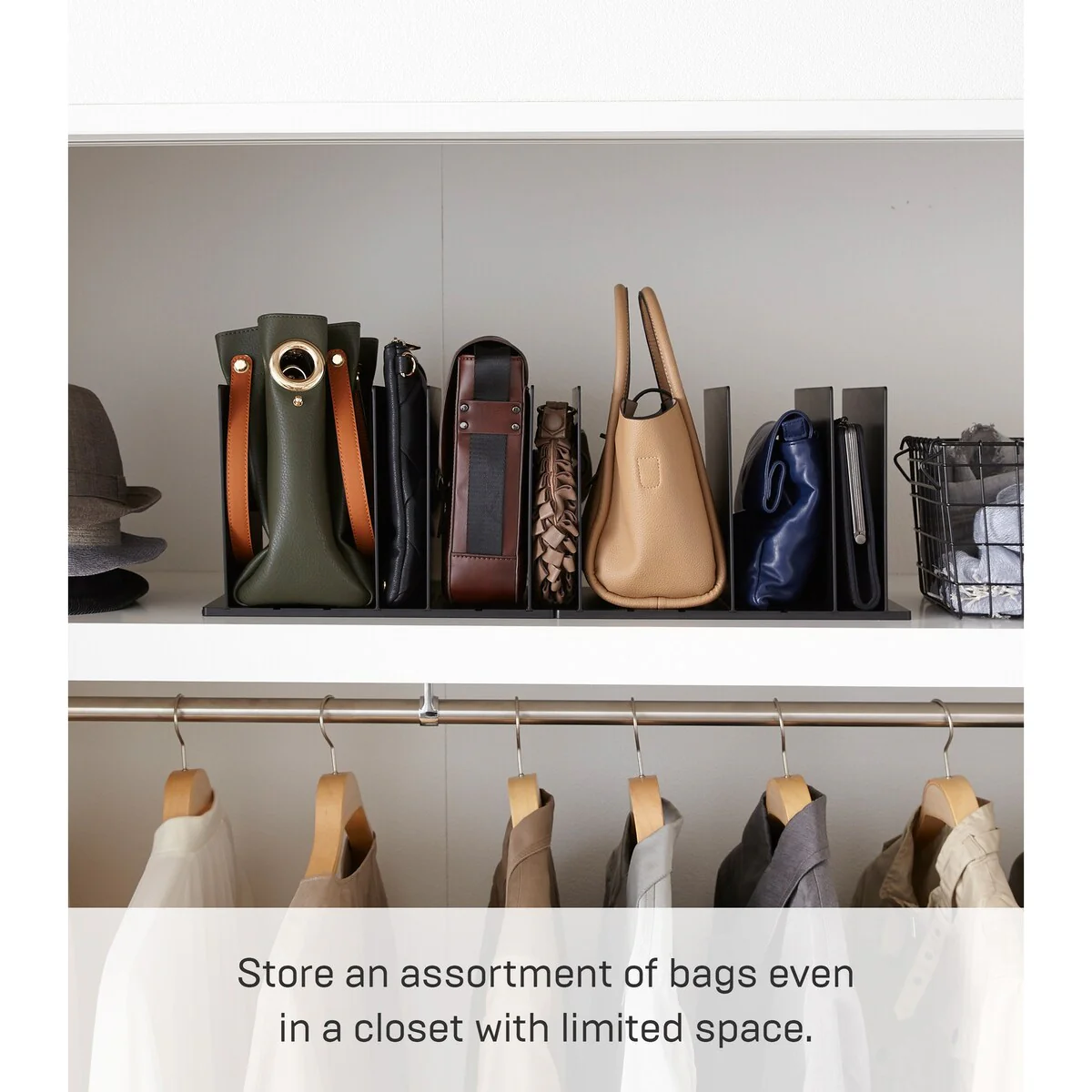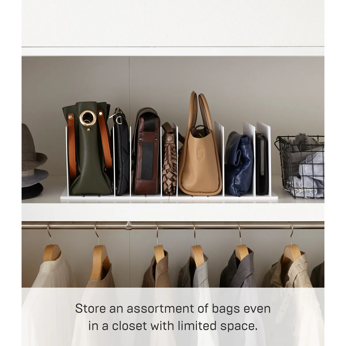 [Keep your purses and bags organized] This interlocking shelf divider is features a foolproof, simple design. Keep your collection sorted and safe from damage, even when space is tight., [Durable, adjustable dividers] The dividers provide support and durability to keep purses and bags upright. Simply insert the divider in the correct space to accommodate the width of each individual bag. It is available in white and black., [Can be broken into two pieces] Not only can the position of the dividers be adjusted to hold bags of different widths upright, the base can also be broken into two to accommodate tighter spaces, and easily reattached again when necessary., [Care instructions] The purse organizer can be cleaned by wiping with a damp cloth and drying immediately.