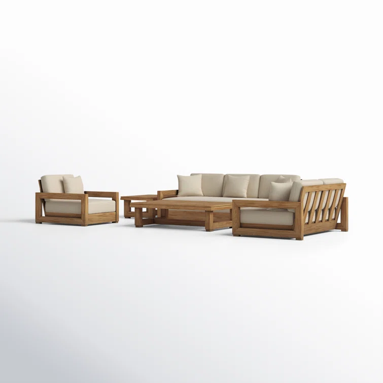 Prep your outdoor space for alfresco dining with this 5-piece conversation set. It's crafted from solid teak wood, and it comes with a sofa, loveseat, armchair, and matching coffee table. We love that this earthy set features a light-colored finish that showcases the natural wood grain. Ready for all-day lounging? The included seat cushions are designed for comfort. Plus, their machine-washable covers make cleaning a breeze.