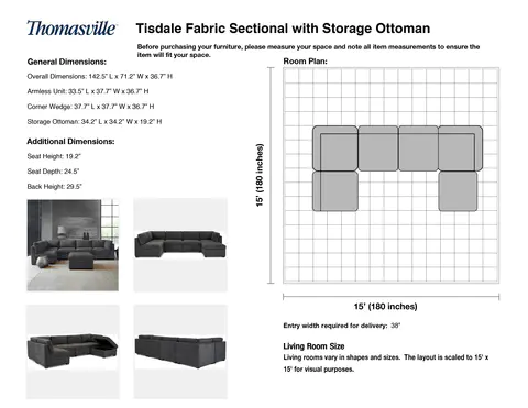 • Storage Ottoman: 34.2” L x 34.2” W x 19.2” H; Weight: 53.5 lbs.