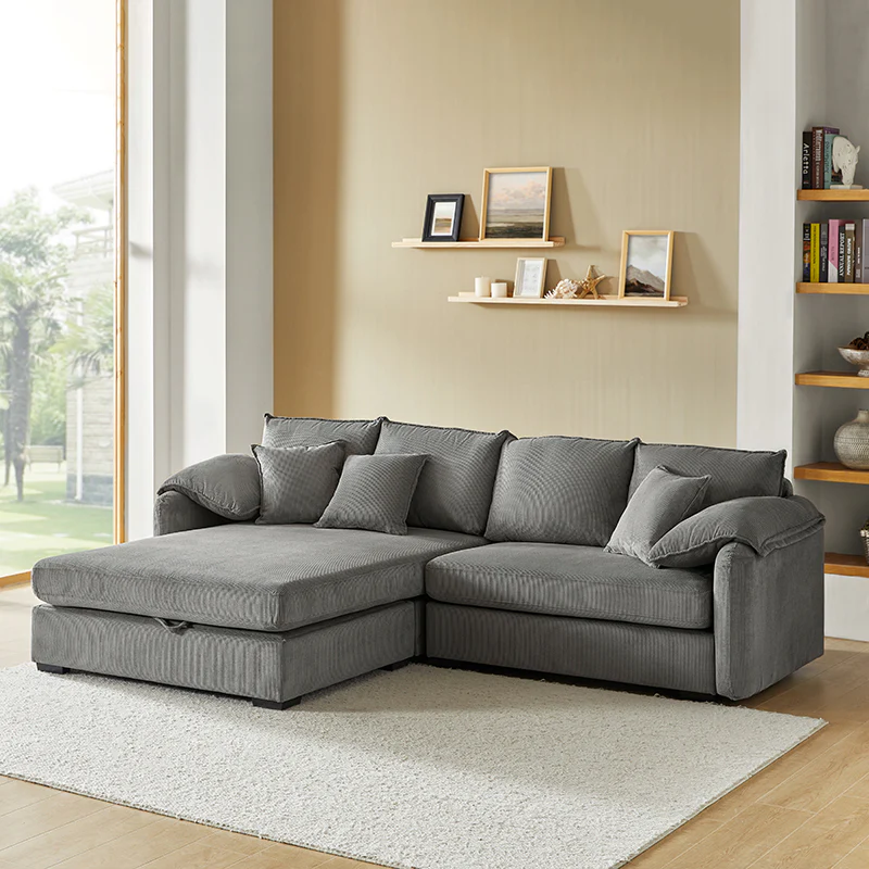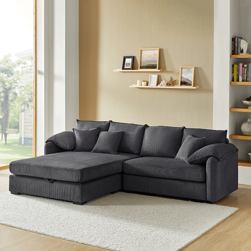 The modern oversized sofa features a sleek and contemporary design with a spacious seating area. Its unique design includes storage compartments beneath the seat cushions, providing a convenient solution for organizing items. The manual operation and pneumatic rods ensure easy handling of the storage mechanism. The deep seat and soft cushion make for a fluffy and cozy seating experience, Covered with high-quality fabric, the cushion adds a stylish touch and is removable for easy cleaning. With its thoughtful design and practical features, this sofa combines functionality with modern aesthetics, making it a versatile and stylish addition to any living space.
