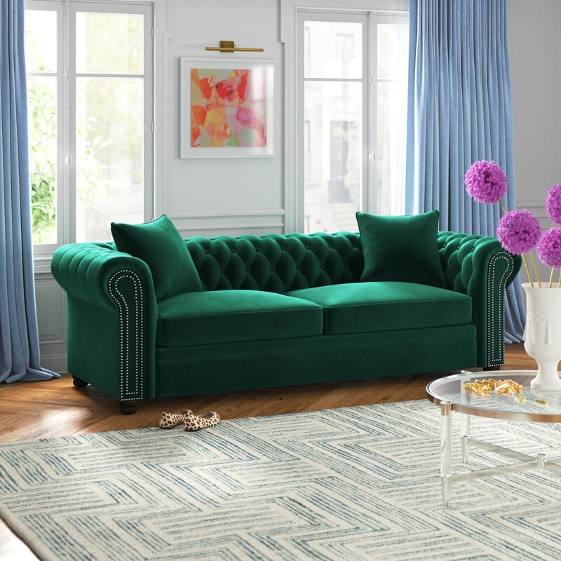 This Chesterfield sofa features nailhead trim and deep button tufting that adds classic glam style to your living room or den. It's made from a blend of solid and engineered wood. and it's built on turned bun feet with an espresso finish. The rolled arms and square back are upholstered in plush velvet in your choice of color. and they're filled with foam for a supported place to sit during movie night. It also has a 95" wide design that seats up to three people. Plus. to keep this armchair looking good. all it needs is a simple spot treatment.