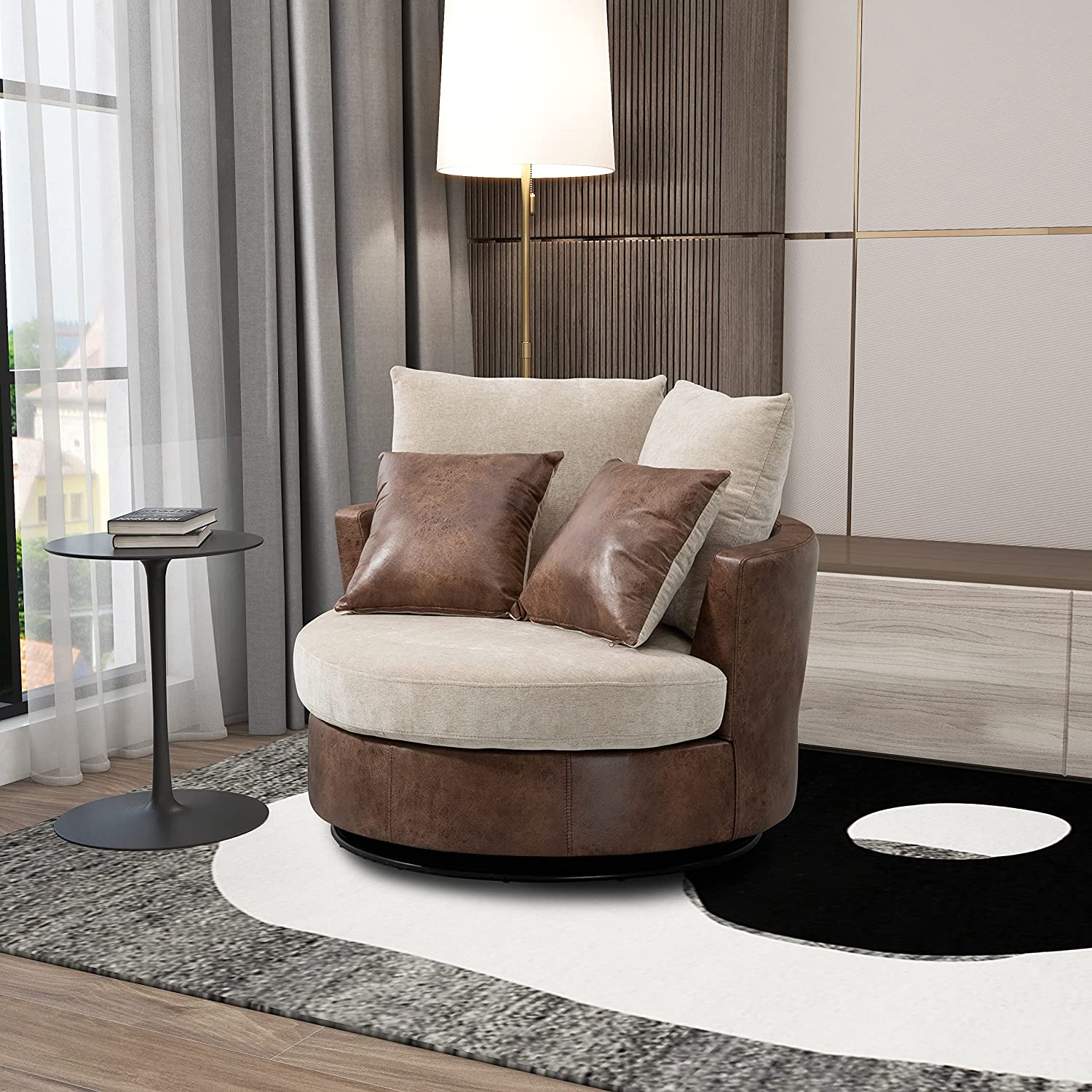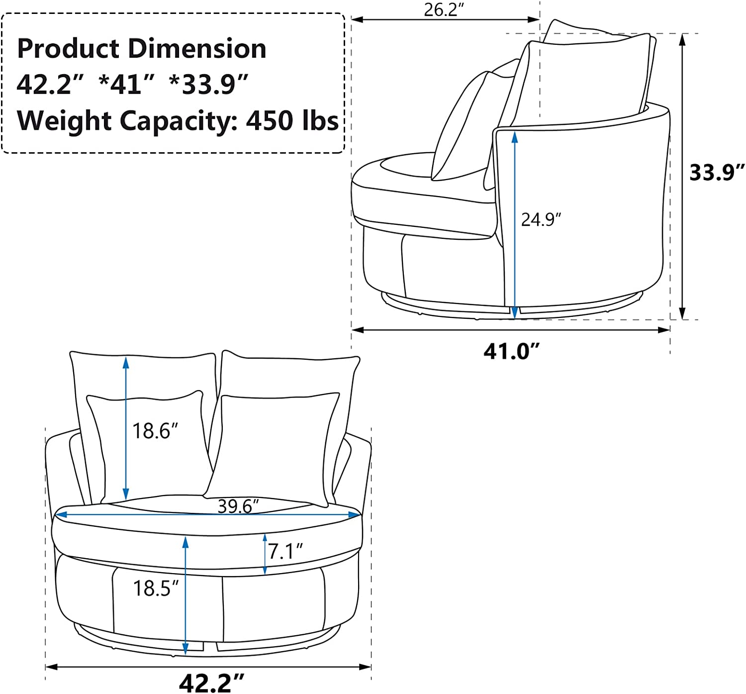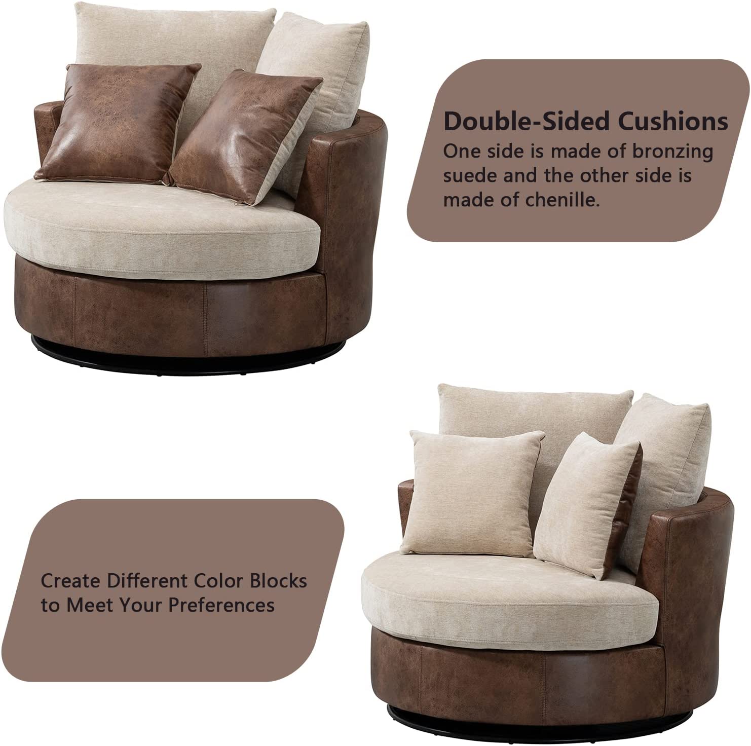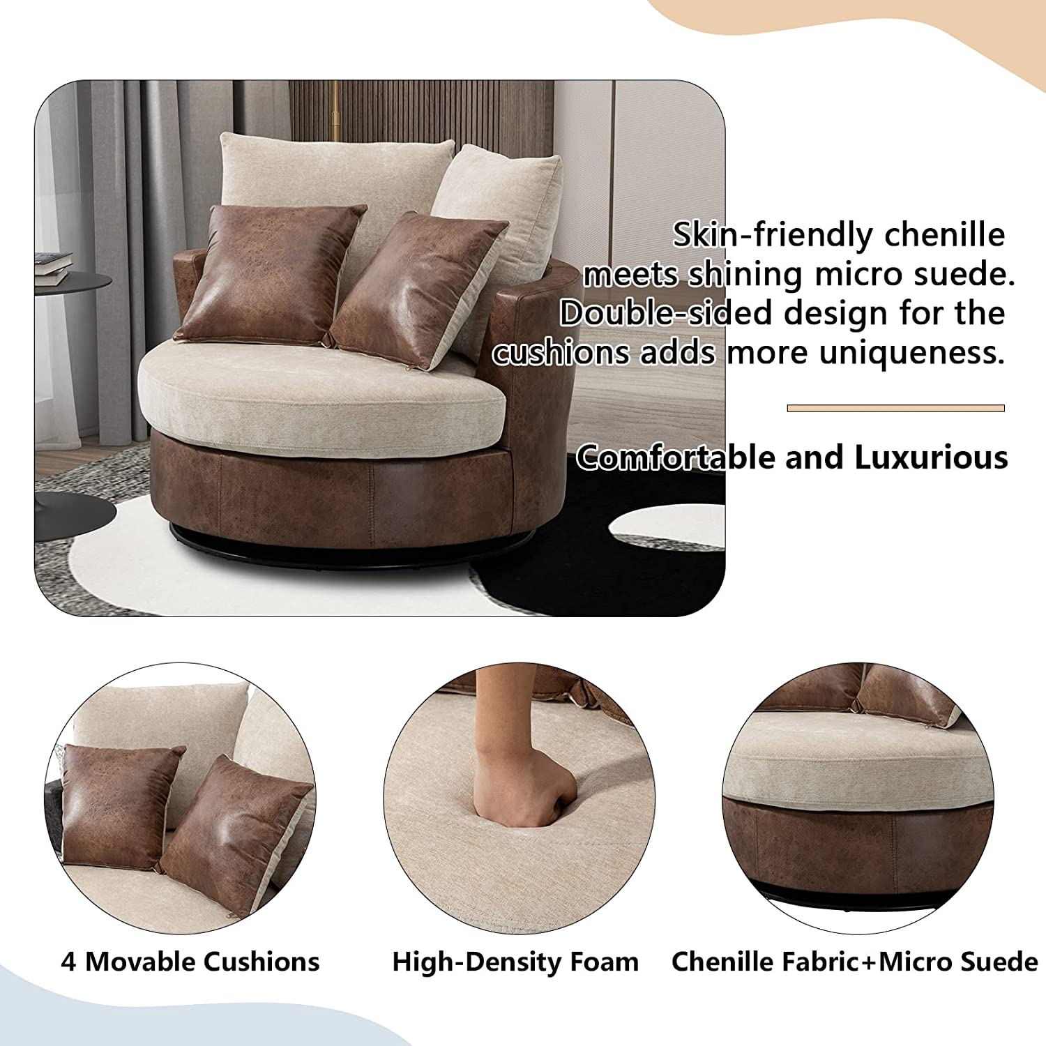 • [4 Throw Pillows] : The back of the accent chair consists of 2 large movable cushions. The other 2 smaller cushions are proper size for you to huge in your arms or support your back. Coming in patterns different from base colors of the round couch, they are perfect decoration of the swivel sofa.