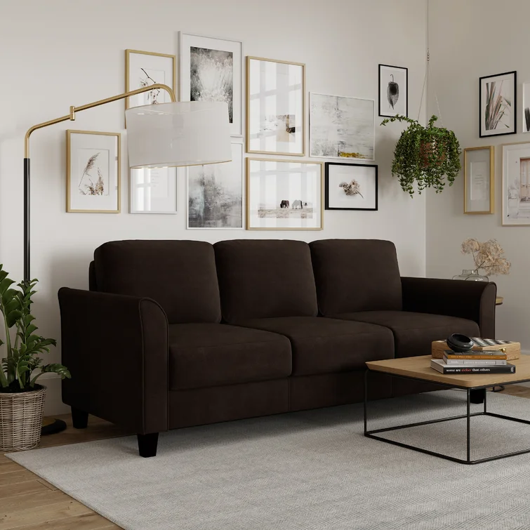 Assembly step 2: screw legs into the bottom of each sofa arm. Assembly step 3: attach arms to each side of the seat body by sliding into the brackets attached to the seat body.
