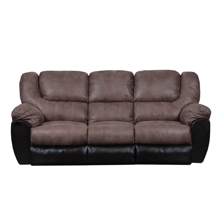 This reclining sofa brings versatile seating to your living space. Made in the USA from metal and a blend of solid and engineered wood, it stands on a plastic base in a black finish. This couch features three reclining seats with split backs and pop-out footrests, each one controlled manually with included levers. Wrapped in 100% polyester upholstery, its foam- and synthetic fiber-filled cushions support you as you sit up or lay down. This sofa's high backs and pillow-top arms create an inviting look. Best of all, no assembly is required: All you need to do is relax.