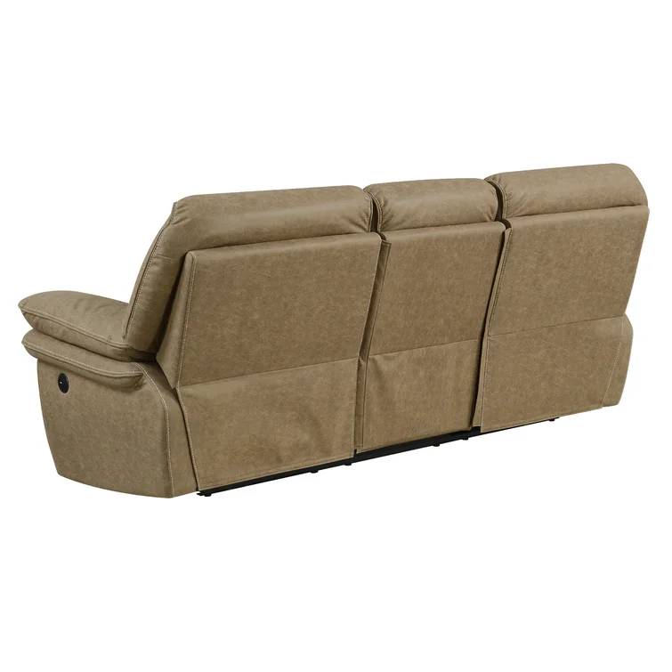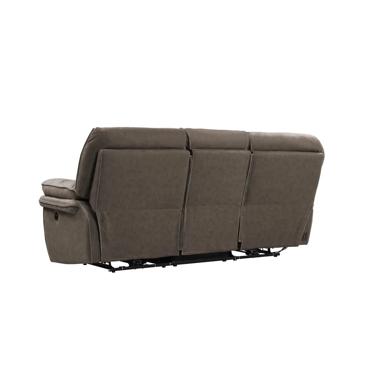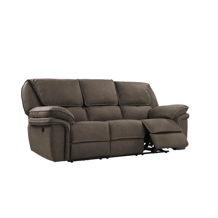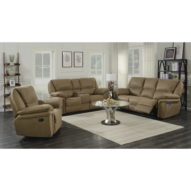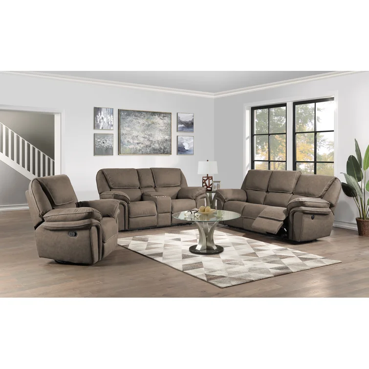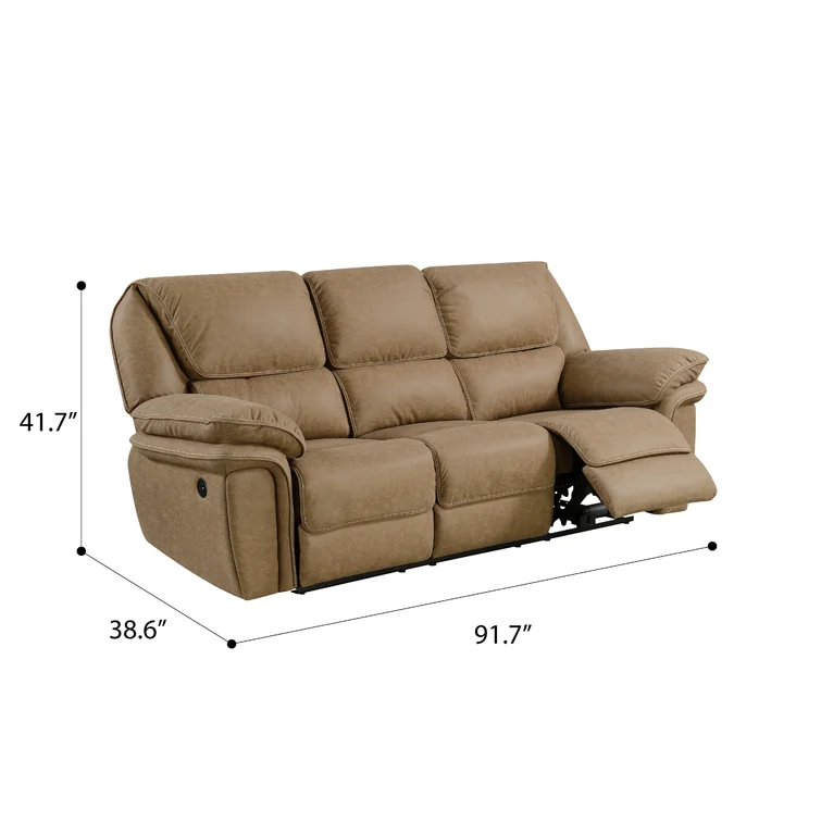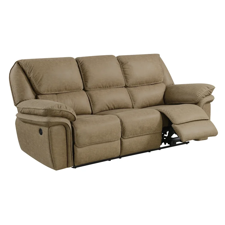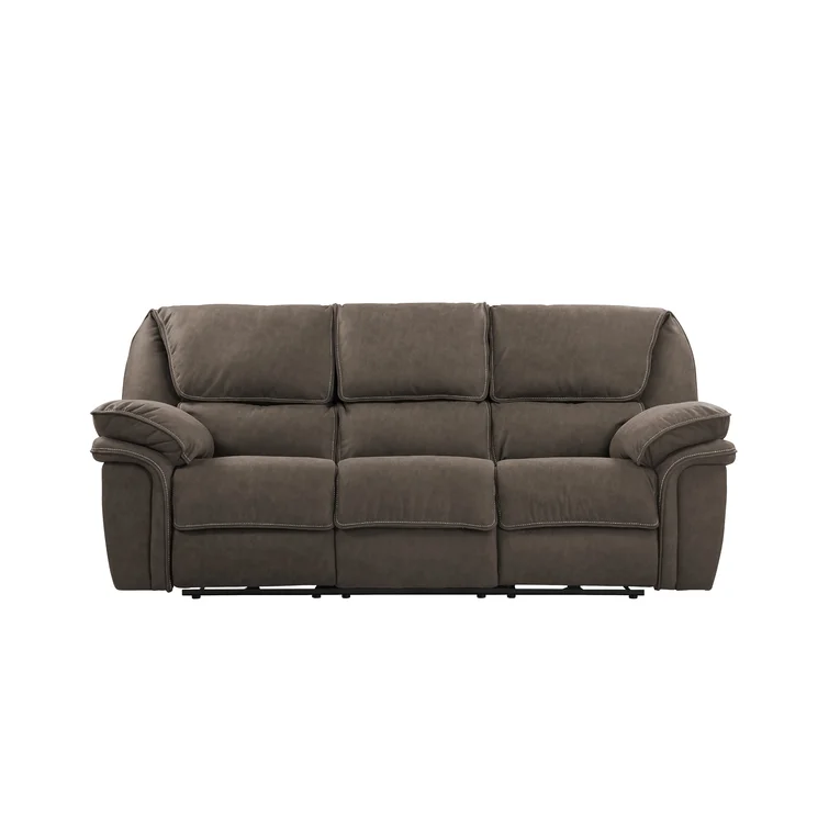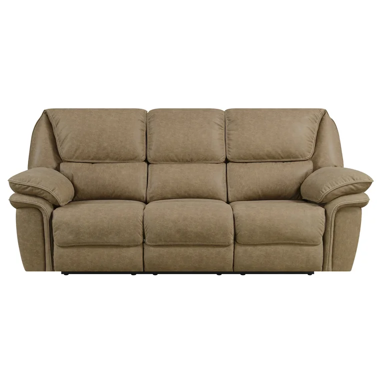 This reclining sofa brings versatile seating to your living space. Made in the USA from metal and a blend of solid and engineered wood, it stands on a plastic base in a black finish. This couch features three reclining seats with split backs and pop-out footrests, each one controlled manually with included levers. Wrapped in 100% polyester upholstery, its foam- and synthetic fiber-filled cushions support you as you sit up or lay down. This sofa's high backs and pillow-top arms create an inviting look. Best of all, no assembly is required: All you need to do is relax.