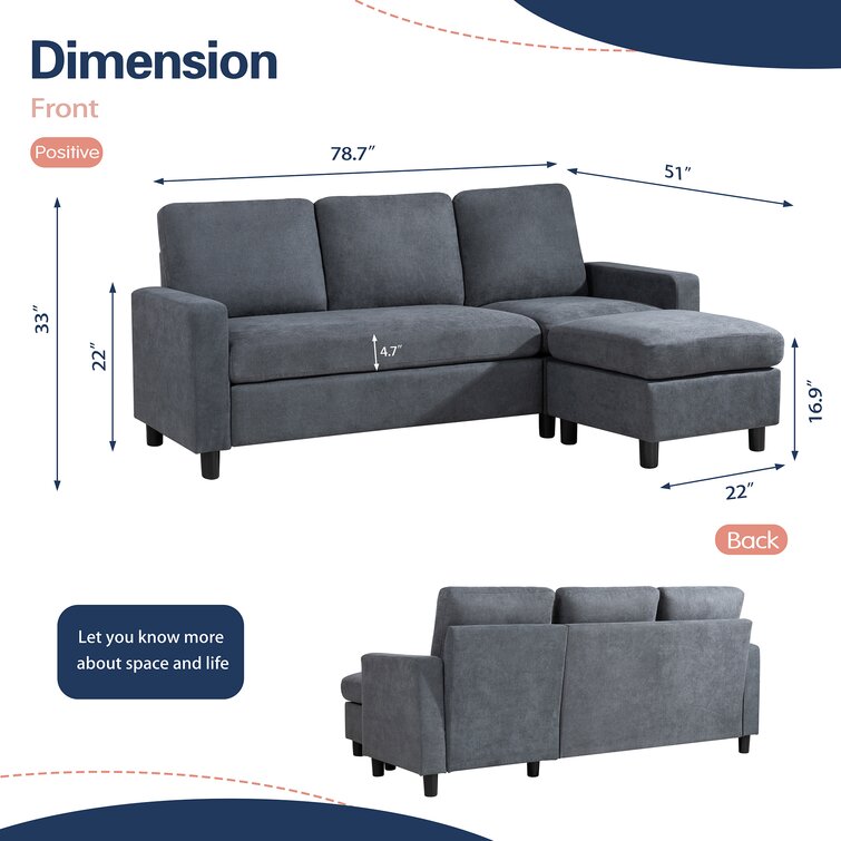 Sofa35.43'' H x 77.5'' W x 50'' DLoveseat35.43'' H x 49.21'' W x 27.56'' DChaise35.43'' H x 22.44'' W x 50'' DOttoman35.43'' H x 22.44'' W x 50'' DOverall35.43'' H x 77.55'' W x 50'' D
