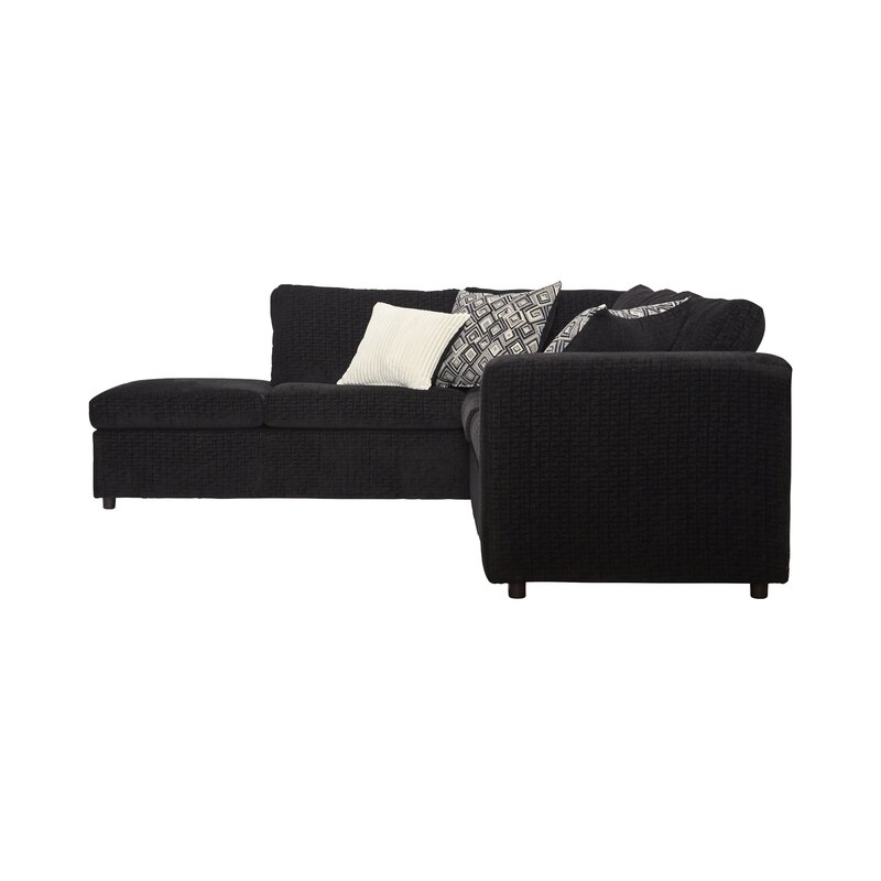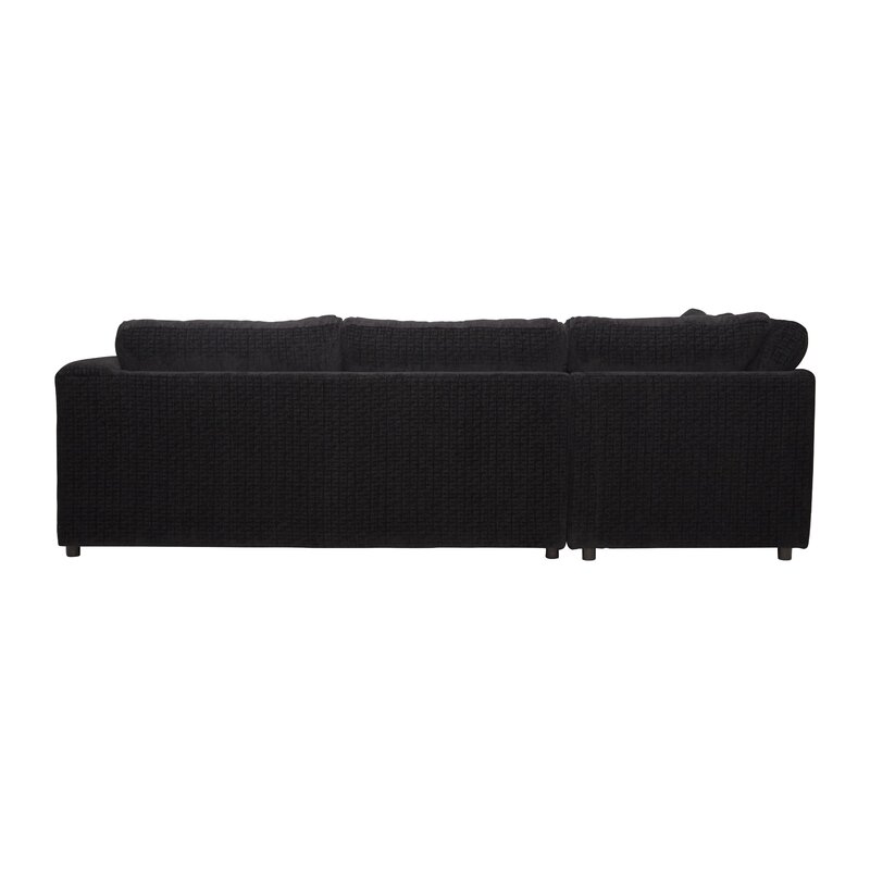 Anchor your den in cozy, inviting style with this contemporary sectional! Striking a classic L-shaped silhouette with a wedge back and one wide track arm, this sectional consists of a three-seat sofa and a matching chaise lounge so you can kick up your feet. Sporting a neutral solid hue, the whole sofa is enveloped in 100% polyester upholstery. Thick cushions line the seats, chaise, and backrest for comfort and support, while a pair of matching toss pillows makes accessorizing a breeze.