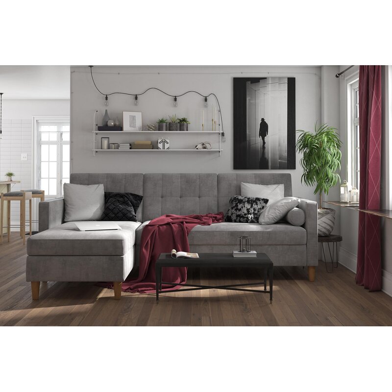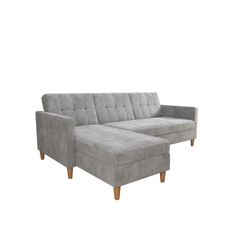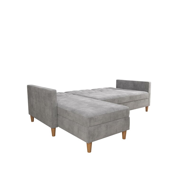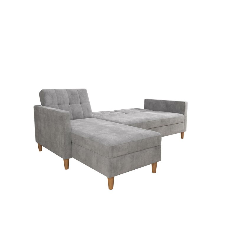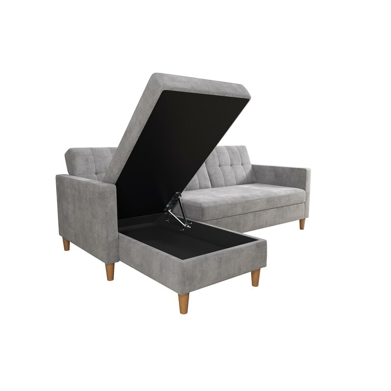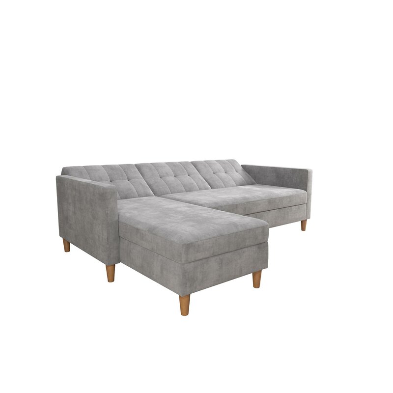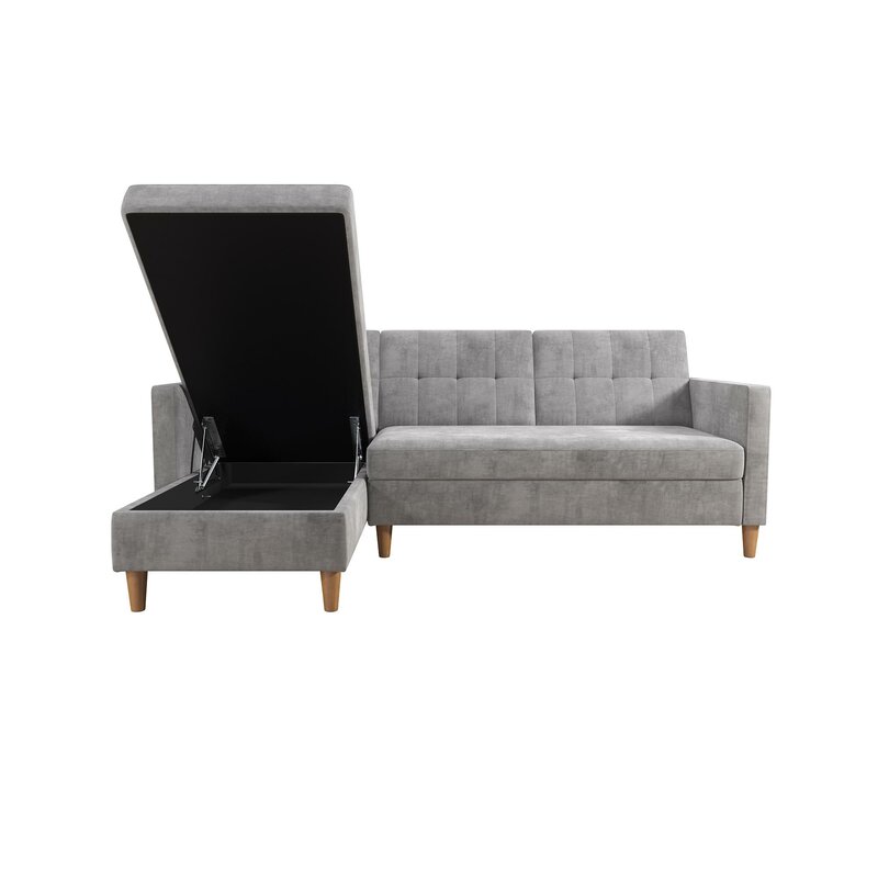 This sleeper sofa and chaise bring a clean-lined, contemporary style to your living room. It's built with a solid and engineered wood frame and features track arms and tapered dowel legs for a mid-century-inspired silhouette. The polyester upholstery is filled with foam and has a spring seat construction for just the right amount of giving that bounces back. The tight back cushion is decorated with biscuit tufting for a hint of vintage appeal. We love how you can push the back down to create a bed for overnight guests. Plus, the chaise's seat can lift up to reveal a storage spot for blankets and throw pillows.