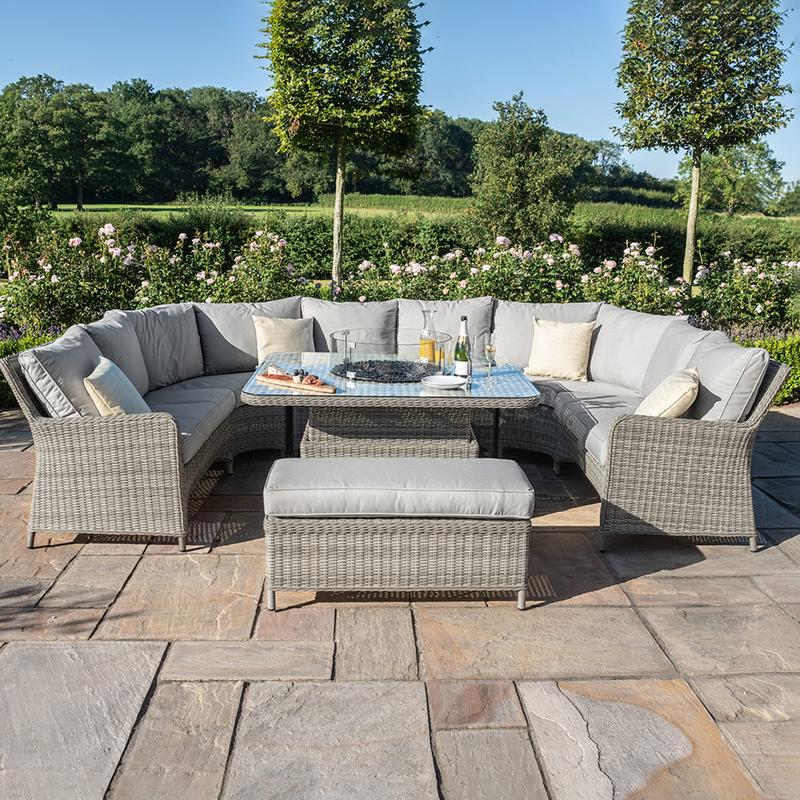 Our new Winchester Royal U Shape Sofa Set with Fire Pit is our largest and most intimate Rattan set created yet. It incorporates a gas fire pit system which will allow you to elongate the evening in warmth. whilst the generous U-Shaped Sofas and additional bench bring everyone together to socialise in maximum comfort. All our fire pit systems are CE registered and will accommodate a 5kg green patio gas bottle which can be stored underneath the table. We anticipate each gas bottle will last for approximately 6-7 hours.