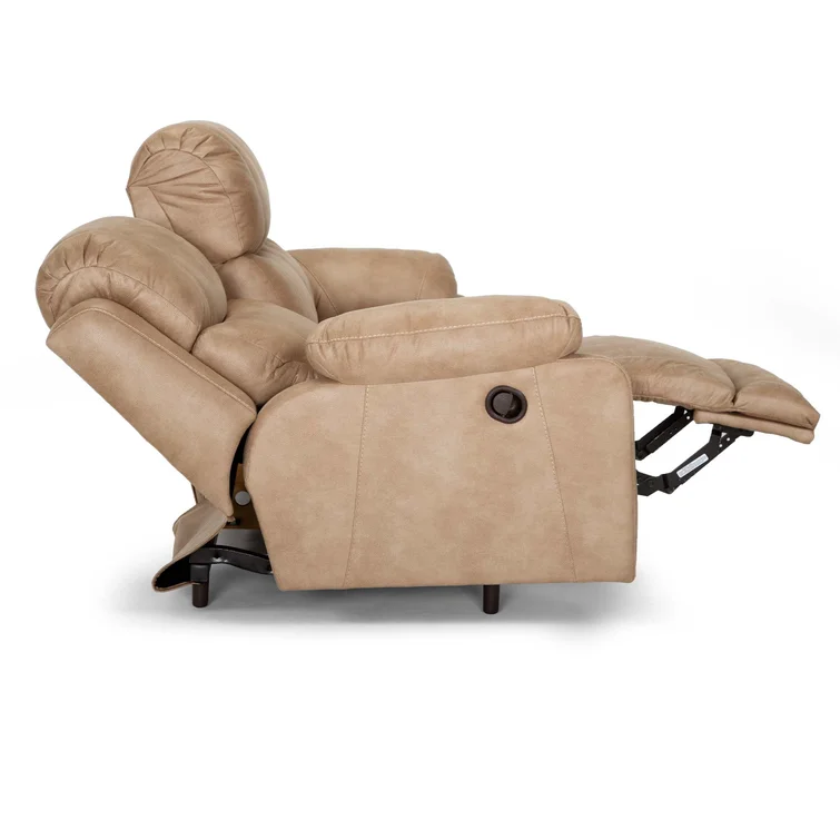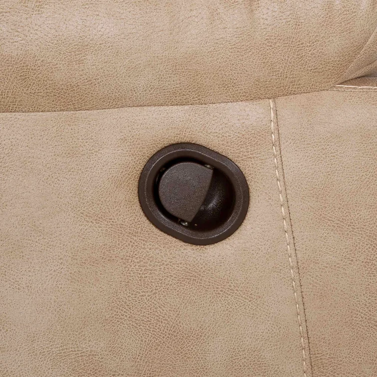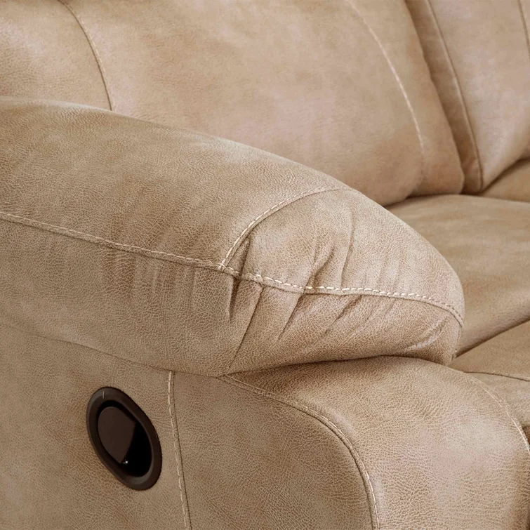This reclining sofa brings versatile seating to your living space. Made in the USA from metal and a blend of solid and engineered wood, it stands on a plastic base in a black finish. This couch features three reclining seats with split backs and pop-out footrests, each one controlled manually with included levers. Wrapped in 100% polyester upholstery, its foam- and synthetic fiber-filled cushions support you as you sit up or lay down. This sofa's high backs and pillow-top arms create an inviting look. Best of all, no assembly is required: All you need to do is relax.