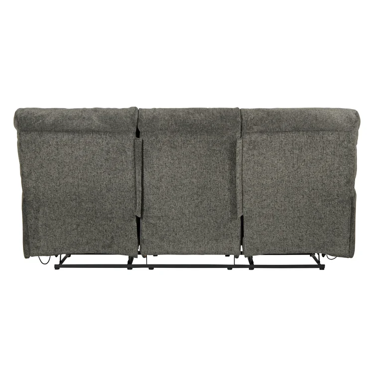 This reclining sofa brings versatile seating to your living space. Made in the USA from metal and a blend of solid and engineered wood, it stands on a plastic base in a black finish. This couch features three reclining seats with split backs and pop-out footrests, each one controlled manually with included levers. Wrapped in 100% polyester upholstery, its foam- and synthetic fiber-filled cushions support you as you sit up or lay down. This sofa's high backs and pillow-top arms create an inviting look. Best of all, no assembly is required: All you need to do is relax.