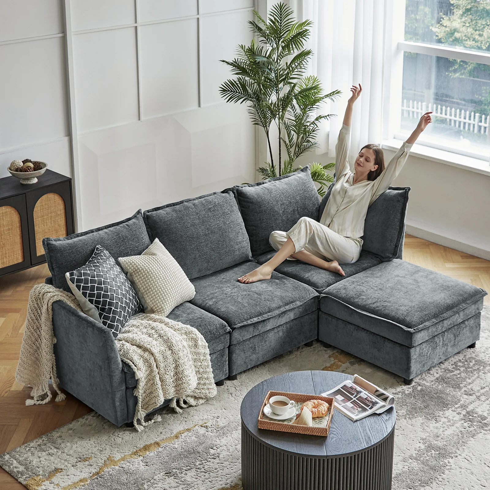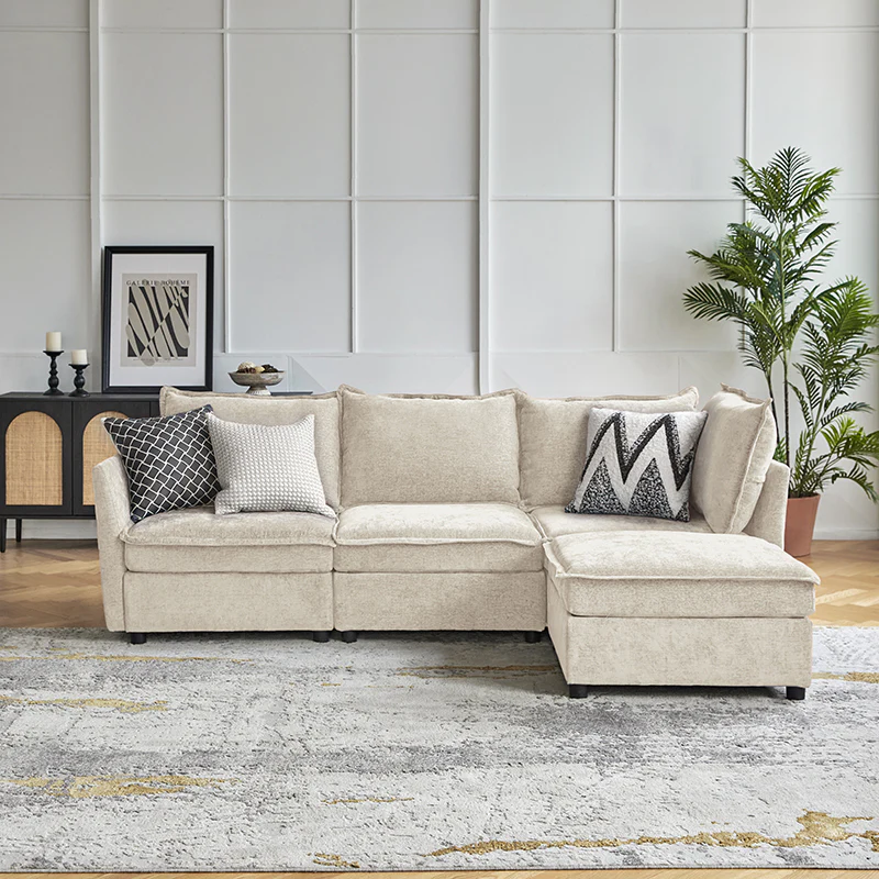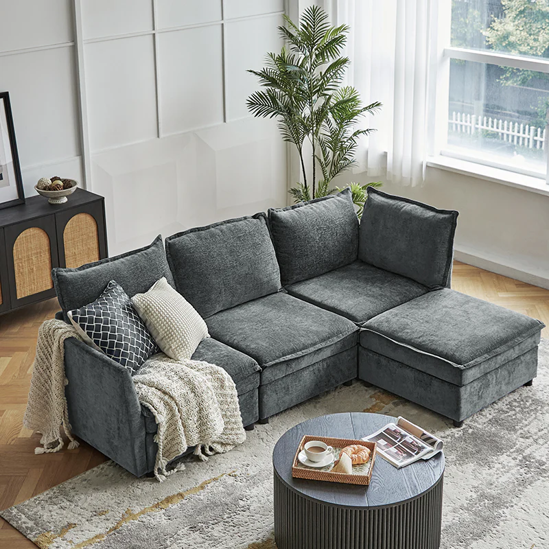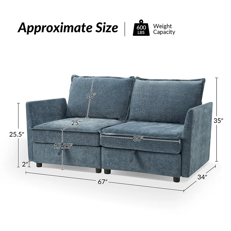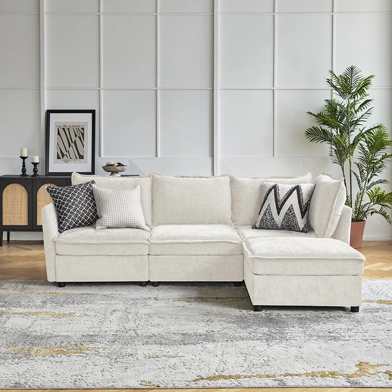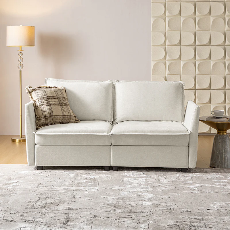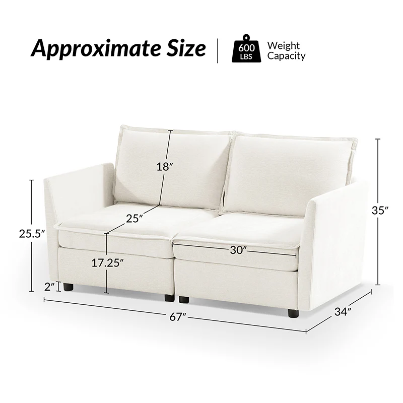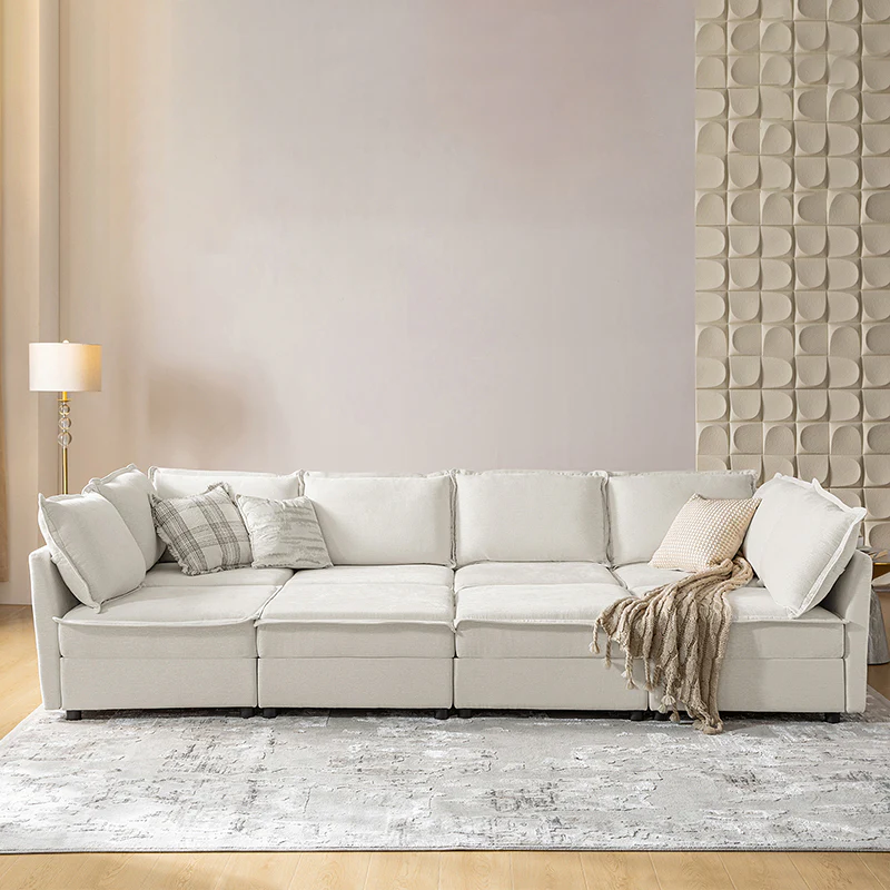 This modular sofa is designed for maximum comfort and versatility. Featuring 1.5x extra-wide seats, it caters specifically to larger individuals and expansive spaces. The soft cushions offer exceptional comfort. Hidden storage compartments under the seats help reduce clutter and provide easy access to everyday items. Its modular design allows you to rearrange the sections to create different living room layouts. Assembly is hassle-free with no tools required, and the sofa's segmented packaging ensures easy transportation. Additionally, the fabric covers are removable and washable, maintaining a fresh and clean look.