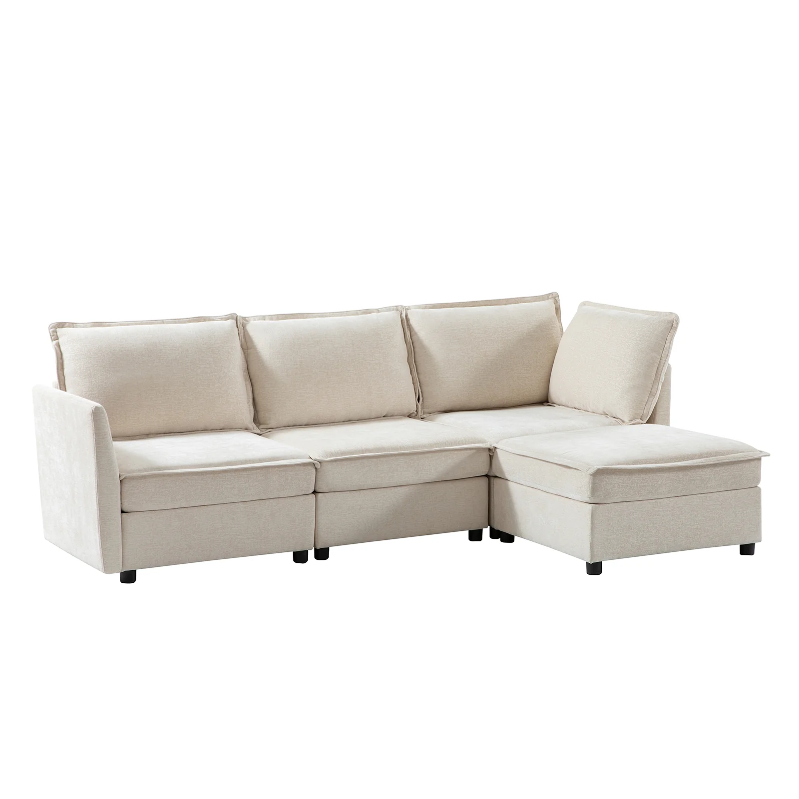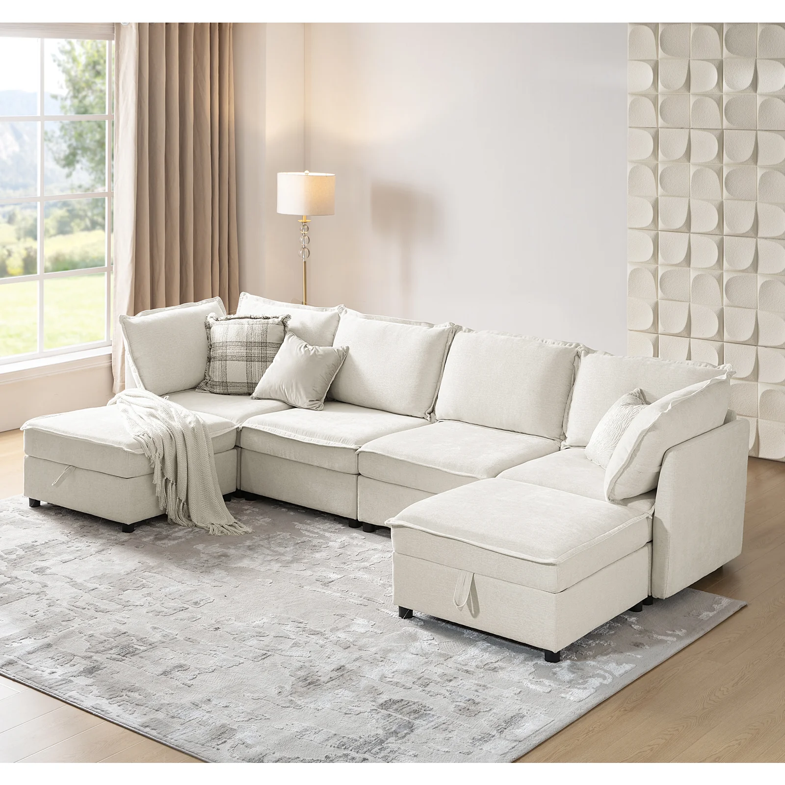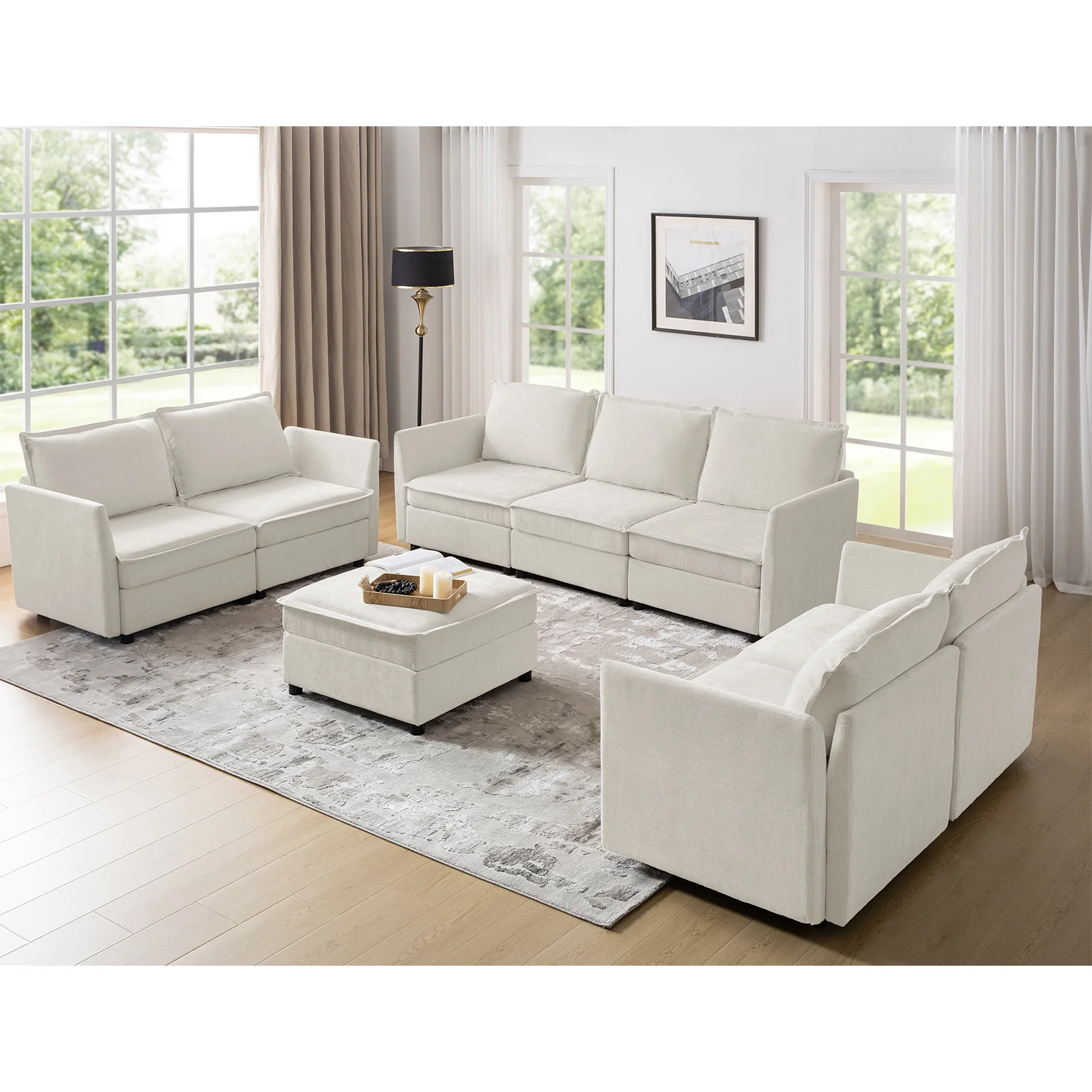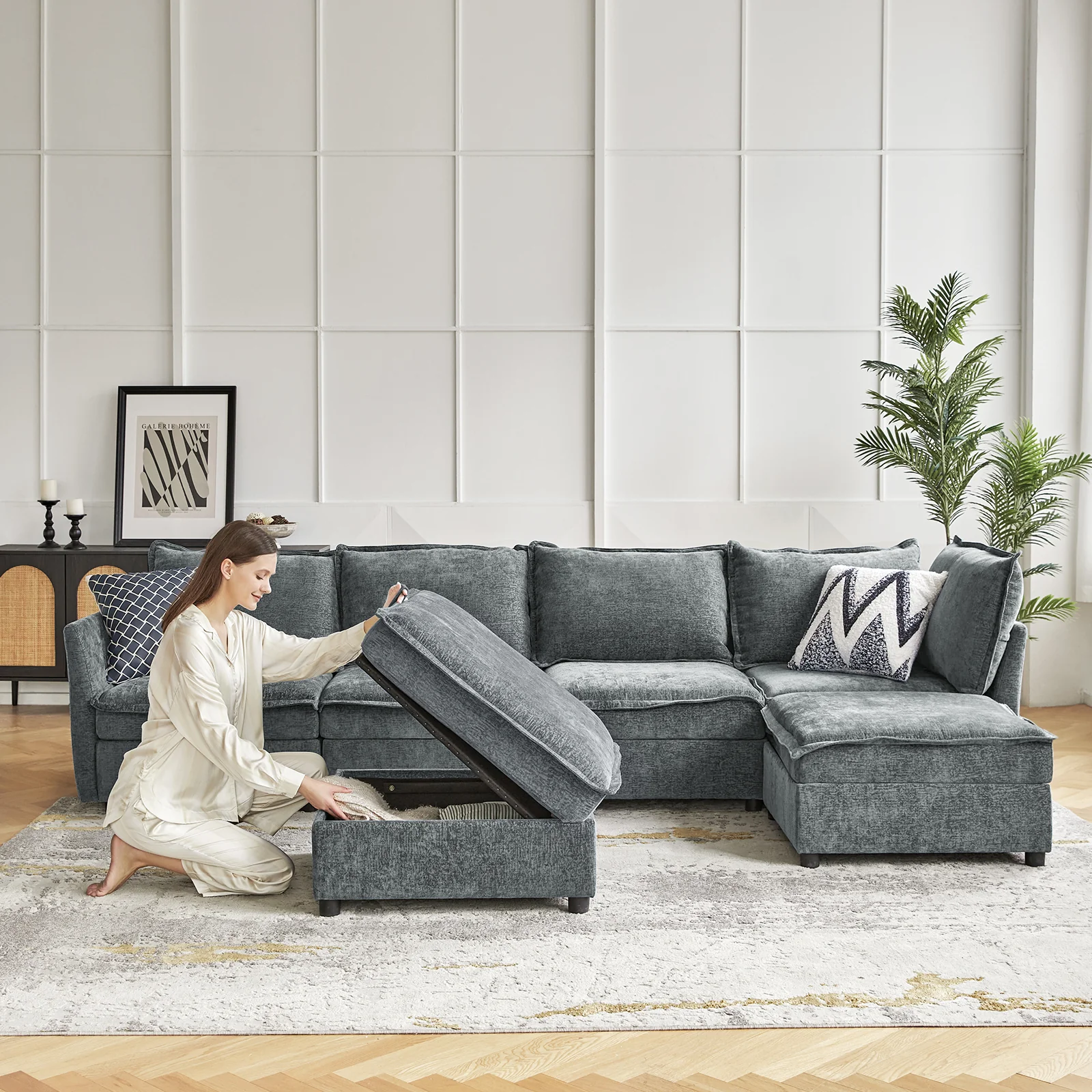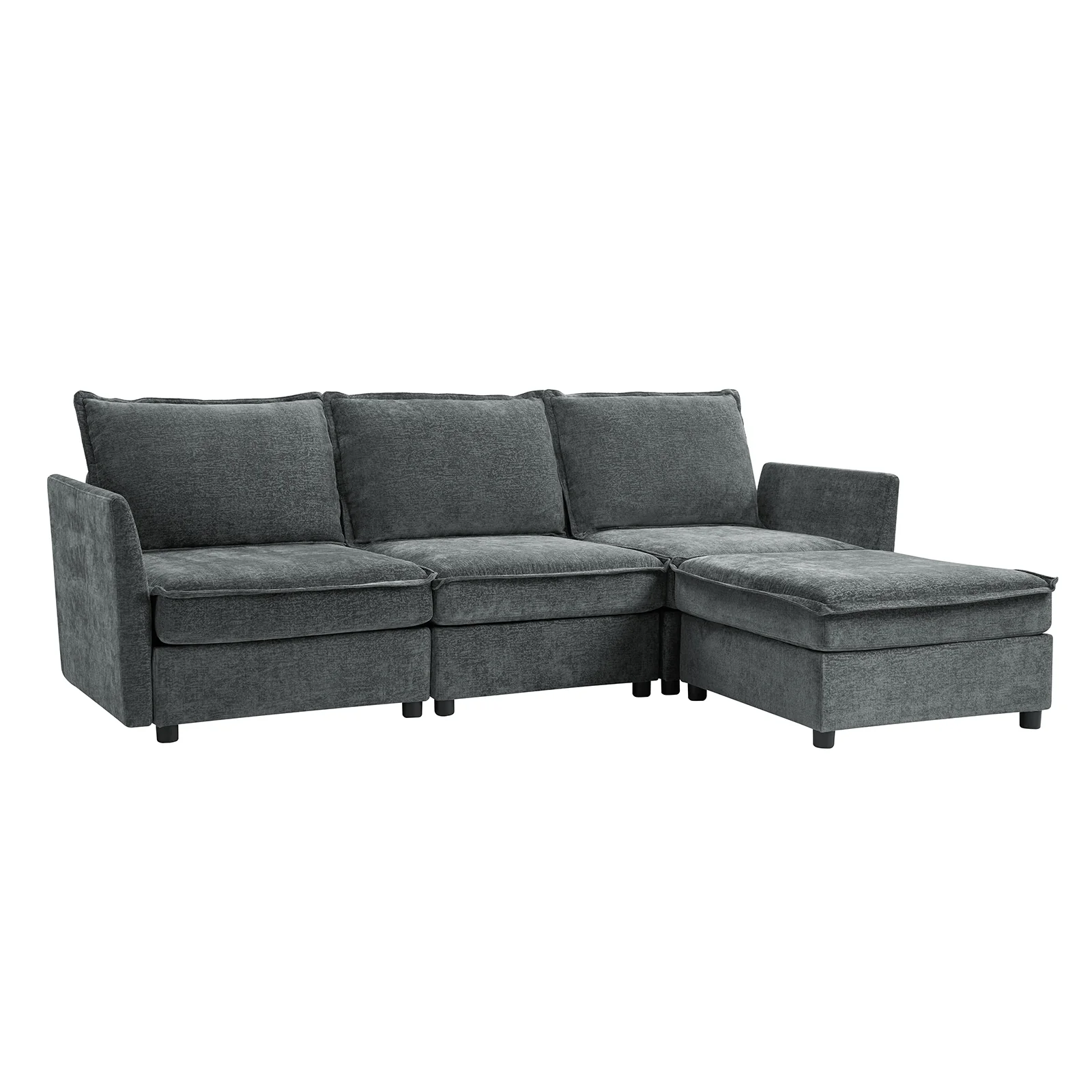 This modular sofa is designed for maximum comfort and versatility. Featuring 1.5x extra-wide seats, it caters specifically to larger individuals and expansive spaces. The soft cushions offer exceptional comfort. Hidden storage compartments under the seats help reduce clutter and provide easy access to everyday items. Its modular design allows you to rearrange the sections to create different living room layouts. Assembly is hassle-free with no tools required, and the sofa's segmented packaging ensures easy transportation. Additionally, the fabric covers are removable and washable, maintaining a fresh and clean look.