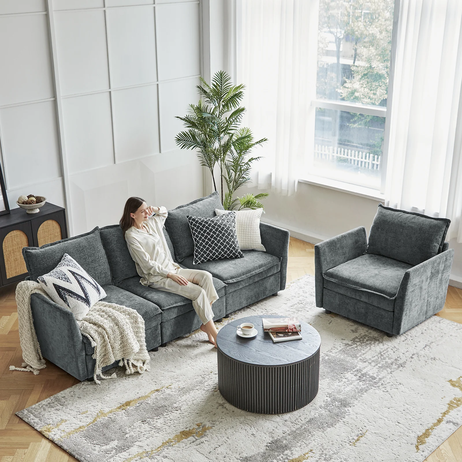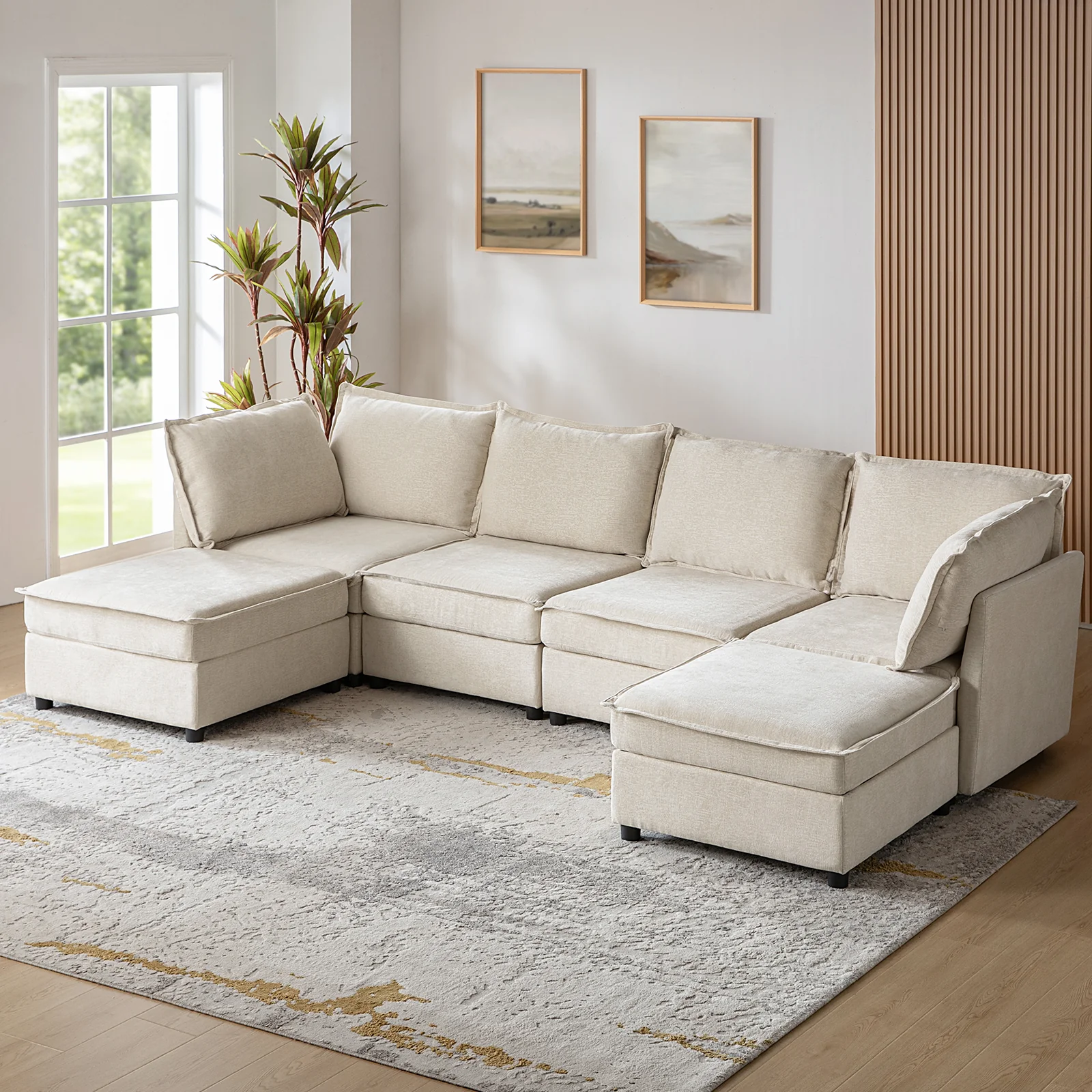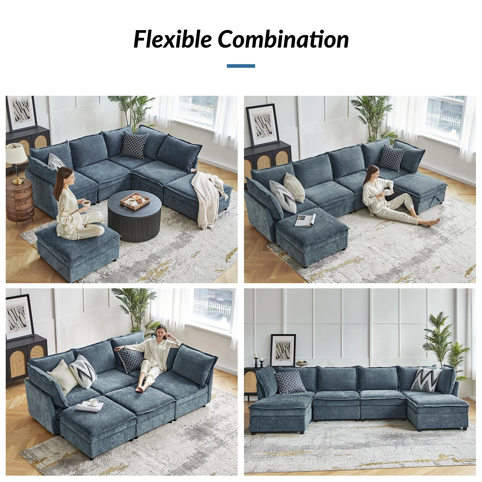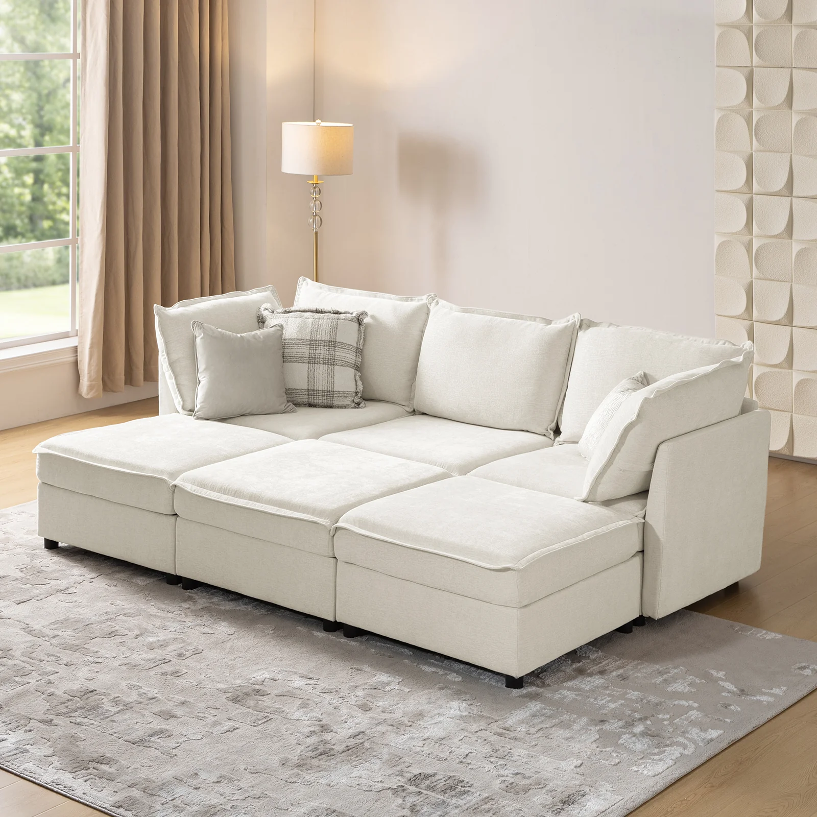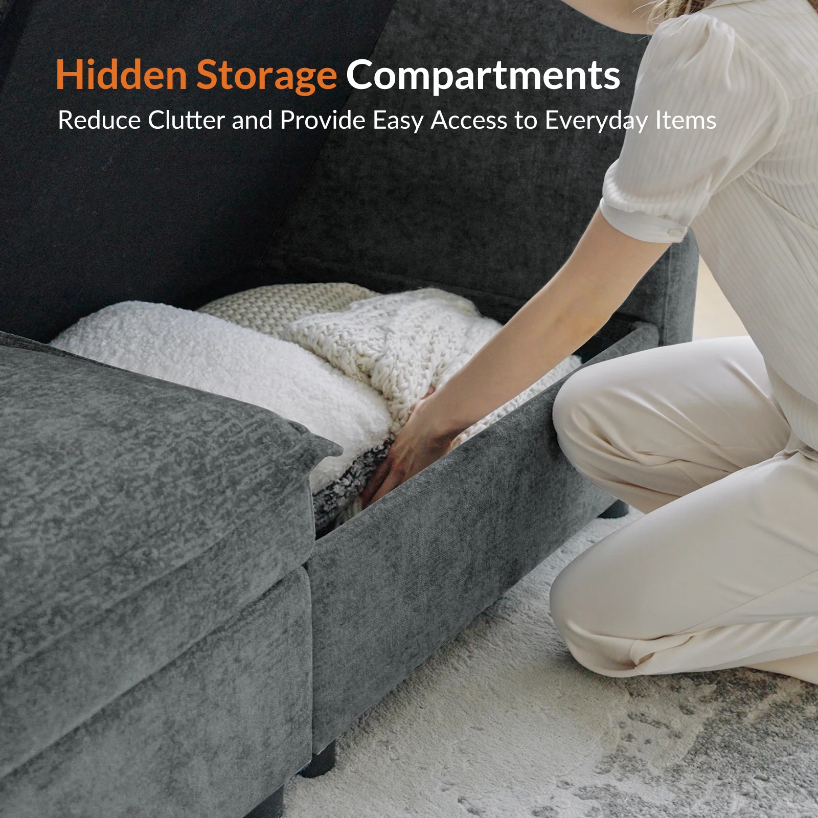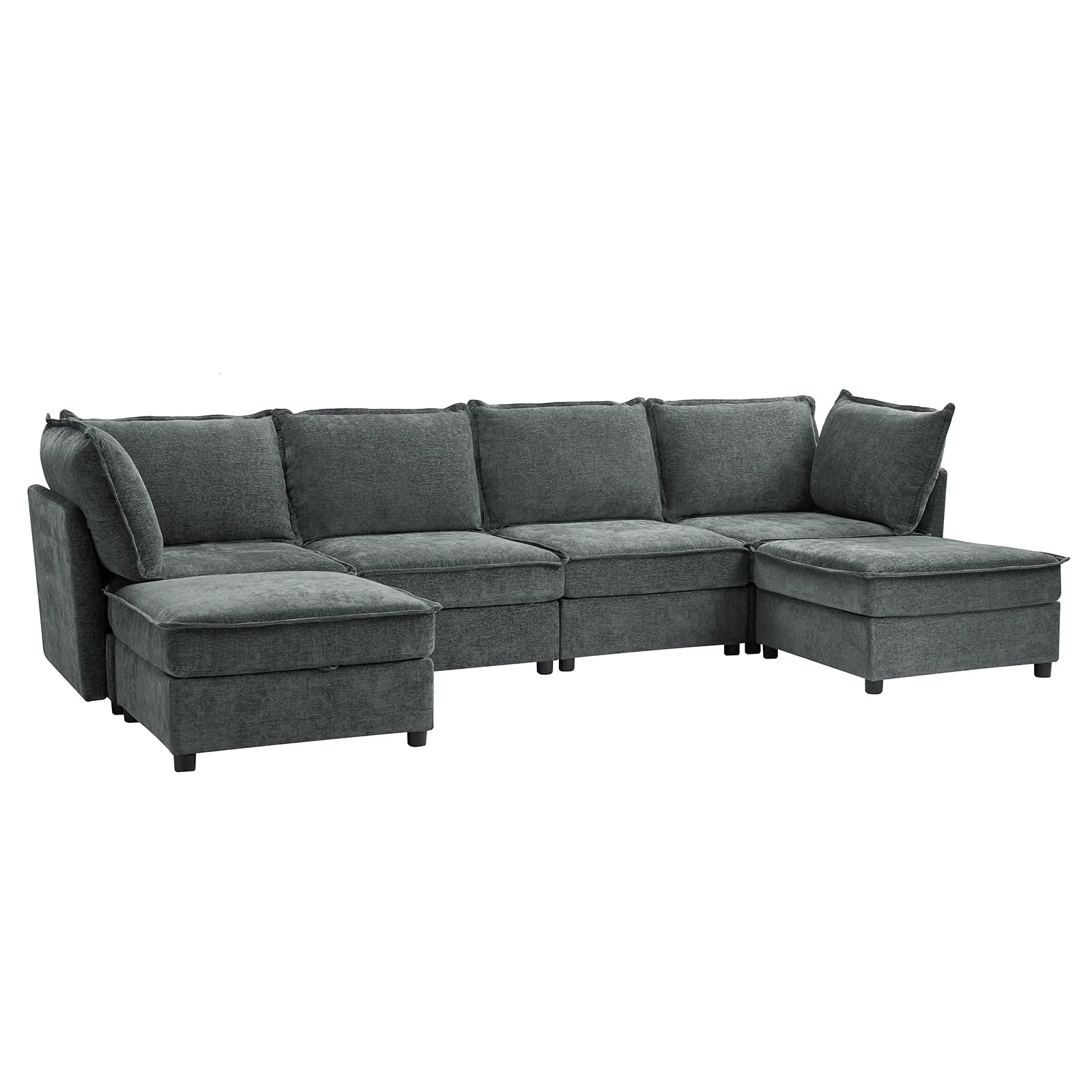This modular sofa is designed for maximum comfort and versatility. Featuring 1.5x extra-wide seats, it caters specifically to larger individuals and expansive spaces. The soft cushions offer exceptional comfort. Hidden storage compartments under the seats help reduce clutter and provide easy access to everyday items. Its modular design allows you to rearrange the sections to create different living room layouts. Assembly is hassle-free with no tools required, and the sofa's segmented packaging ensures easy transportation. Additionally, the fabric covers are removable and washable, maintaining a fresh and clean look.