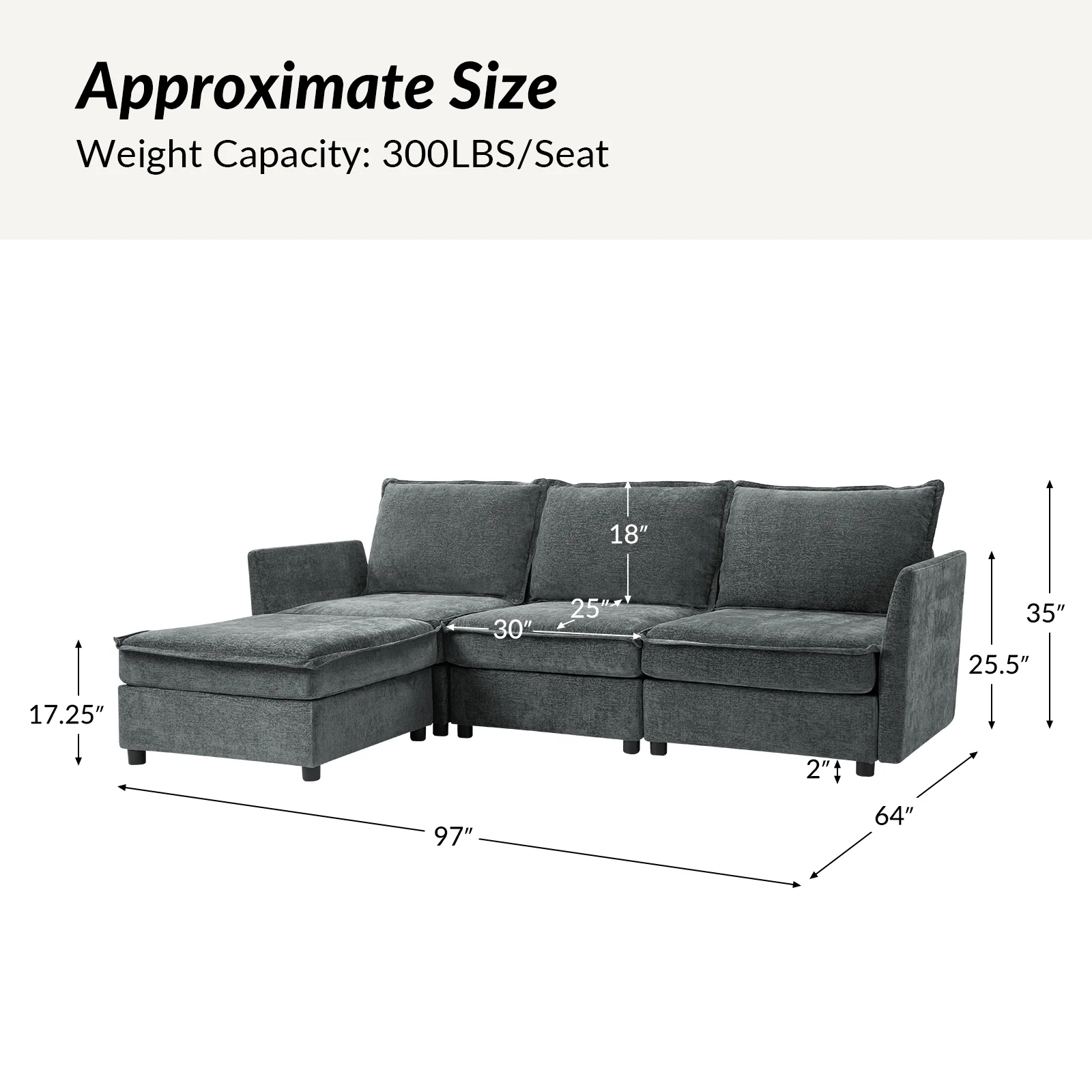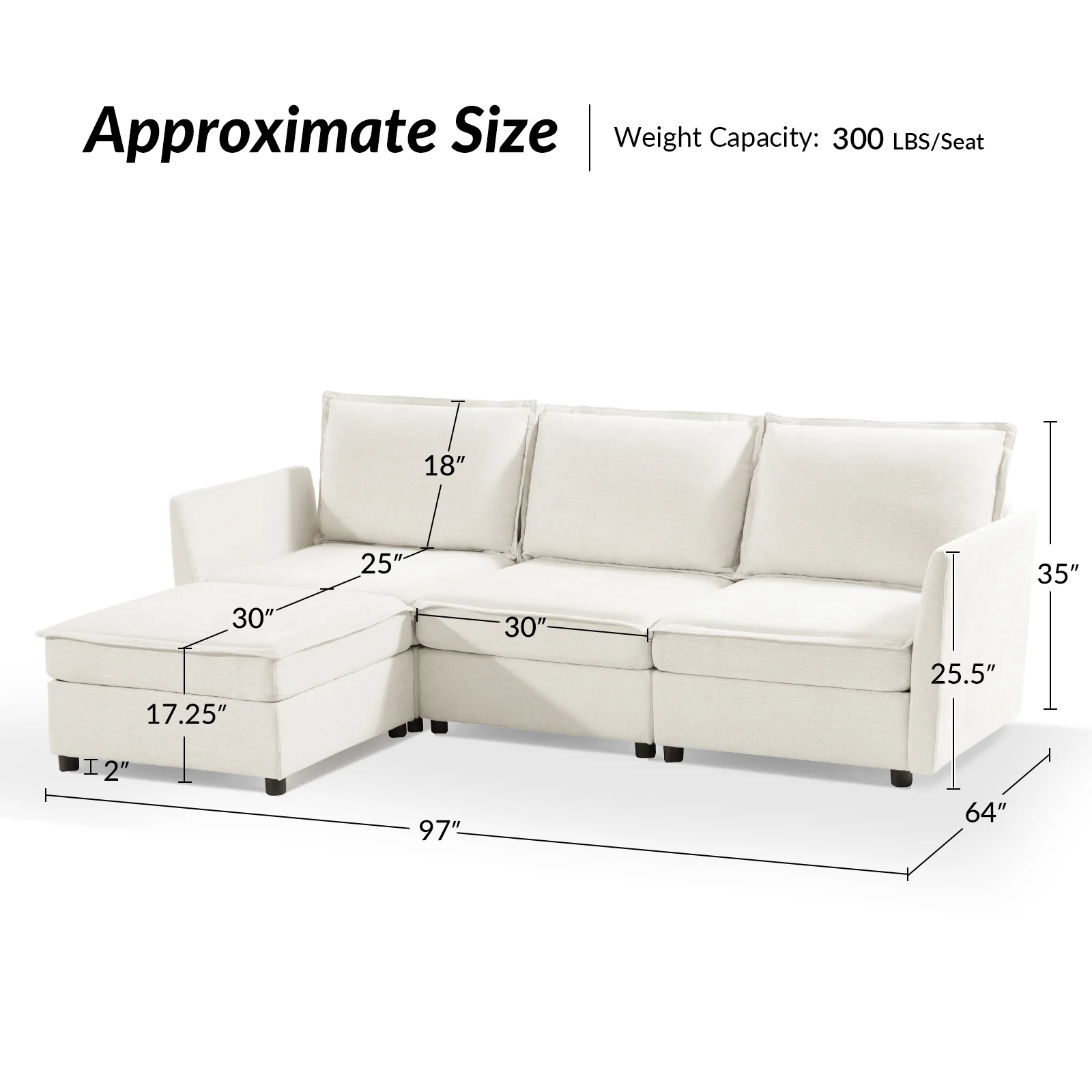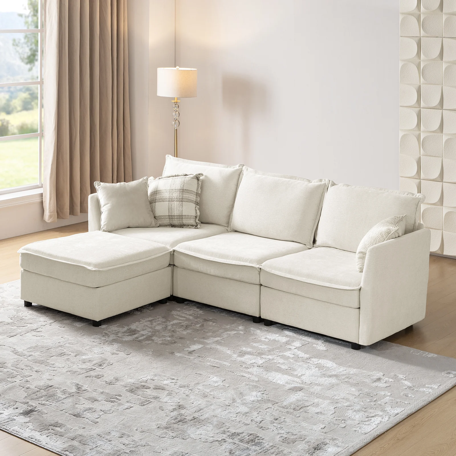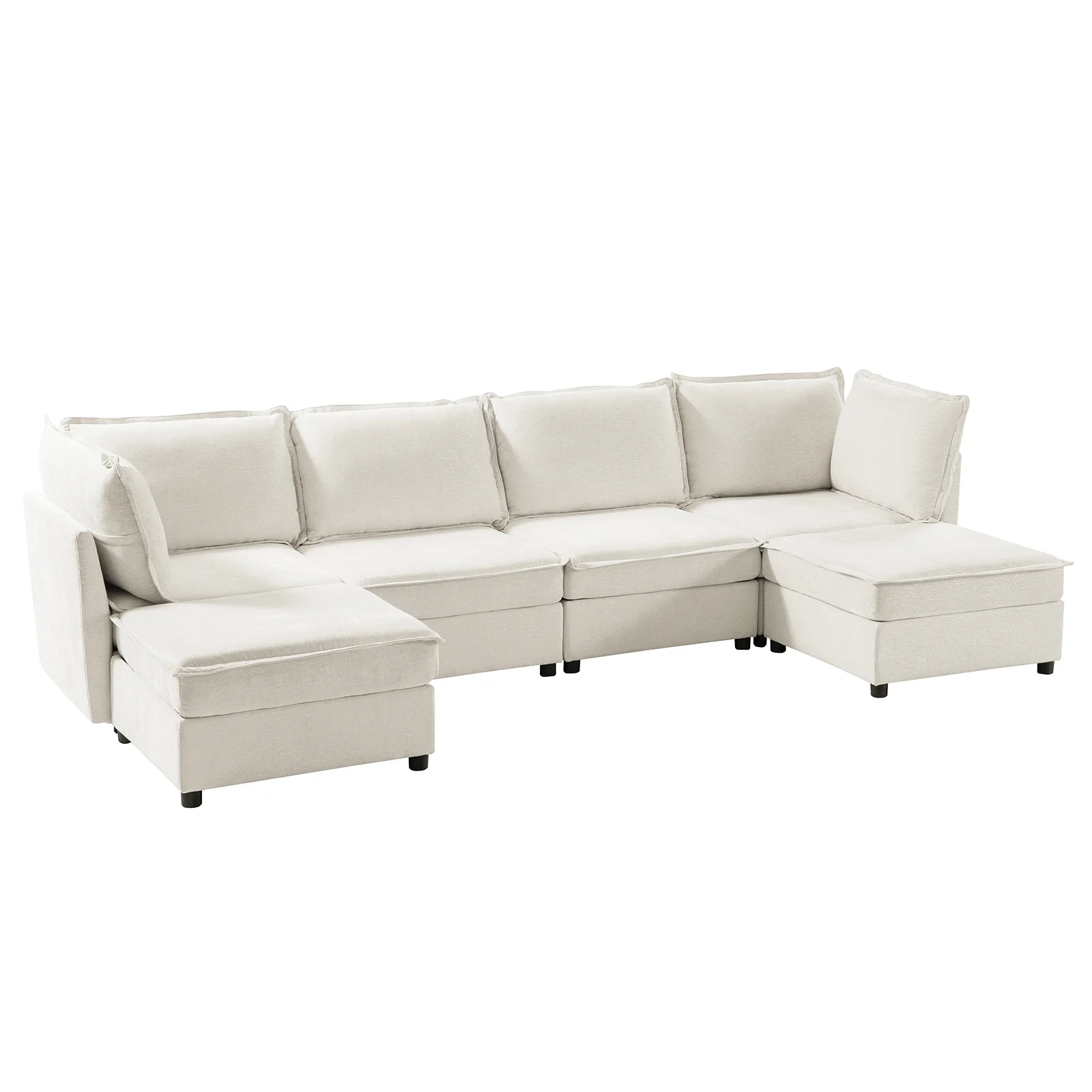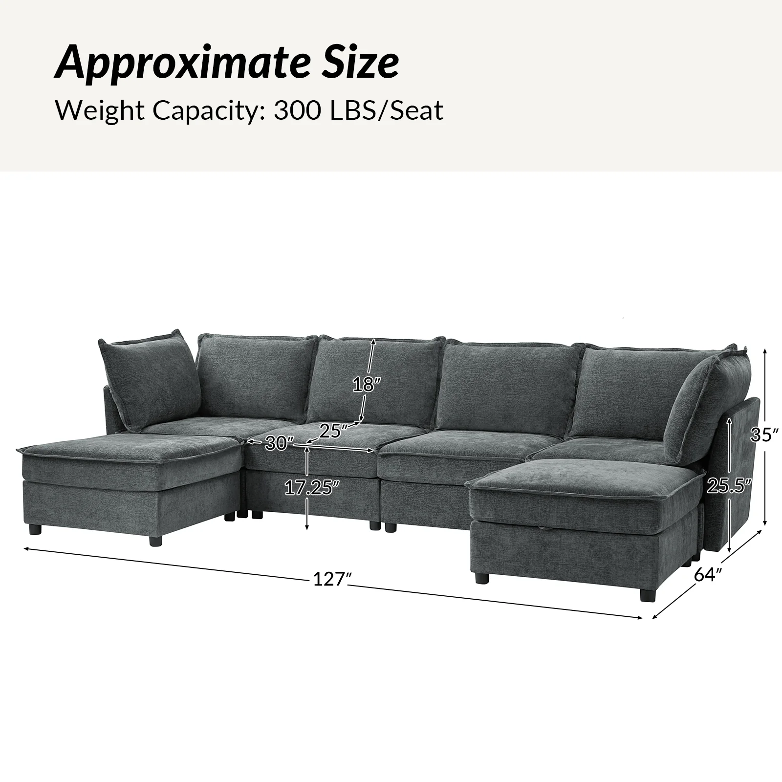 This modular sofa is designed for maximum comfort and versatility. Featuring 1.5x extra-wide seats, it caters specifically to larger individuals and expansive spaces. The soft cushions offer exceptional comfort. Hidden storage compartments under the seats help reduce clutter and provide easy access to everyday items. Its modular design allows you to rearrange the sections to create different living room layouts. Assembly is hassle-free with no tools required, and the sofa's segmented packaging ensures easy transportation. Additionally, the fabric covers are removable and washable, maintaining a fresh and clean look.