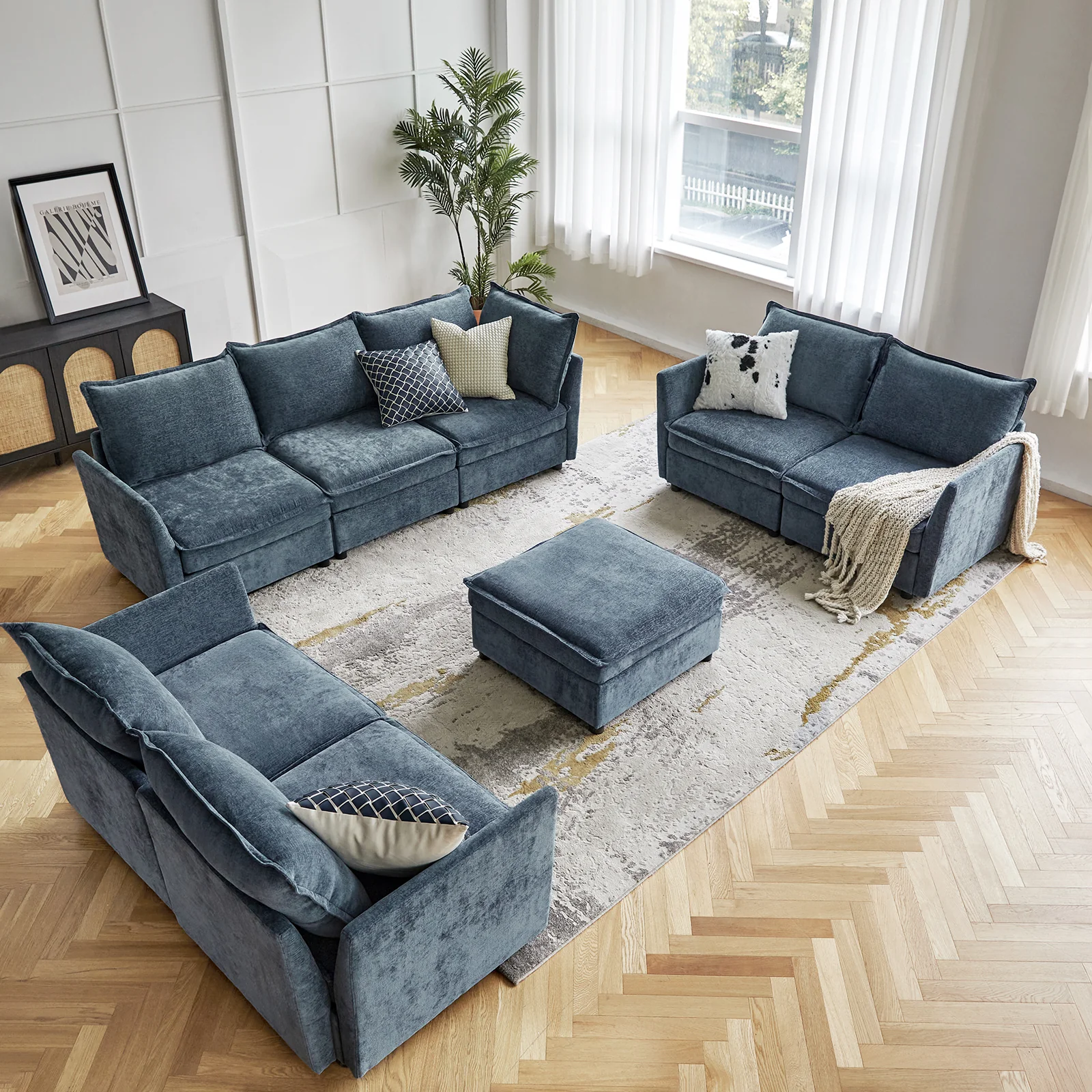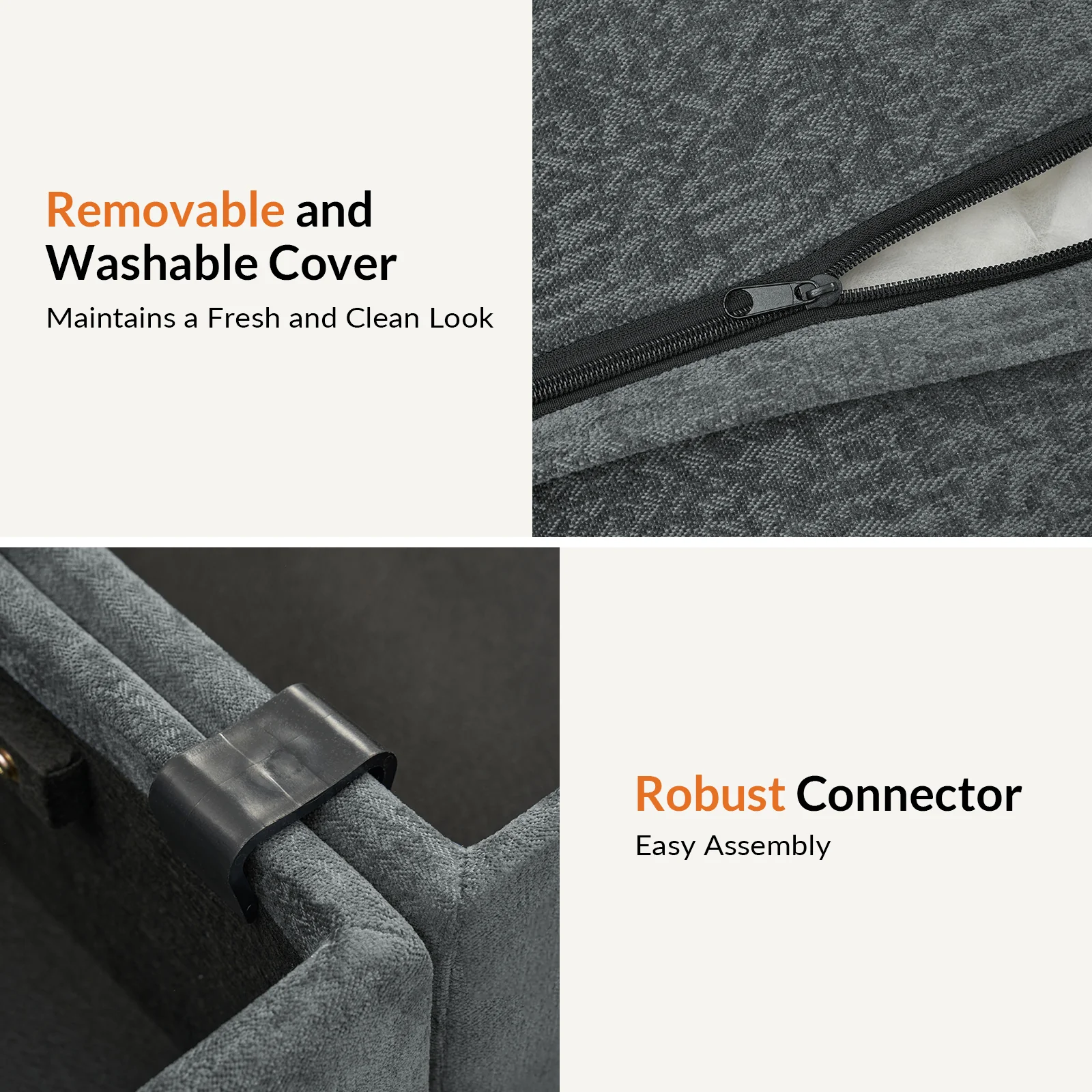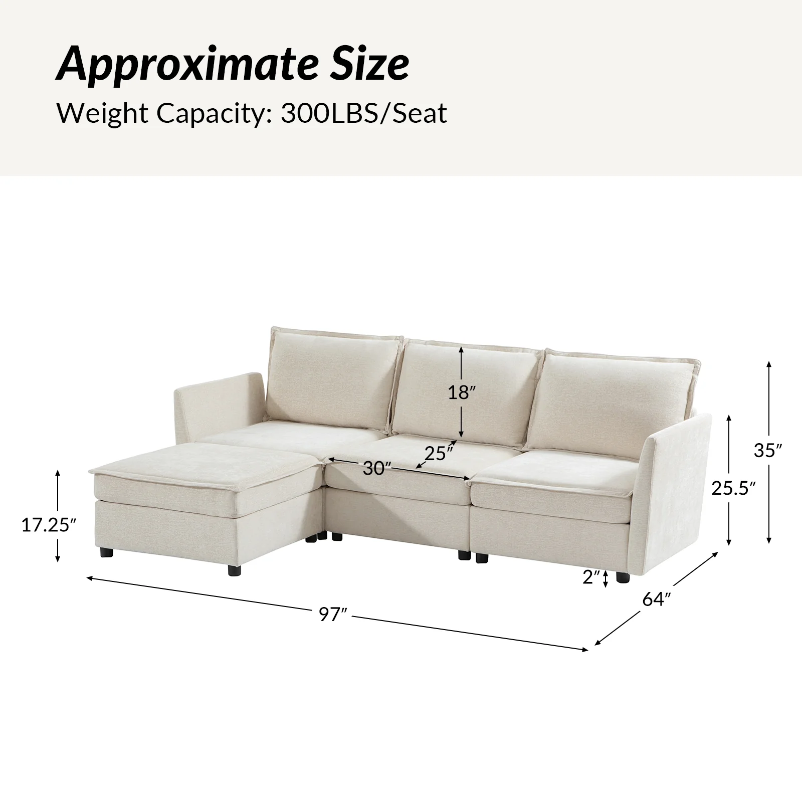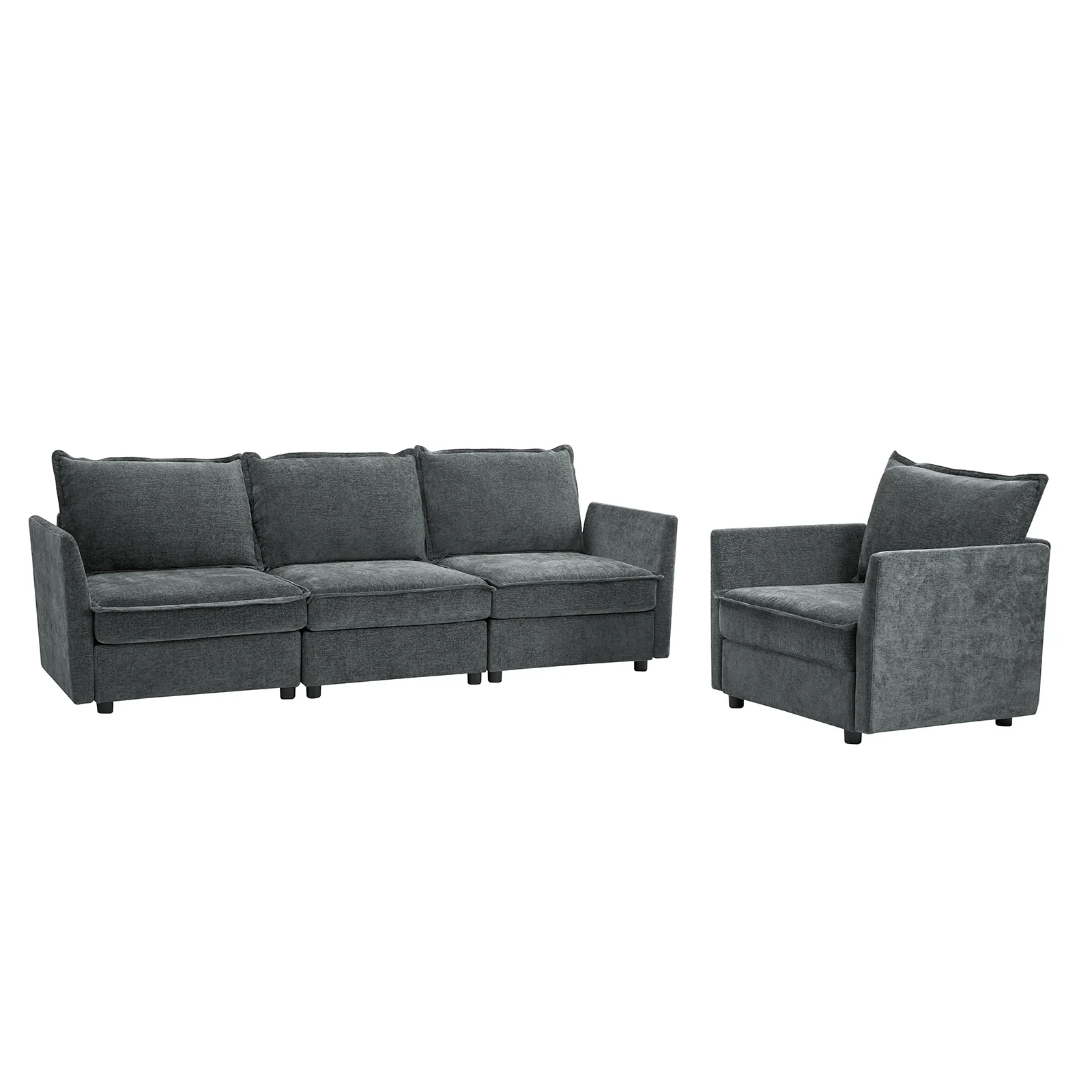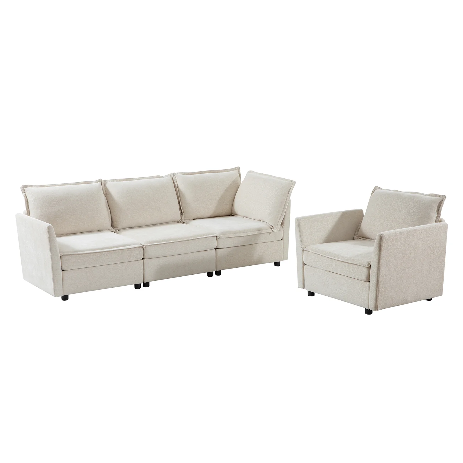 This modular sofa is designed for maximum comfort and versatility. Featuring 1.5x extra-wide seats, it caters specifically to larger individuals and expansive spaces. The soft cushions offer exceptional comfort. Hidden storage compartments under the seats help reduce clutter and provide easy access to everyday items. Its modular design allows you to rearrange the sections to create different living room layouts. Assembly is hassle-free with no tools required, and the sofa's segmented packaging ensures easy transportation. Additionally, the fabric covers are removable and washable, maintaining a fresh and clean look.