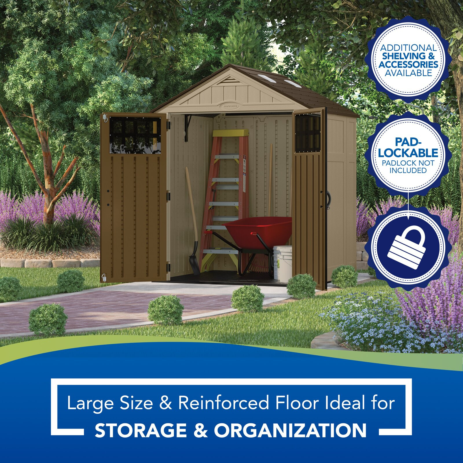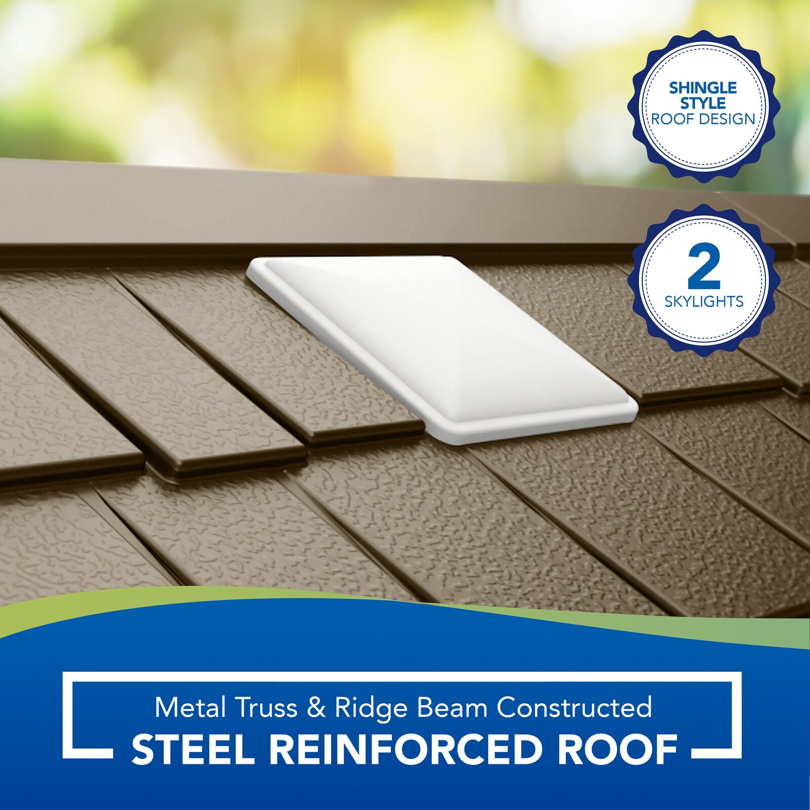 Looking to beat the clutter in your outdoor space? This 201 cu. ft. Outdoor Storage Shed is your best defense for organization in any season. The double-door entry and 6 ft. x 6 ft. size make it ideal for housing all of your larger equipment. Smaller items and everyday essentials can also be easily organized with the optional accessory kits, and the skylights and door windows bring in lots of natural light. Built for strength and stability, the shed features multi-wall resin and padlock-ready handles, which do double duty to protect your valuables in style.