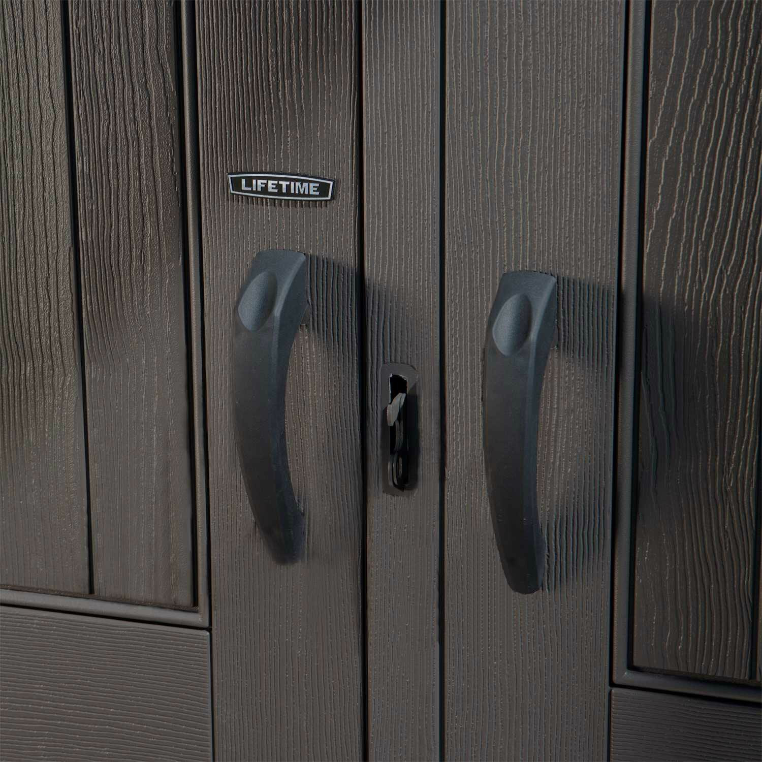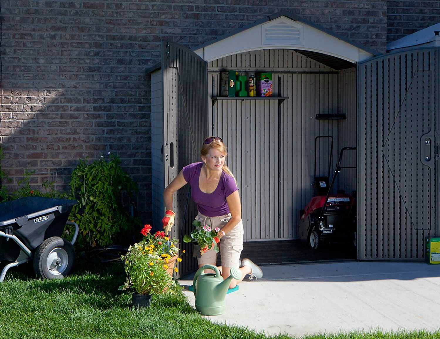 This compact shed is ideal for a driveway or carport where there is limited space. Keep tools and automotive supplies handy, safe, and secure in this highly durable, low maintenance Lifetime shed. Constructed from UV-protected, high-density, double-walled polyethylene plastic with steel reinforcements. Won't rust or dent like metal sheds. Won't fade, crack, or splinter like wooden sheds. This shed comes to a full-length skylight that provides natural interior lighting. The steeply pitched roof allows for quick drainage of rain and snow, and the shorter roof span allows a greater snow load capacity than our larger sheds. Double-wide doors allow for easy access. Keep your tools and automotive supplies organized and located right where you need them in the driveway