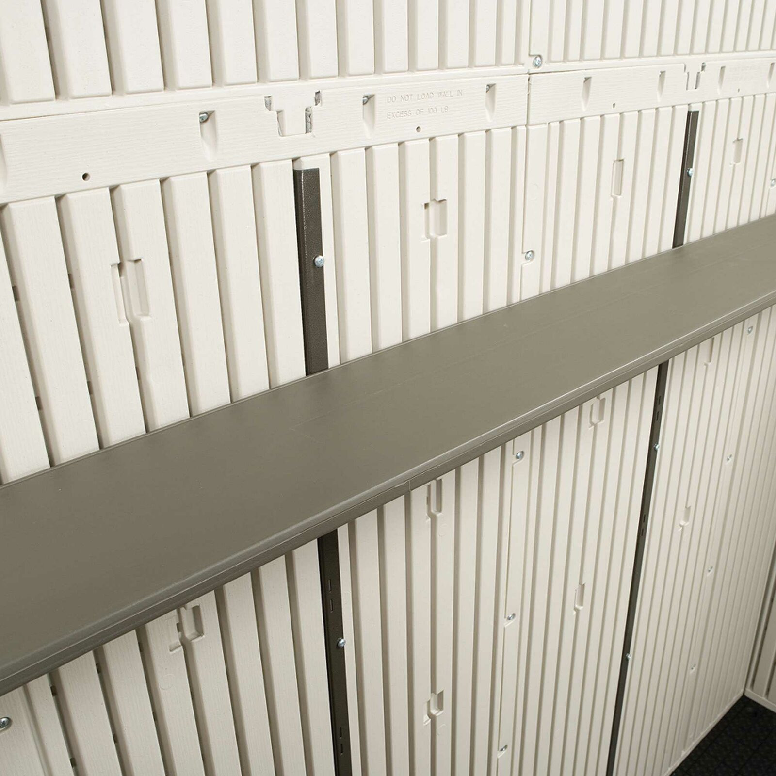 This 8 ft. W x 10 ft. D Plastic Storage Shed combine quality materials with innovative design, offering a convenient storage solution that maximizes storage potential. Combined with superior value and the ability to withstand nature's day-to-day abuse. Double-wall, steel-reinforced construction and steel roof trusses make the sheds structurally sound, so they won't buckle during storms or dent during everyday use.