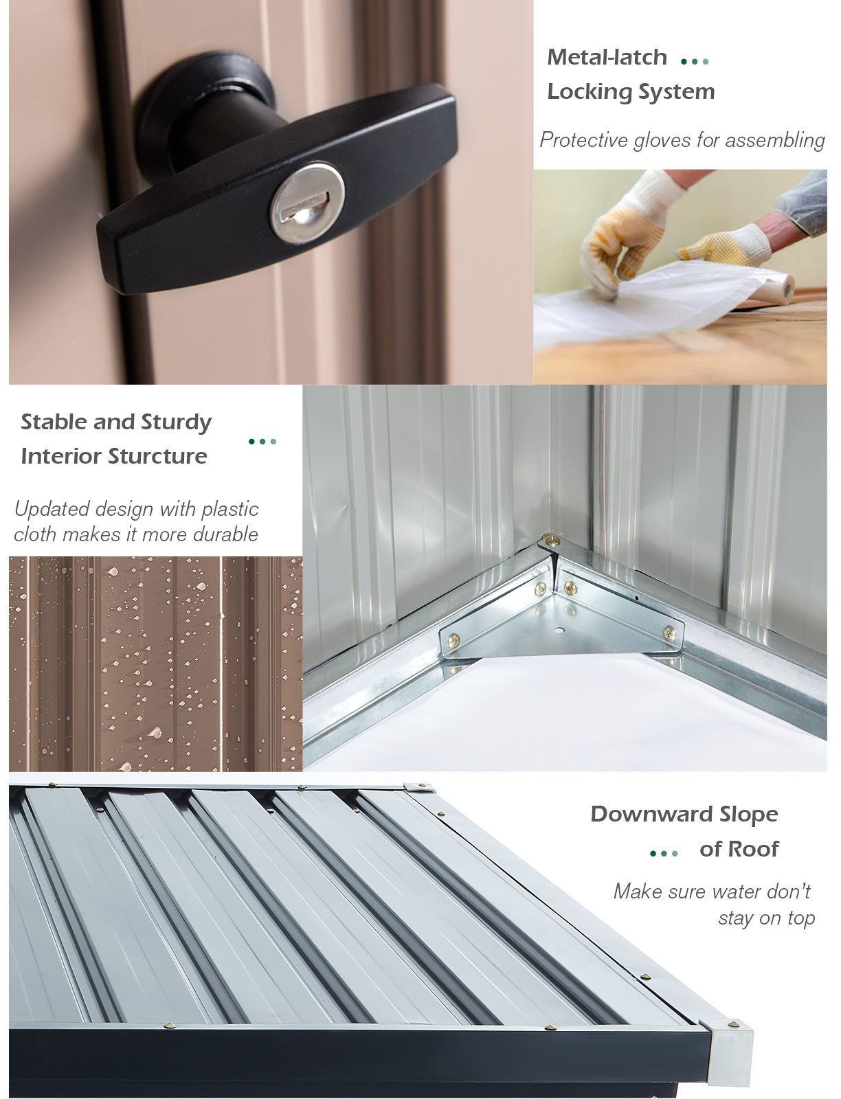 - Durable: Utility Shed with the design of a Durable structure, using panels of thickened galvanized steel for better reinforcement, functional tool shed under all kinds of weather conditions. Metal Locking system with keys makes it a safer shed for storage and tools keeping.