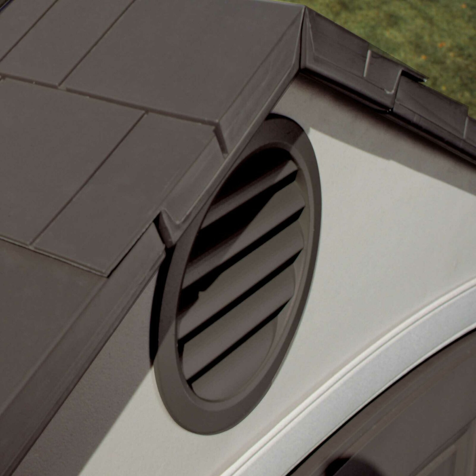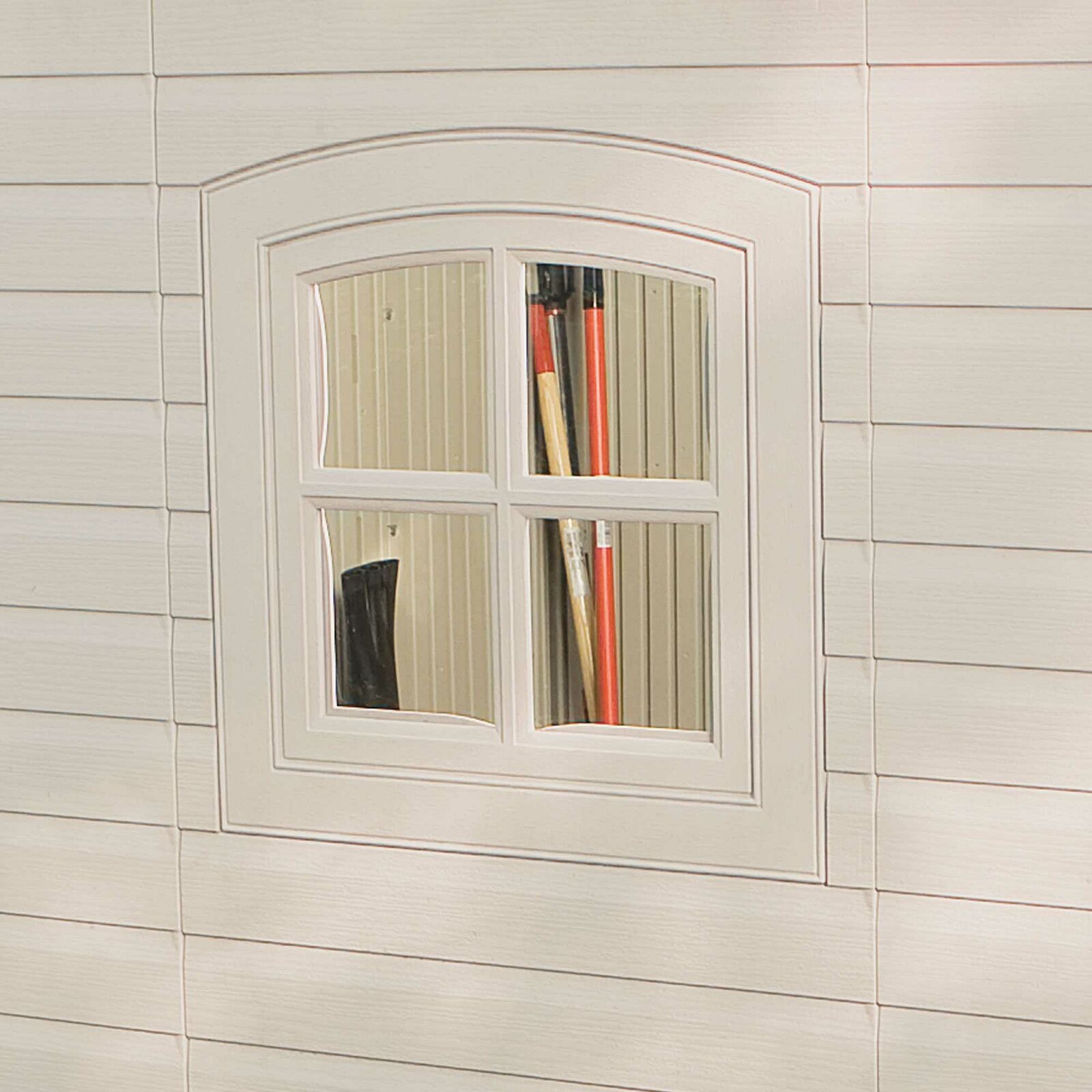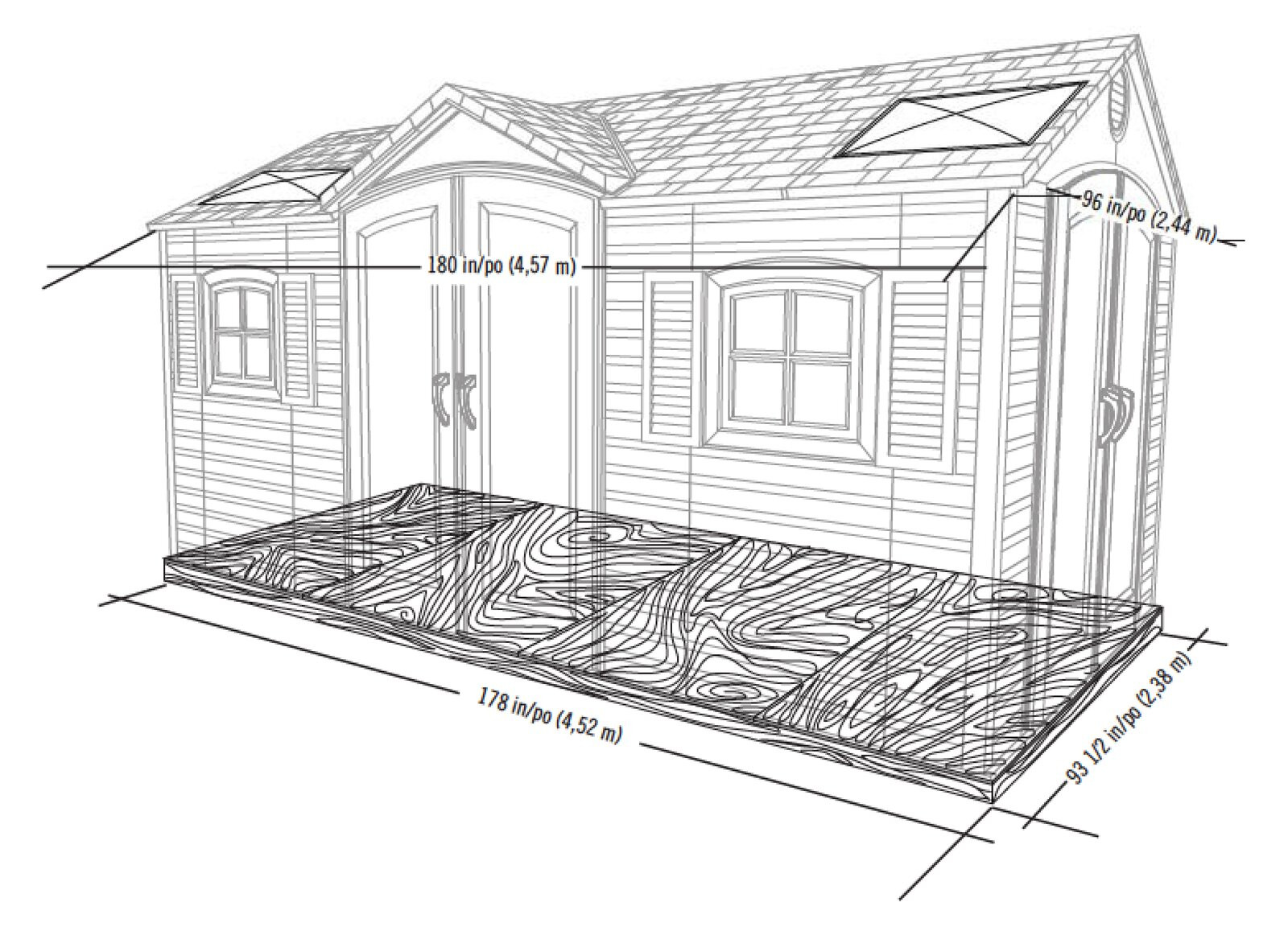 The Dual Entry 14 ft. 7.5 in. W x 7 ft. 8.7 in. D Plastic Storage Shed provides the perfect storage space for all your tools. This Dual Entry is the perfect addition to your outdoor space and keeps your tools well-organized. The Dual Entry 14 ft. 7.5 in. W x 7 ft. 8.7 in. DD Plastic Storage Shed by Lifetime is constructed from steel, HDPE Polyethylene plastic that offers years of reliable use. The gable roof lends a traditional style to the garden shed. The desert tan and dark brown finish of the tool shed lends a classic look to it and enhances its overall appearance. It includes two polycarbonate windows with shutters, double doors, two shelves, four corner shelves, two peg strips with tool hooks. The screened vents provide airflow and keep the shed pest free. The high-density and slip-resistant plastic floor provide excellent stability and easier access to tools. It is water and weather resistant that makes it endure most weather conditions. The storage shed is easy and quick to assemble. It is easy to care for and can be wiped with a dry or wet cloth to keep clean. This storage shed is manufactured in the United States.