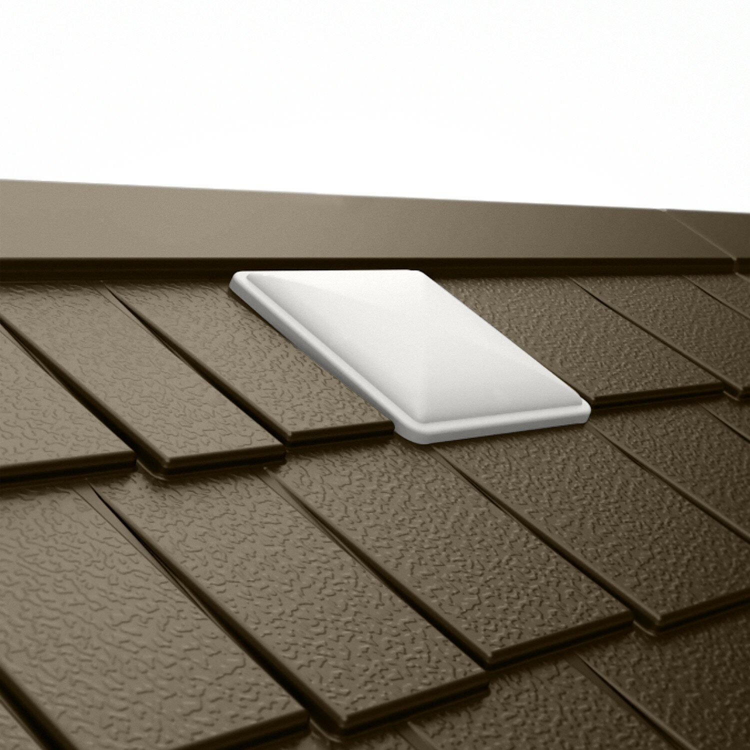 • Classic shed design with architectural details and metal-reinforced shingle-style roof panels