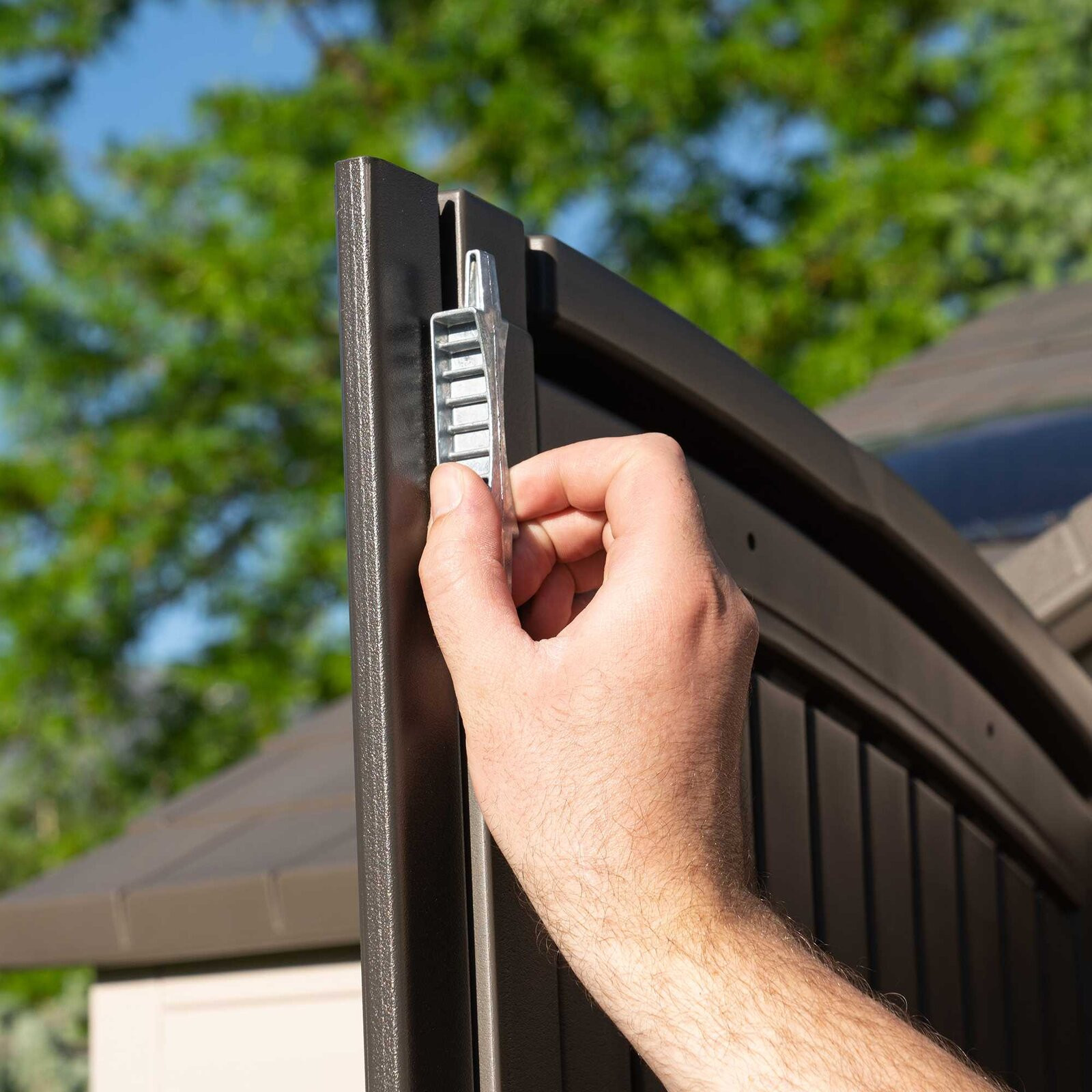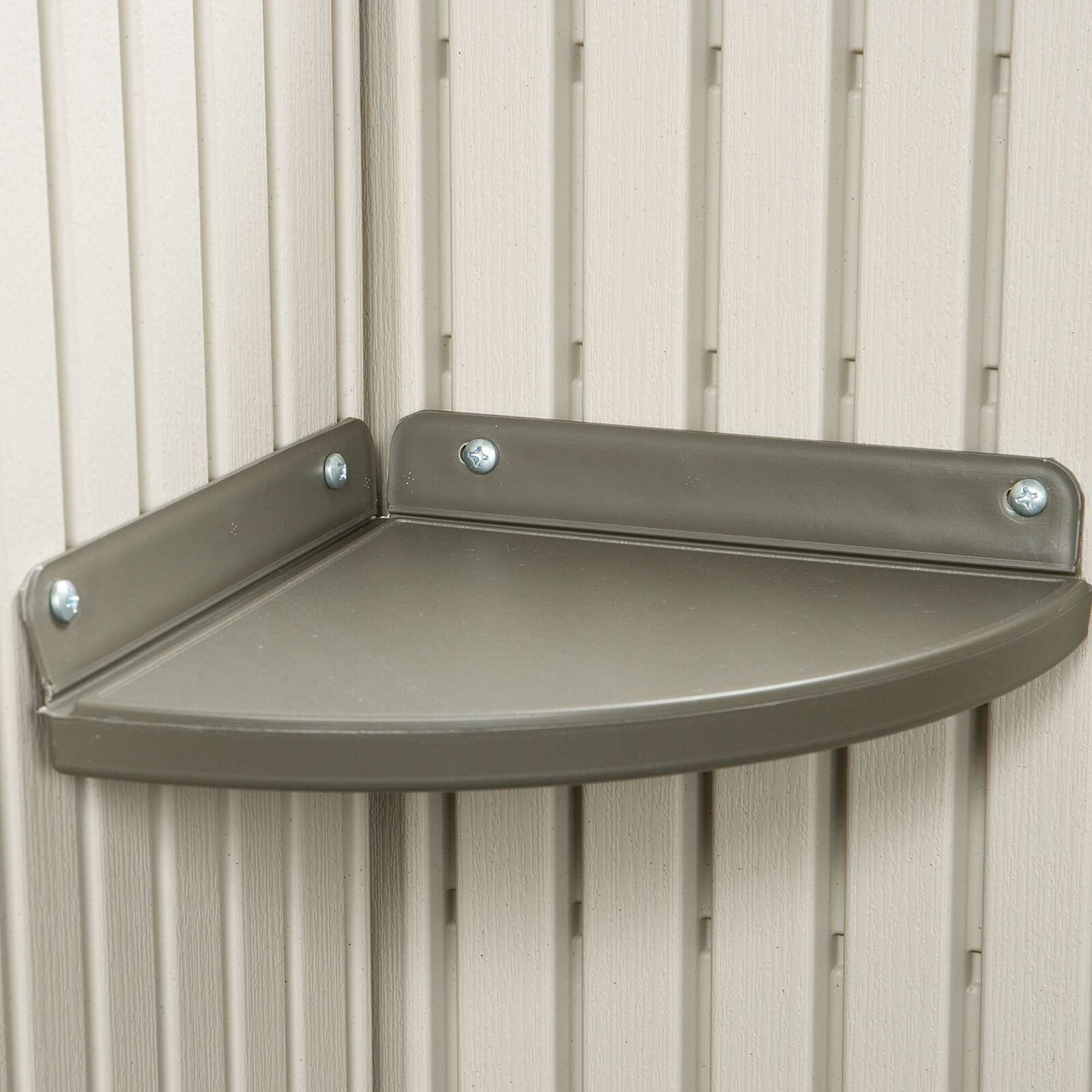 This Side 10 ft. W x 8 ft. D Steel-Reinforced Polyethylene Storage Shed will provide the perfect storage space for all your tools. It is the perfect addition to your outdoor space and it will keep your tools well-organized. It is constructed from steel and double-wall Steel-Reinforced Polyethylene that offers years of reliable use. The gable roof lends a traditional style to the garden shed. The desert tan and dark brown finish of the tool shed brings a classic look to it and it also enhances its overall appearance. It includes four small skylights, two large skylights, and two corner shelves. The screened vents will provide airflow and keep the shed pest free. Its rear window can be kept open for extra ventilation. The two shatterproof poly-carbonate sides will allow light and air to come in the shed and maintain a fresh ambiance. The high-density and slip-resistant plastic floor will provide excellent stability and your tools will be easier to access.