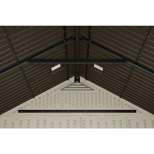 Upgrade your outdoor storage and organization with the Suncast Vista Storage Shed. The multi-wall resin panels are engineered for strength and durability, while the architectural details and metal-reinforced shingle-style roof panels provide a classic shed design. This unique shed features the innovative IllumiVent system from Suncast which not only helps provide air circulation to reduce humidity and air temperature, but also naturally lights the interior while you work. Sturdy double doors with metal hinges allow you to access your items easily, and is pad-lockable using the metal hasp to keep your contents safe and secure (lock not included). Assembly is easy and requires minimal tools and the shed is simple to clean and maintain. With 327 cu. ft. of storage, this roomy shed has plenty of space to accommodate all your gardening tools, bicycles, lawn mower and other outdoor equipment. Like all Suncast products, this shed is built for durability, and the all-weather construction provides water resistance and UV protection for up to 10 years. Foundation required but not included. Item measures 85.25 in. x 98 in. x 88 in. Suncast takes pride in helping customers enhance their indoor and outdoor spaces with quality products that are stylishly designed. You take pride in creating a beautiful environment. We take pride in keeping it that way.