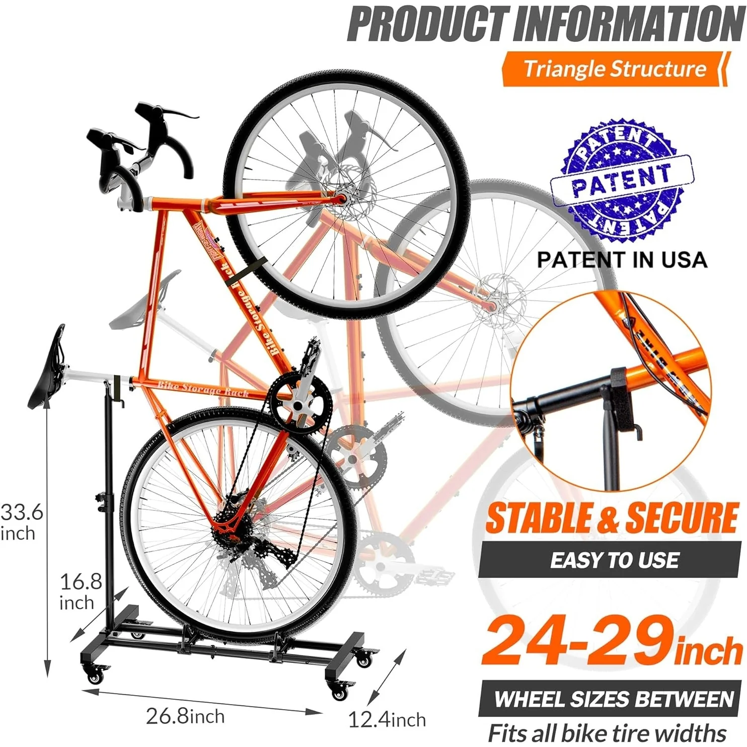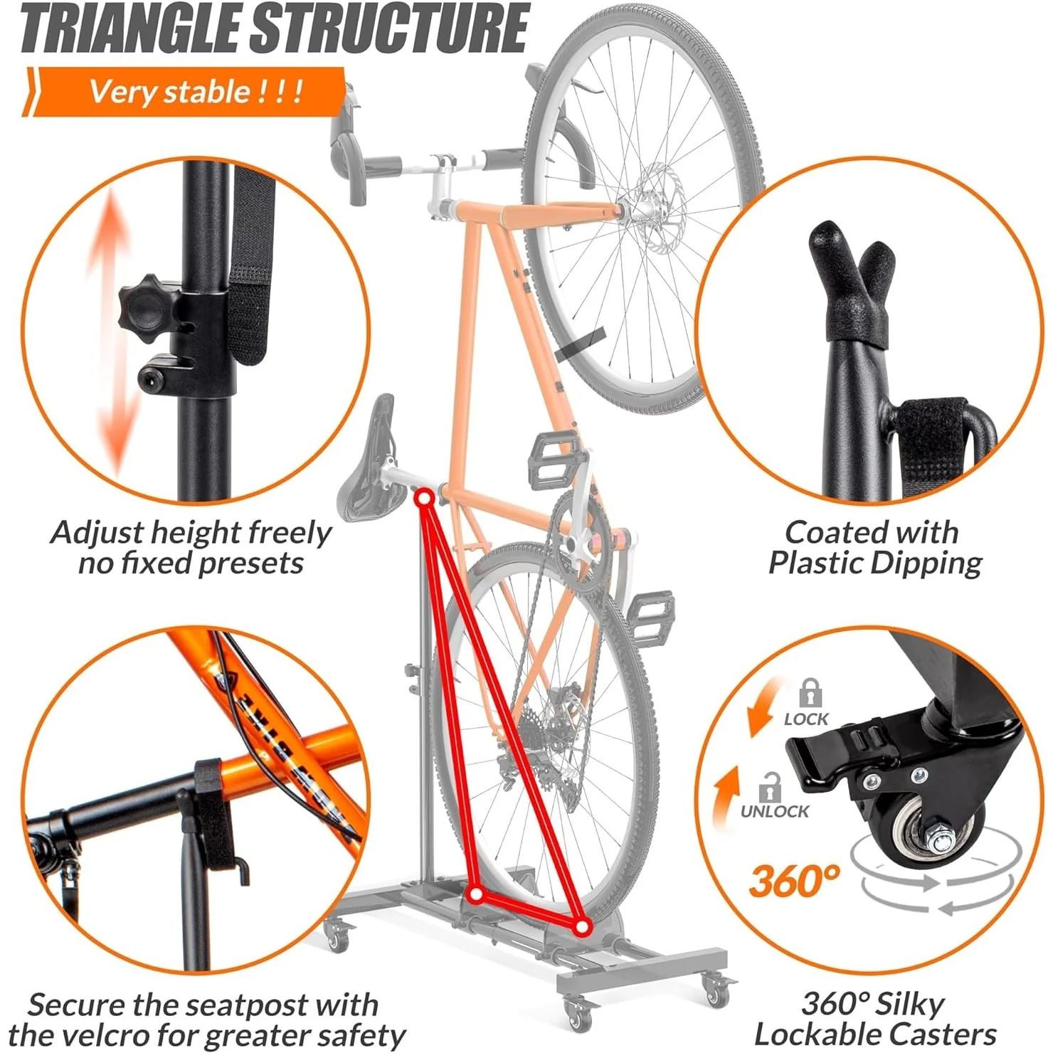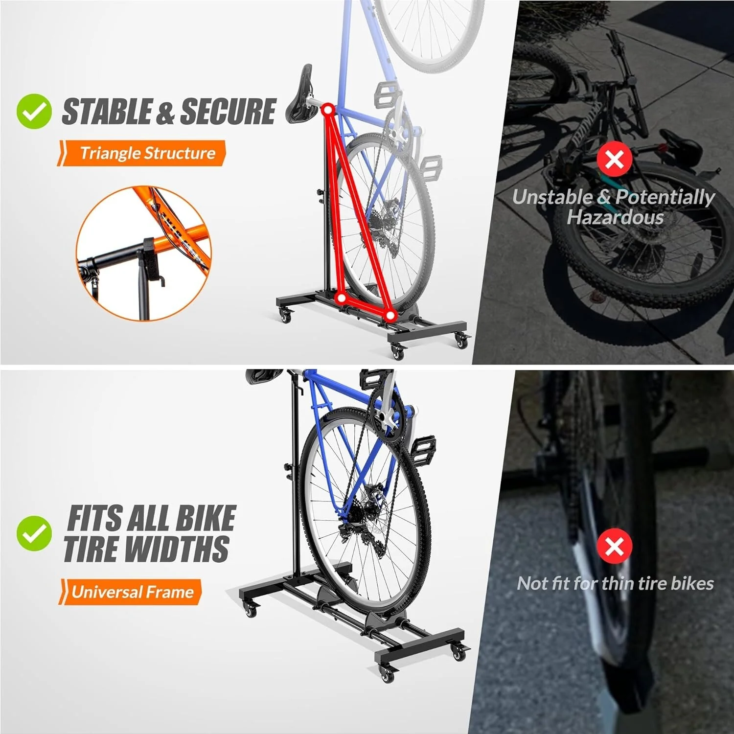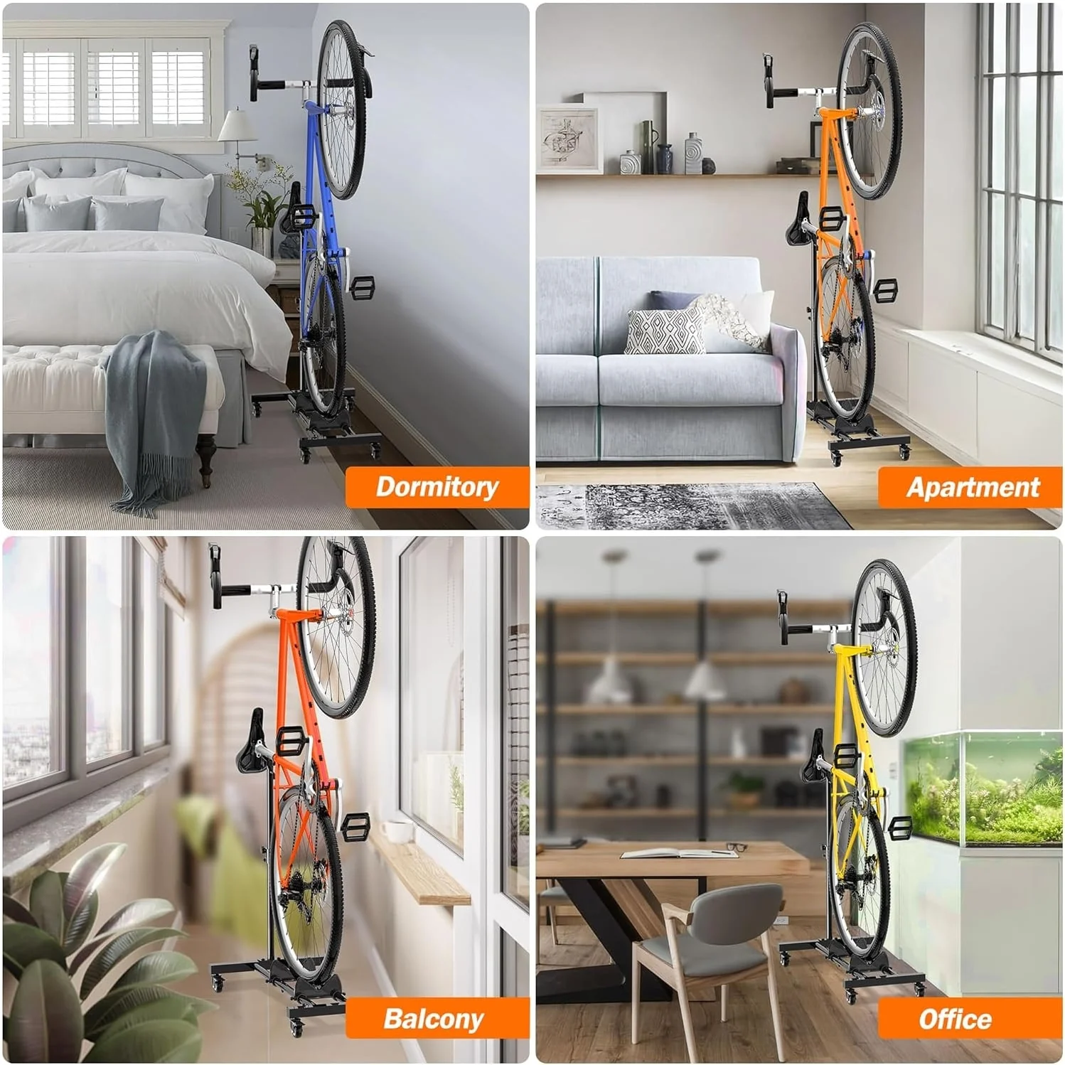- Rolling Wheels: The vertical bike stand features lockable 360-degree rolling wheels, allowing easy movement indoors and outdoors. Casters share weight for stability and prevent falls, ensuring bike safety.