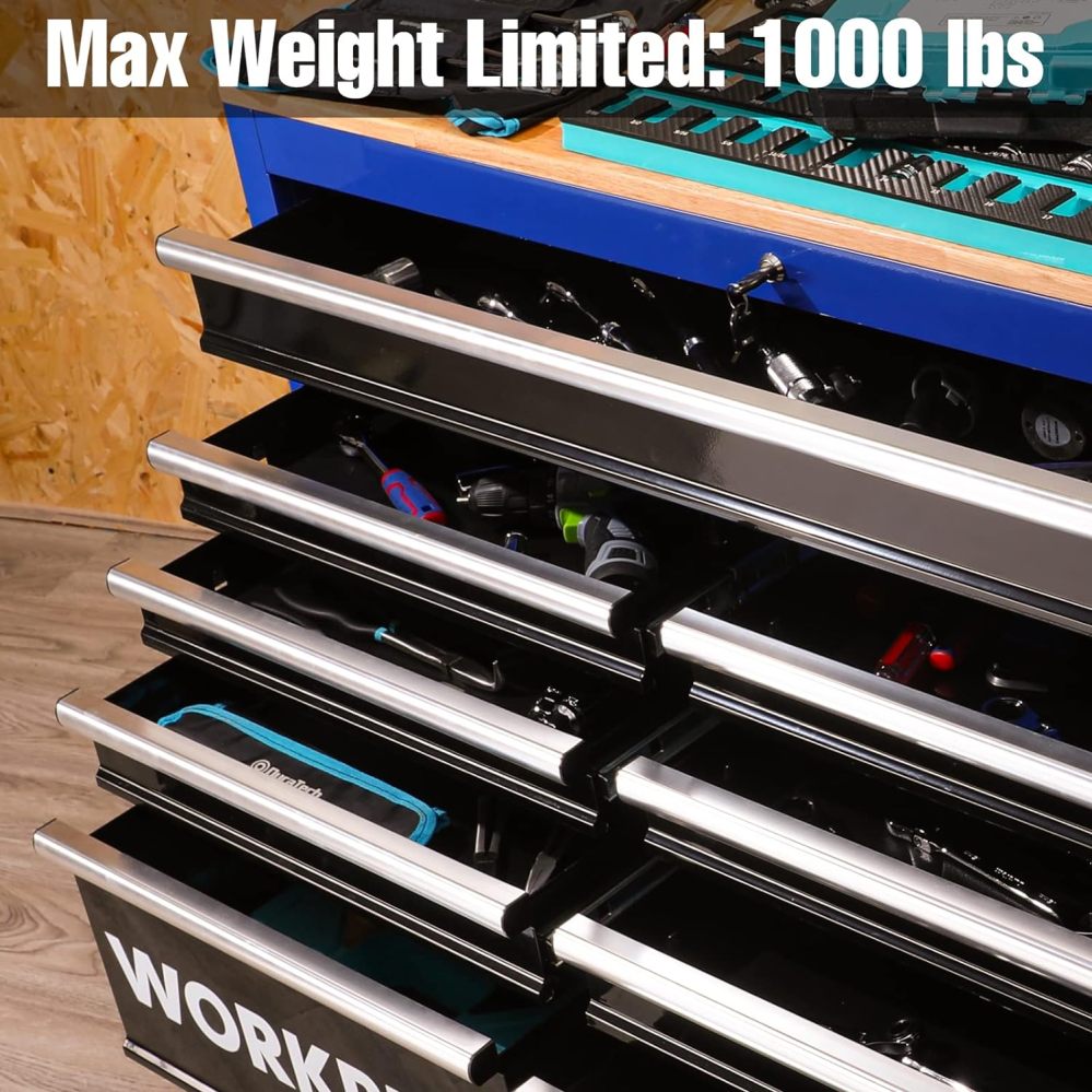 Up to 1200 lbs Load Capacity: Constructed with high-quality welded steel construction, anti-rust treatment and corrosion-resistant powder coat finish, featuring a solid-wood surface on top, this WORKPRO tool chest is a great garage tool chest or workbench that fits just as easily in the home shop of any DIYer, maker, or hobbyist. Maximum Load Bearing: 1200 lbs.