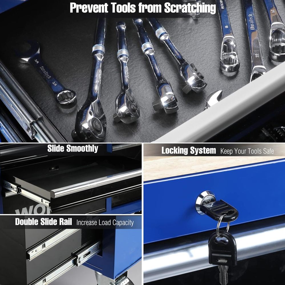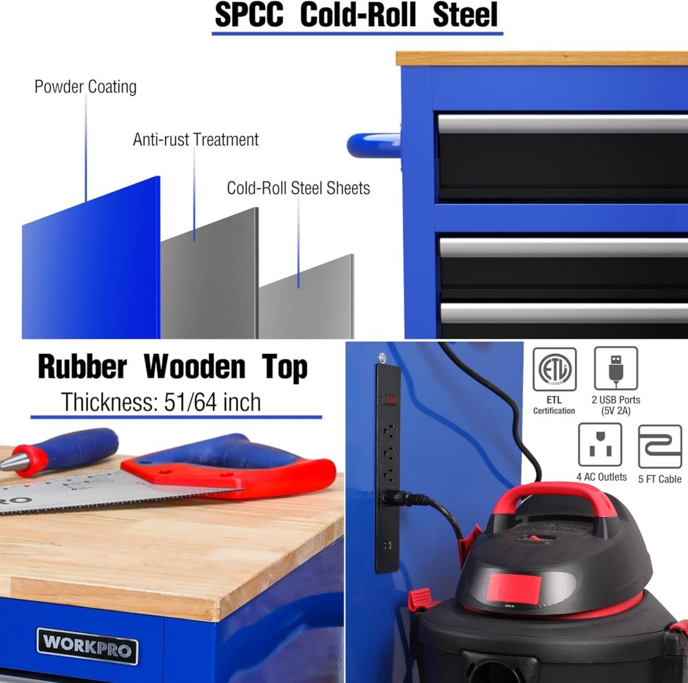 Practical Drawer & Power Strip: The high-quality ball-bearing slide can smooth operation and full-extension without a slam and noise. Cushioned non-slip drawer liners protect tools from bashing into one another and prevent scratches on tool chest drawers. Locking system can keep your tools safe. The tool chest comes with ETL certification power outlet. The outlet 4 AC outlets and 2 USB-A ports will supply you with power whenever you need to plug in any of your work equipment.